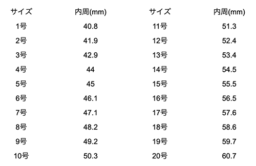 ご自身のサイズが分からないという方は、目安としてぜひご活用ください。当店オリジナルのジュエリーリングは以下のサイズ表を基準に作成しております。