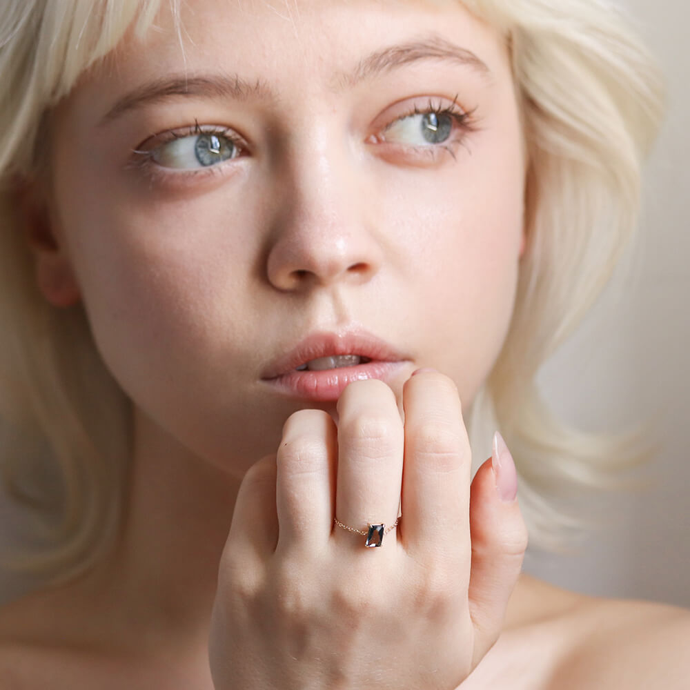 多面カットを施した、長方形のロンドンブルートパーズ。ロンドンの空の色、という名称を持つ、他の宝石にはない独特の青色が最大の魅力です。