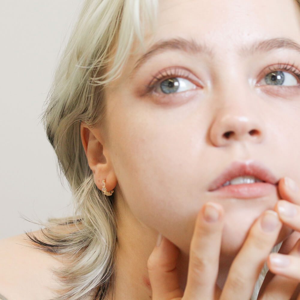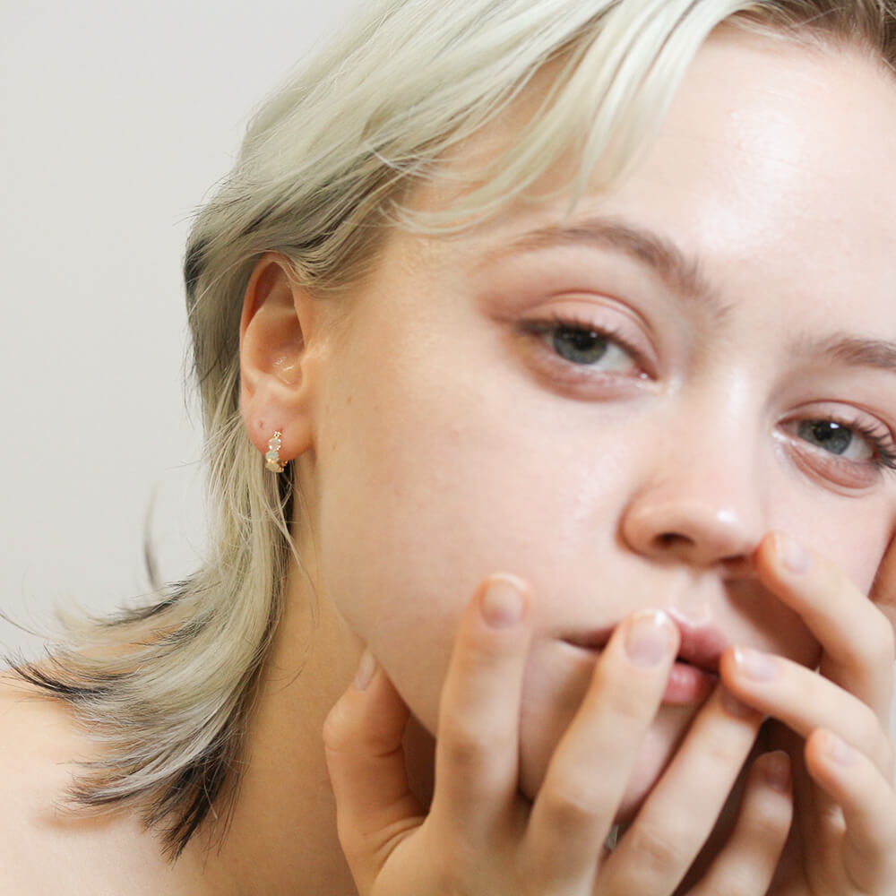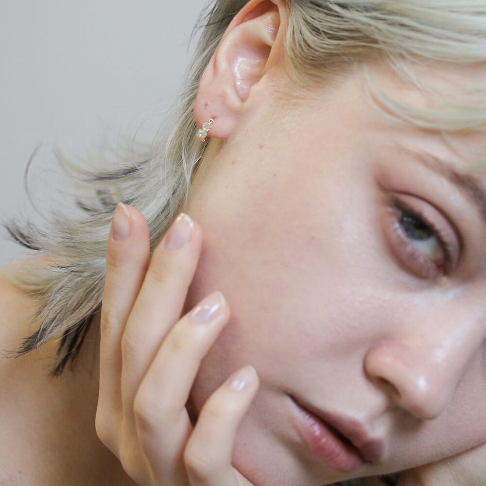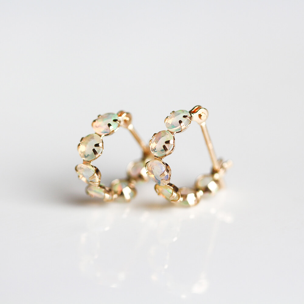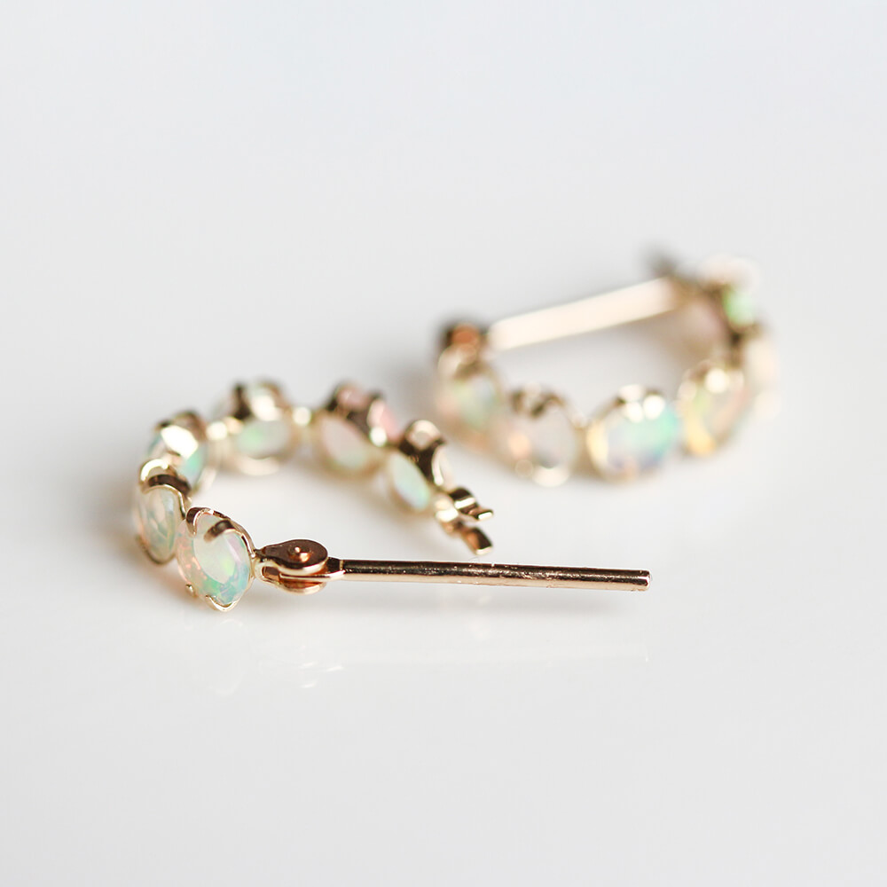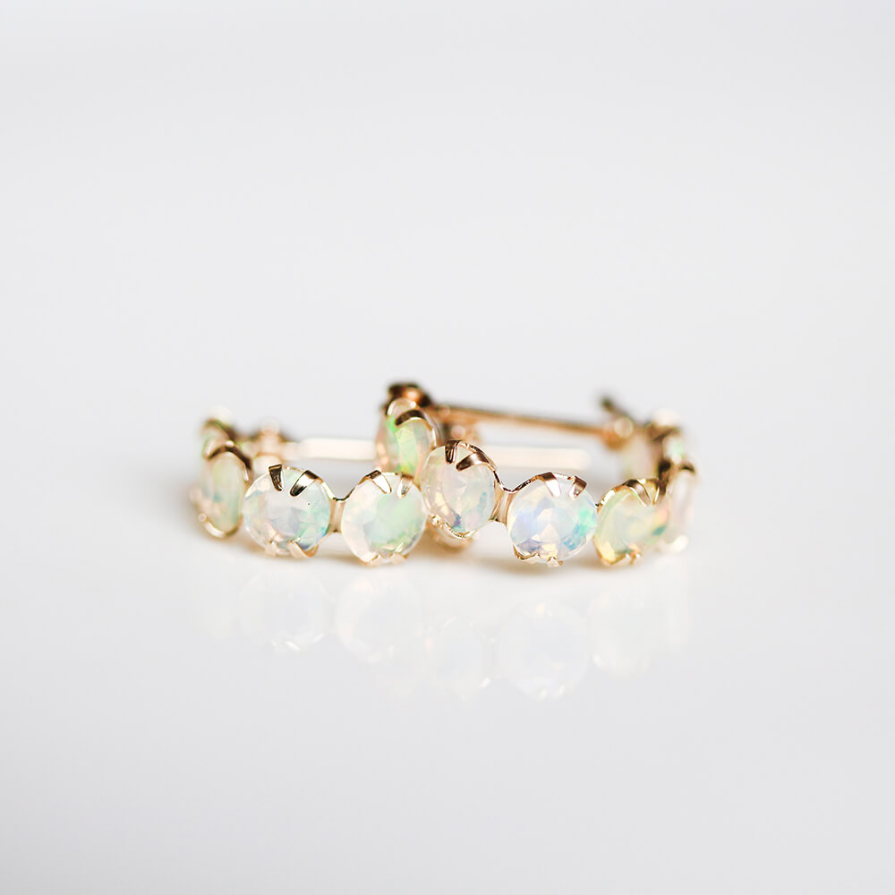 耳に沿う小振りなオパールのフープスナップピアスはオン・オフ問わず使えて便利です。