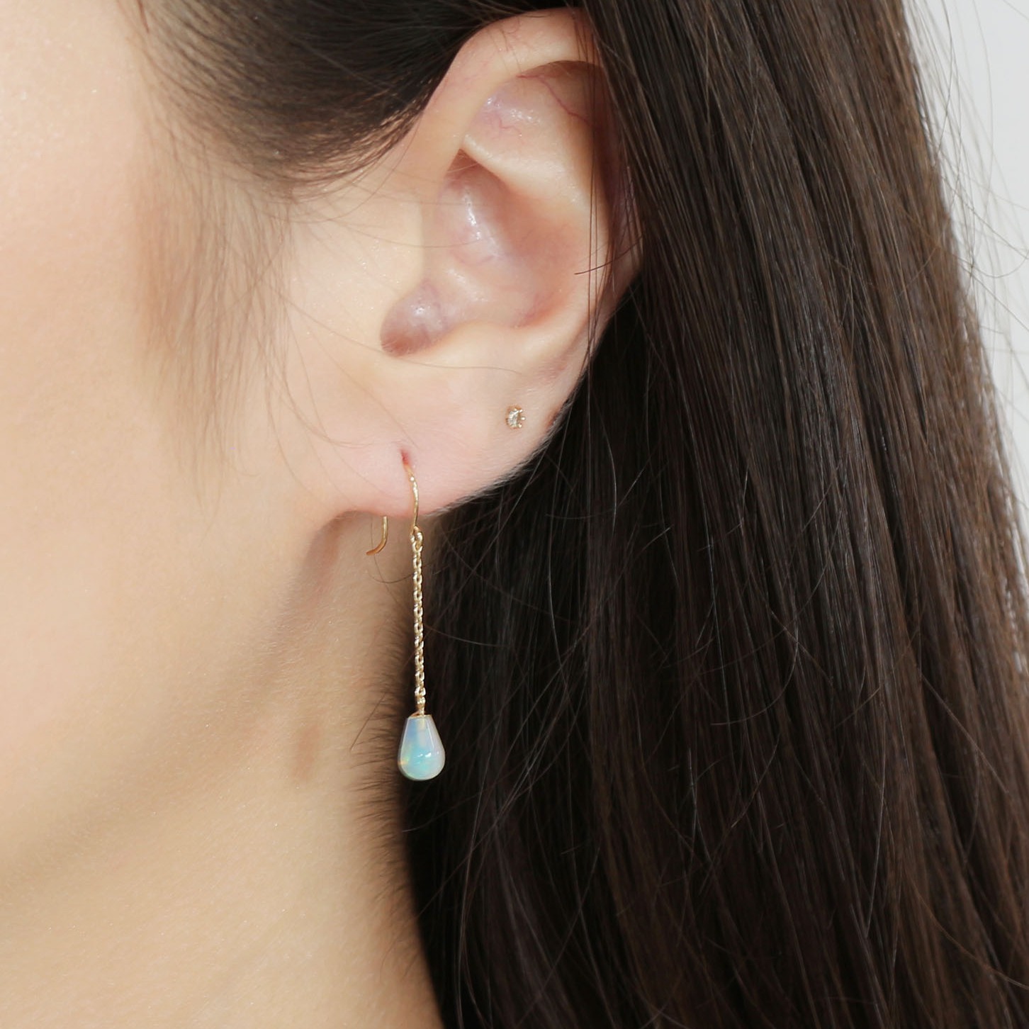 台座のない1点留めオパールピアスは、オパールの透き通る瑞々しい煌めきが全体から楽しめるデザインです。18金素材で程よいボリューム感があるので、ギフトにもおすすめです。