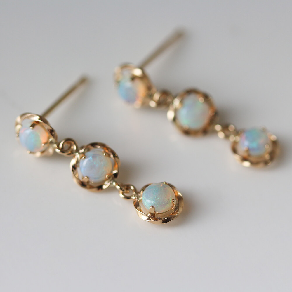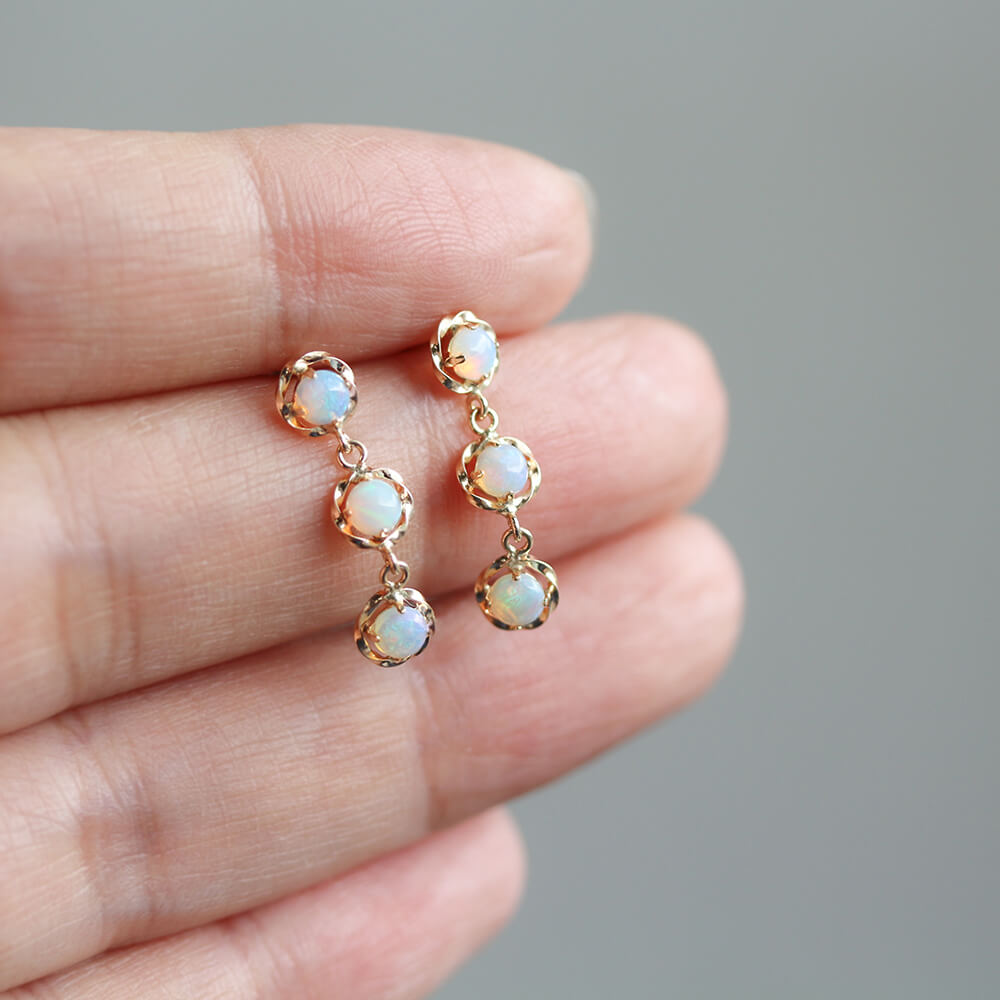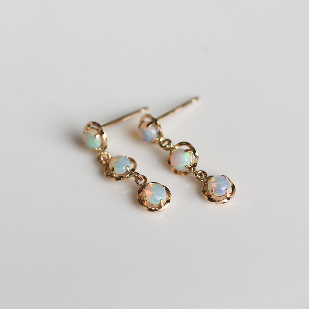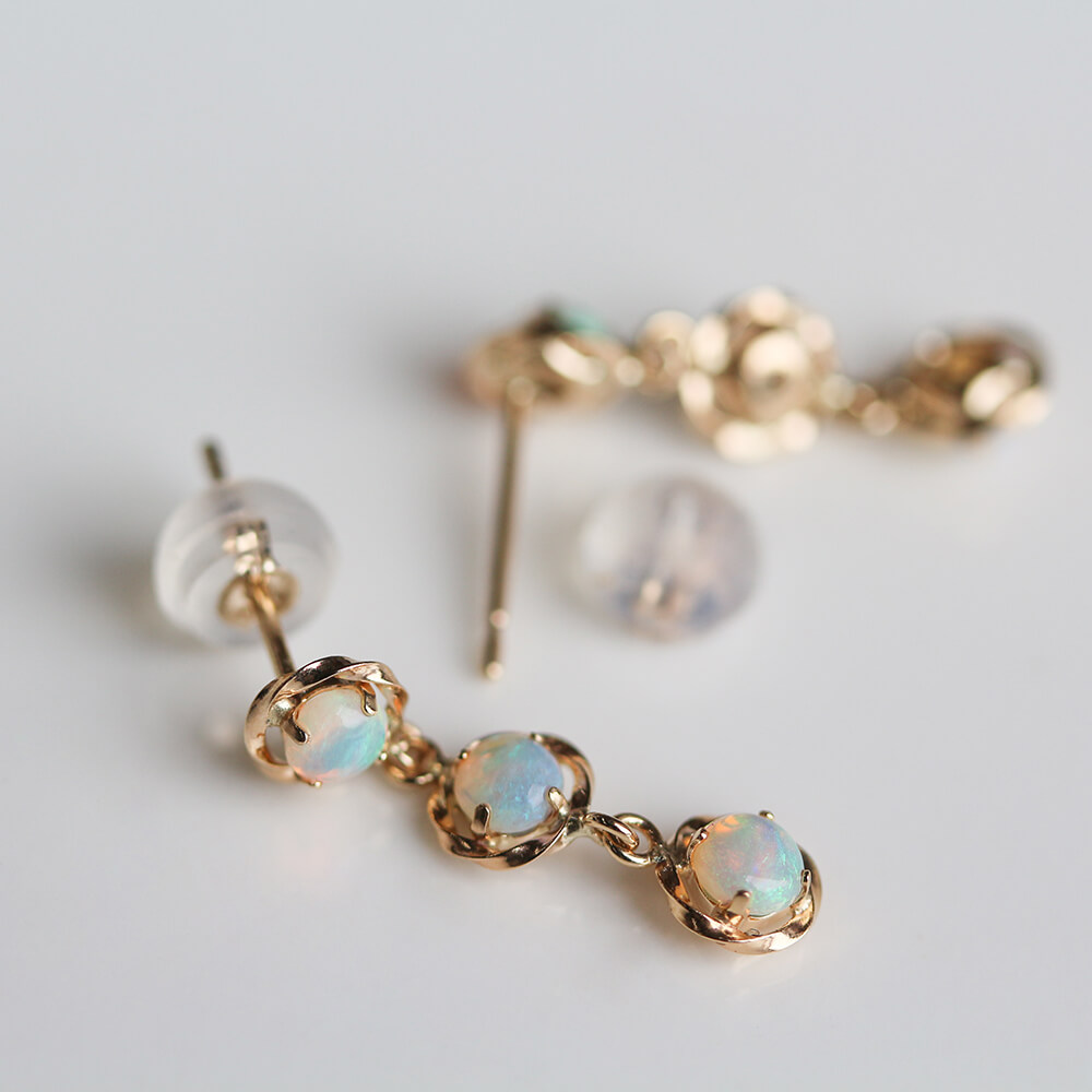 3つのオパールが連なった、小ぶりでありながら華やかなオパールピアス。