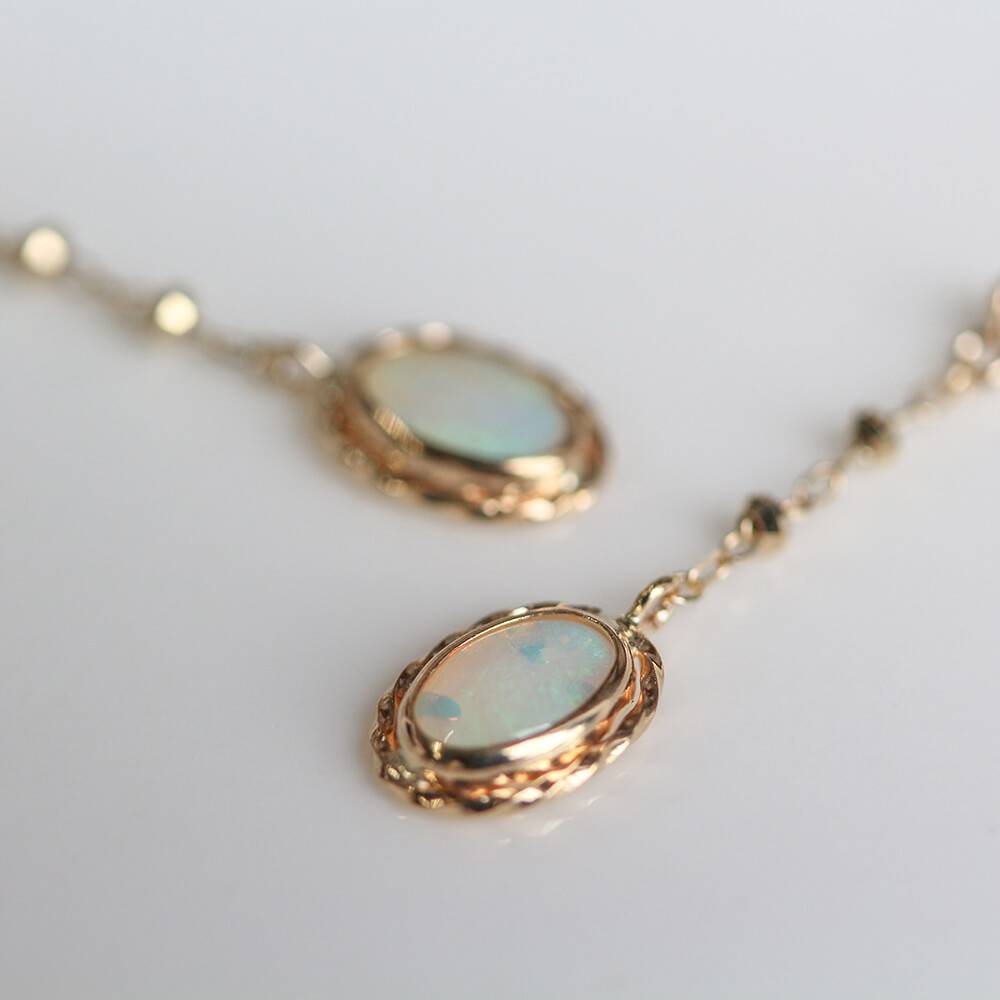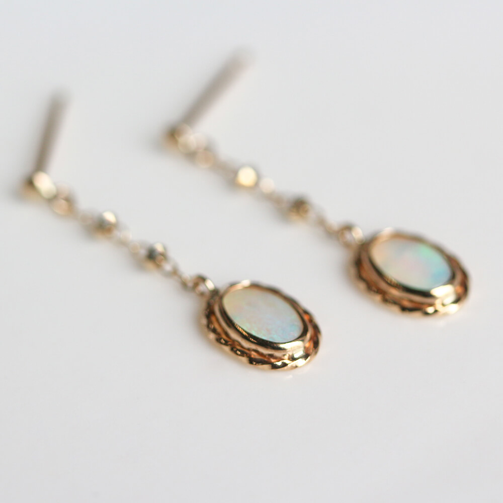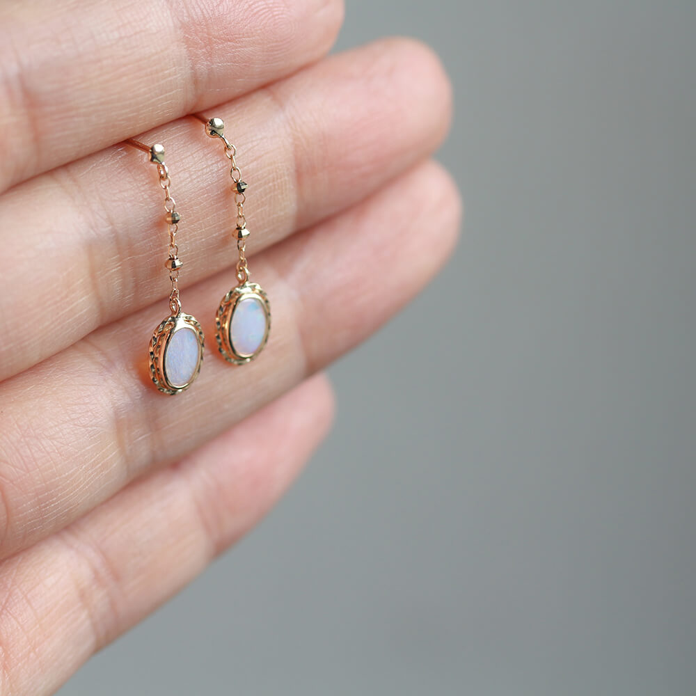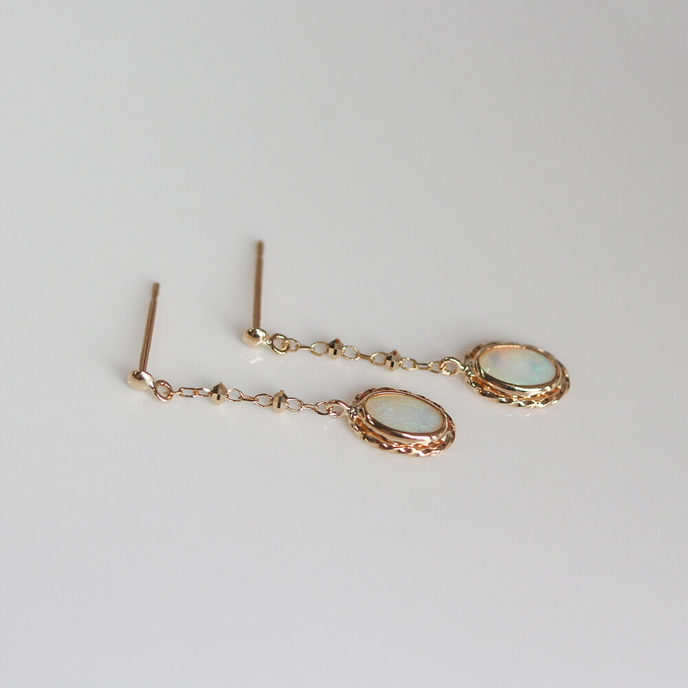 光の色や角度で表情を変えるオパールピアス。