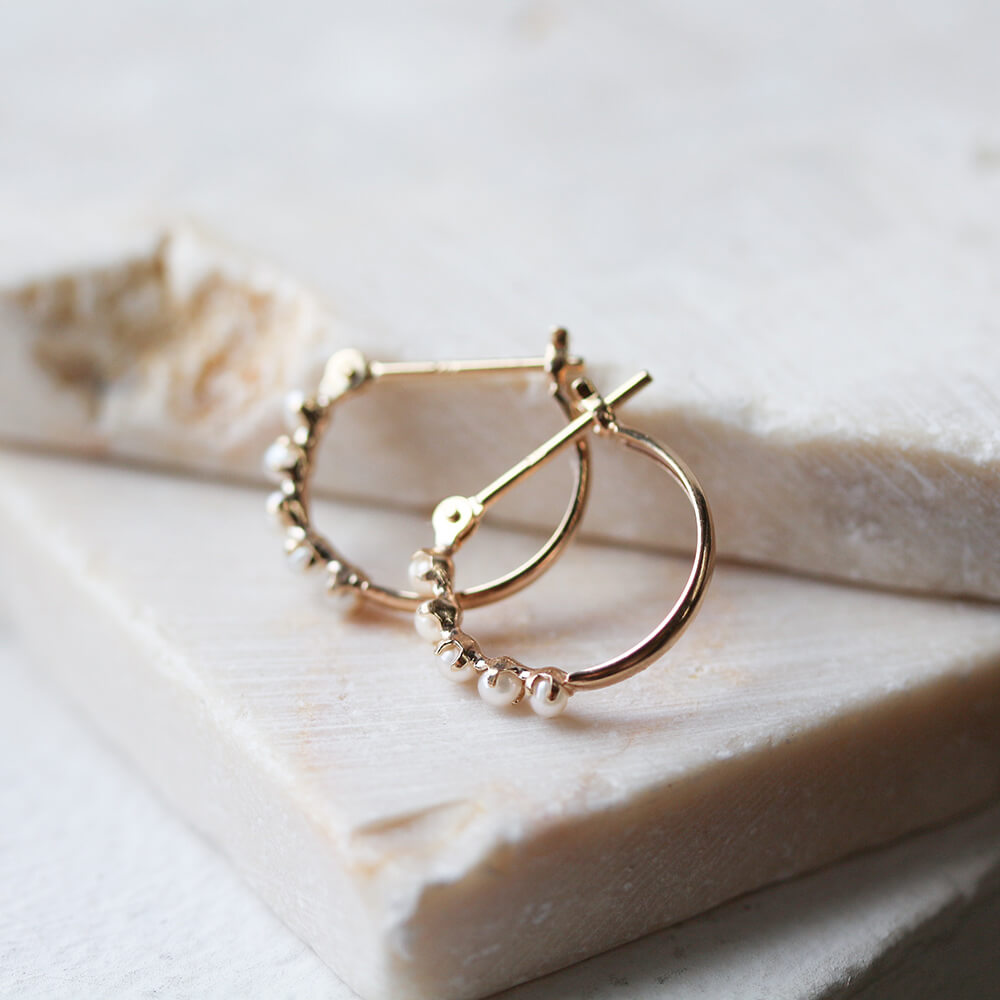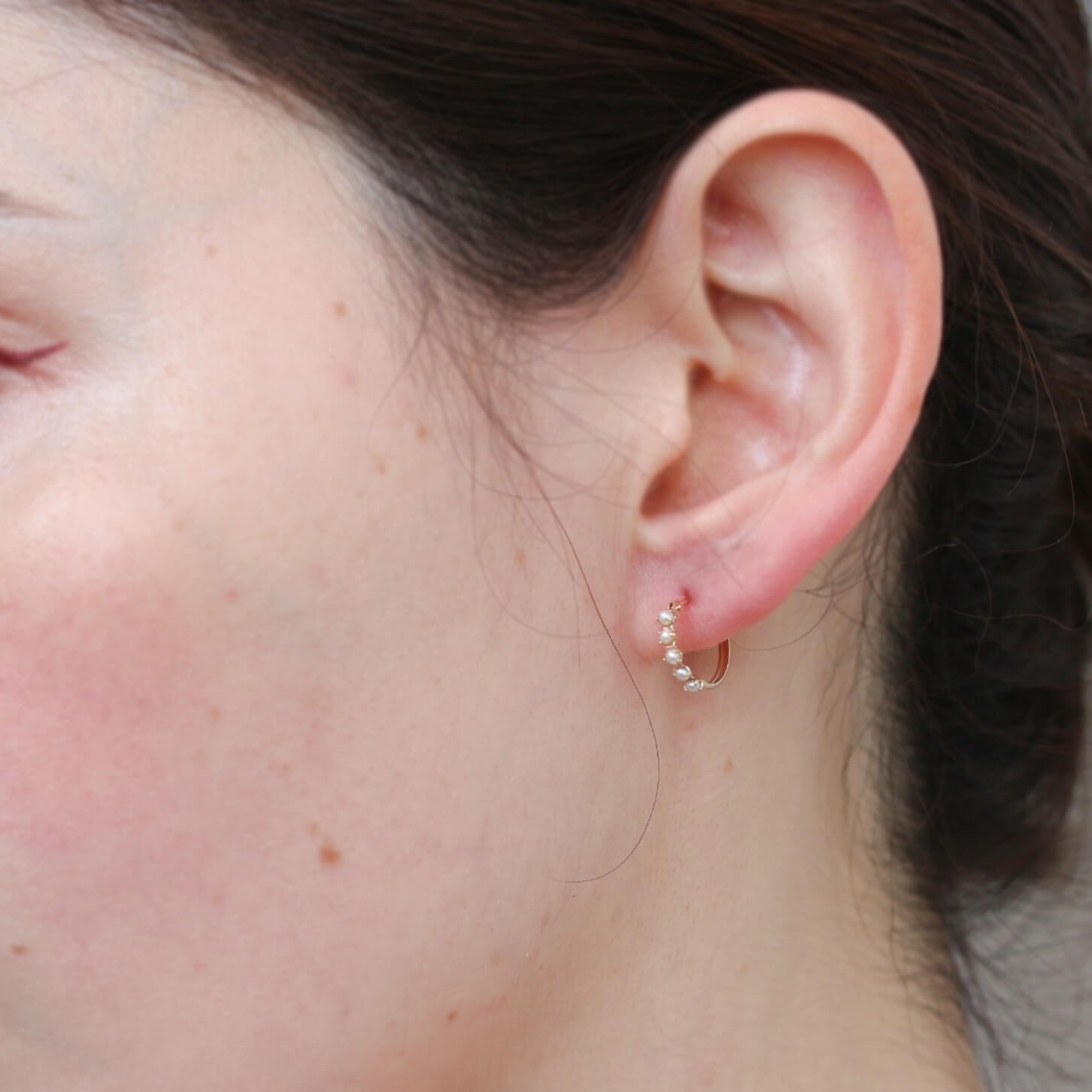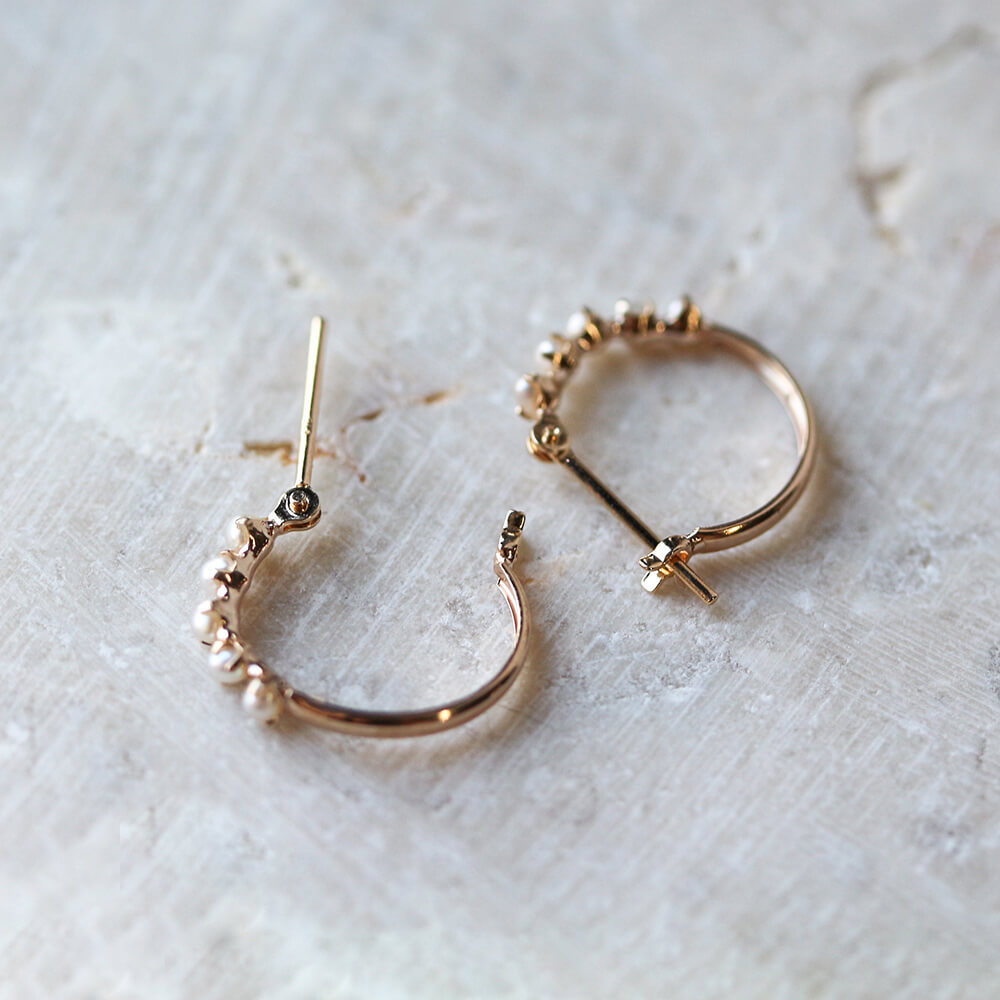 小さなベビーパールを連ねたフープピアス。シンプルで上品な仕上がりです。