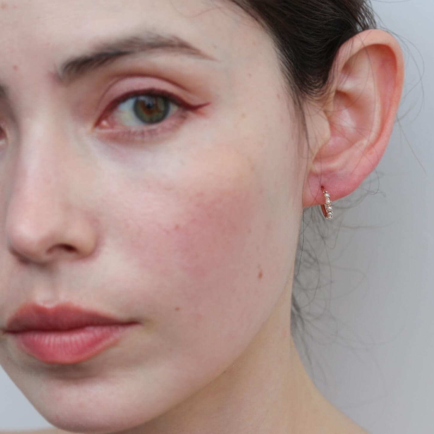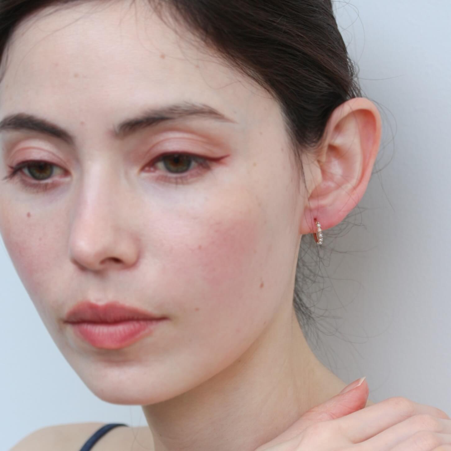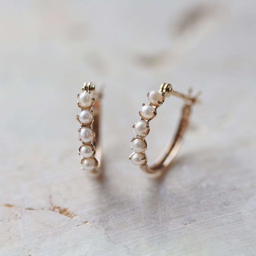 小さなベビーパールを連ねたフープピアス。シンプルで上品な仕上がりです。
