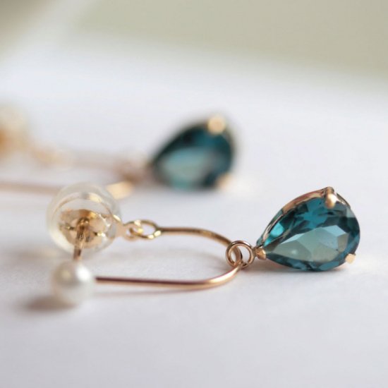ディープブルーのロンドンブルートパーズが美しく光るユニークなピアス。