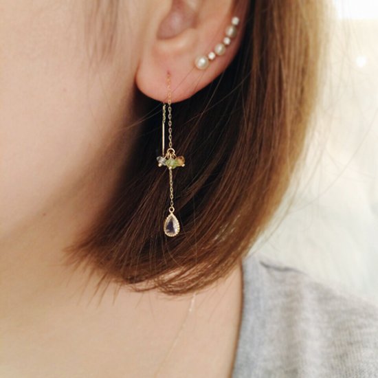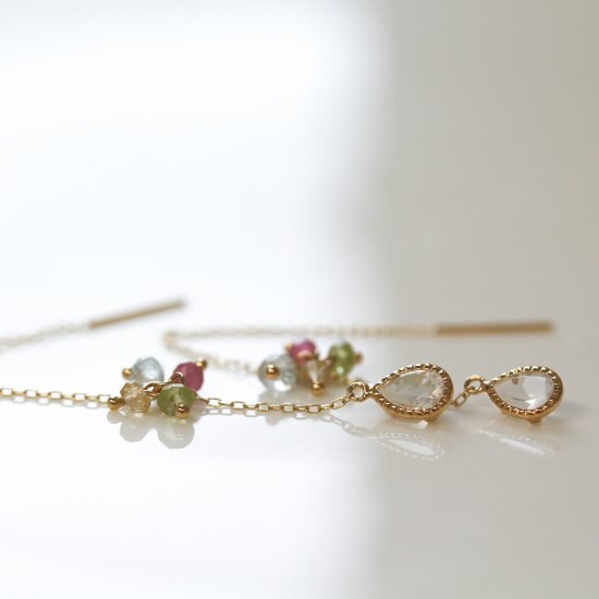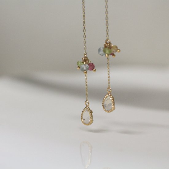 淡い色合いの天然石と、K10のさわやかなイエローゴールドがマッチしていて、耳元を女性らしい、優しい印象にしてくれます。