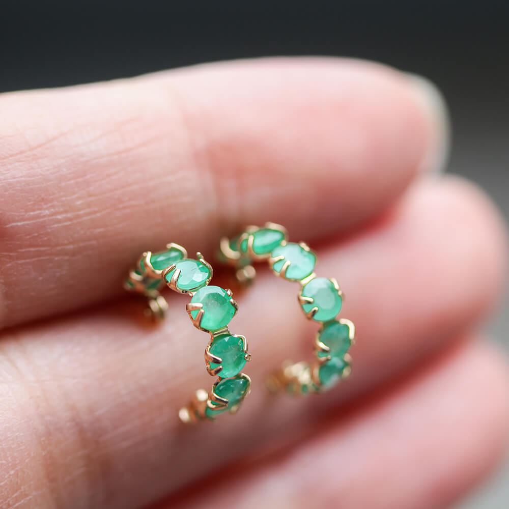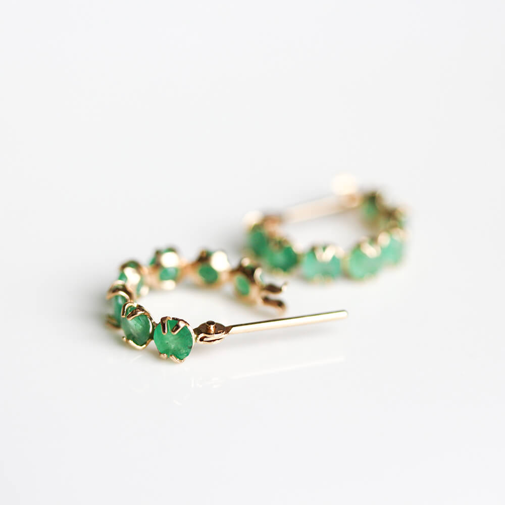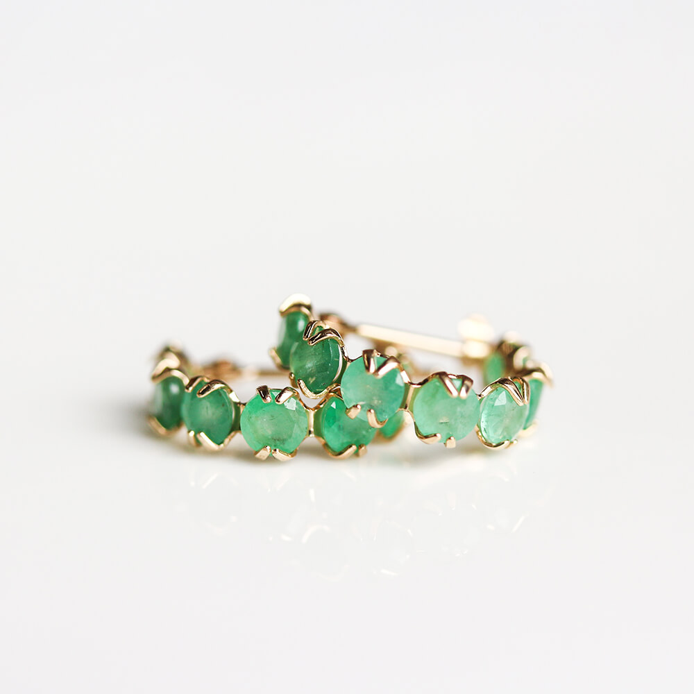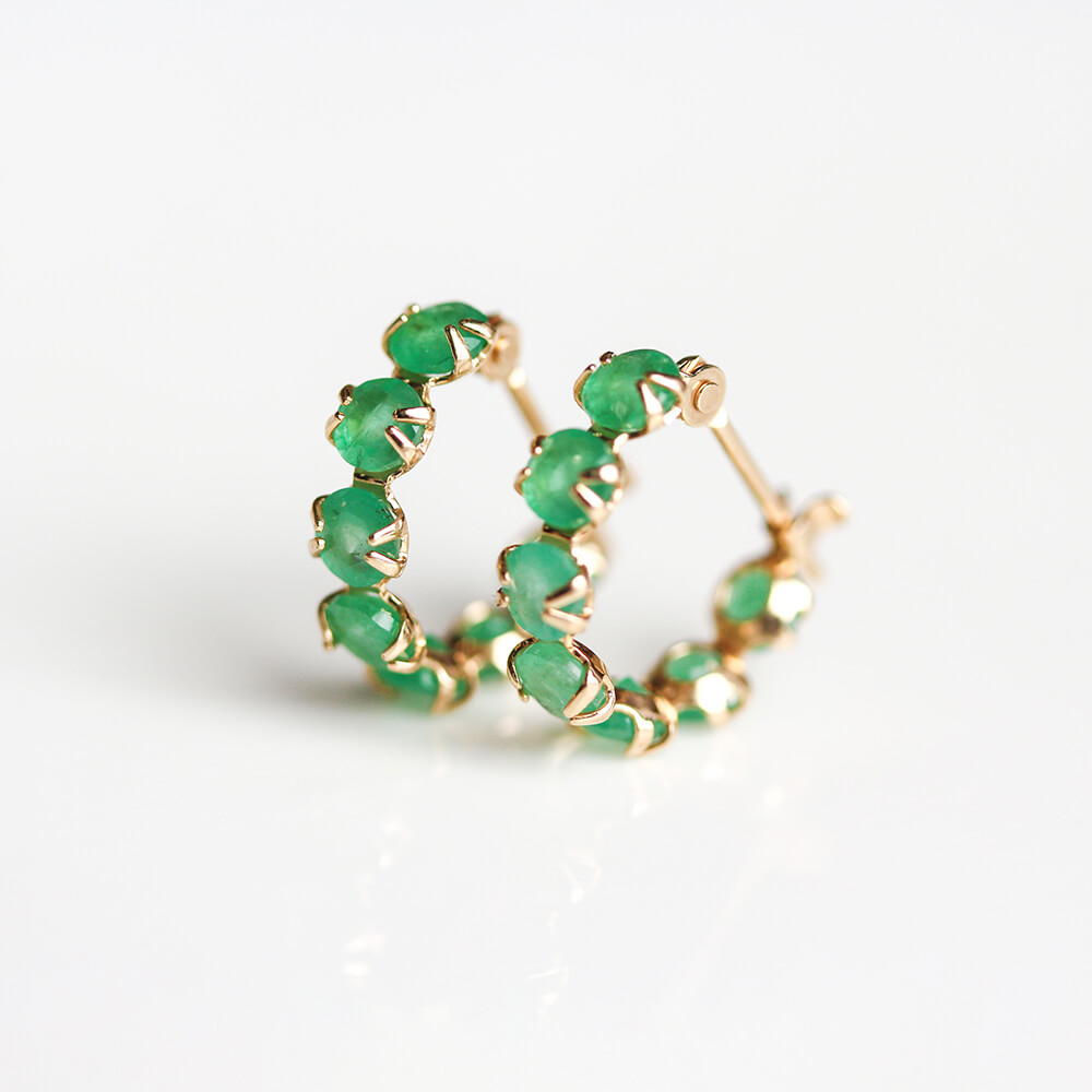 7石のエメラルドの澄んだ、鮮やかな輝きが目を惹きつけるフープピアス。
