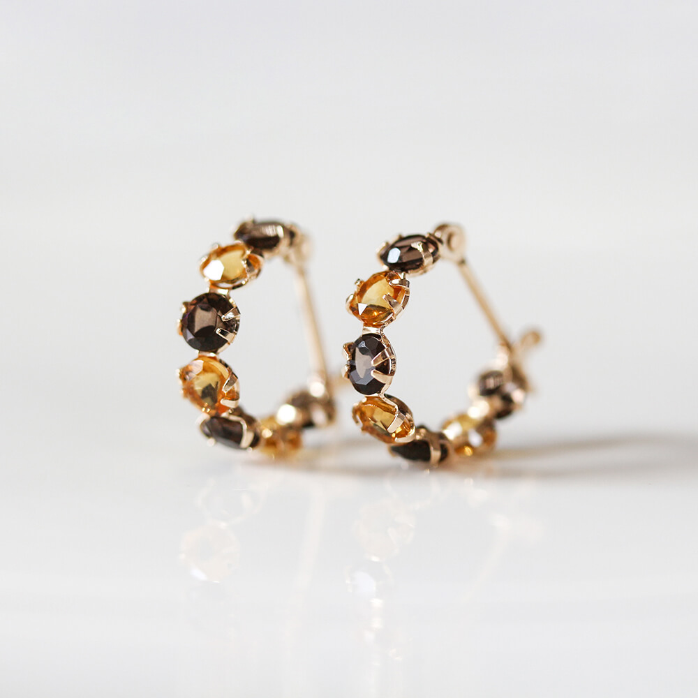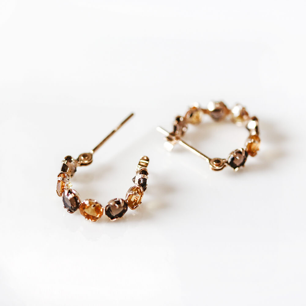シトリンとスモーキークォーツ、2色のコントラストが華やかなフープピアス。