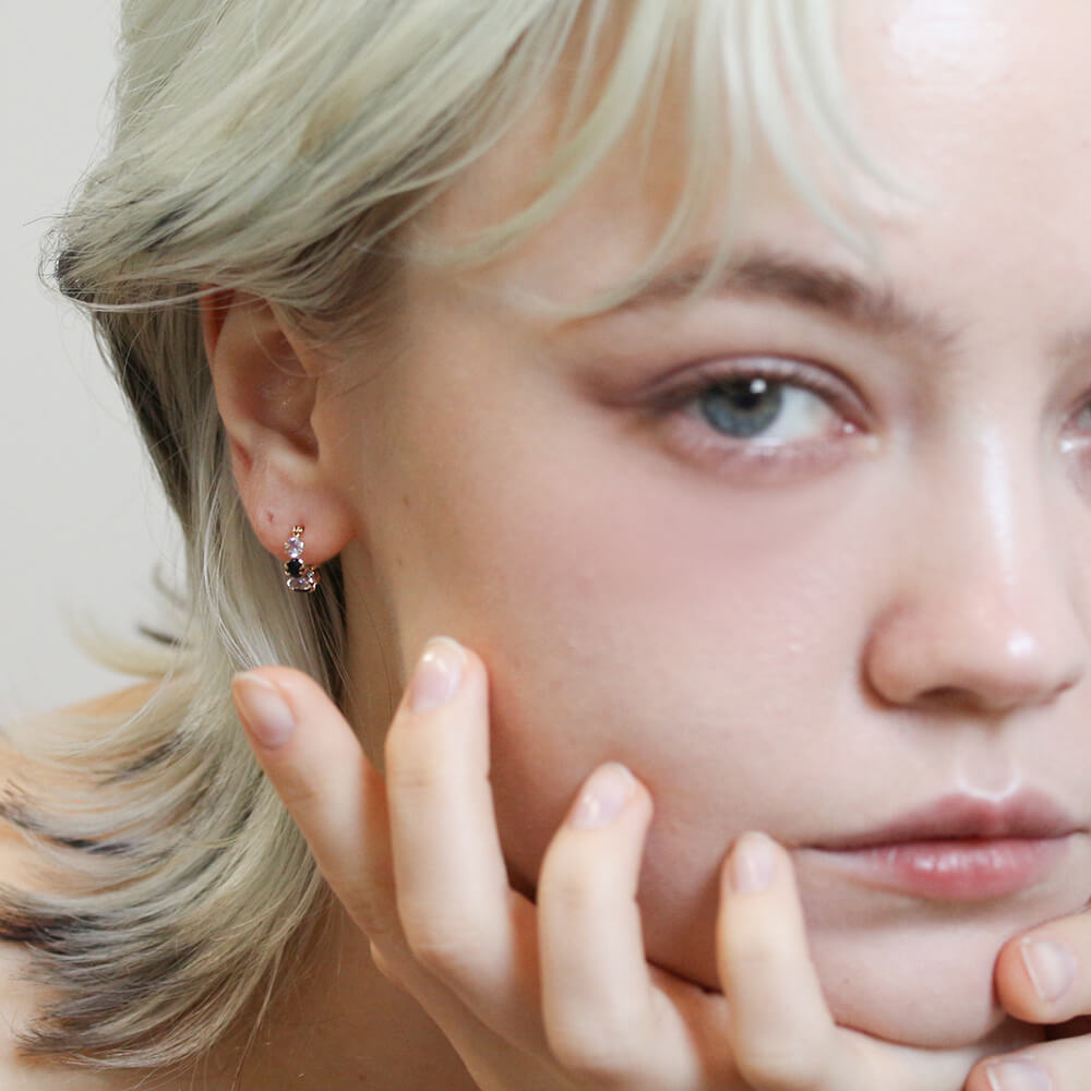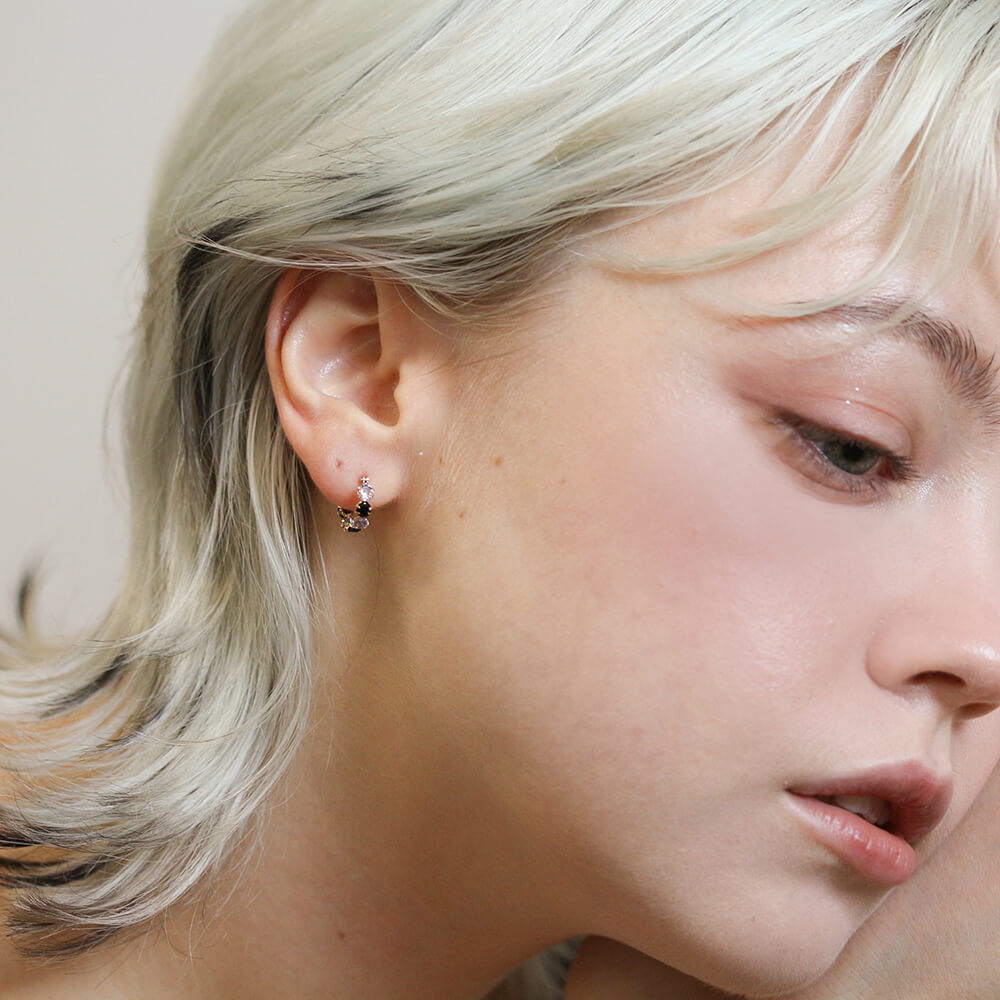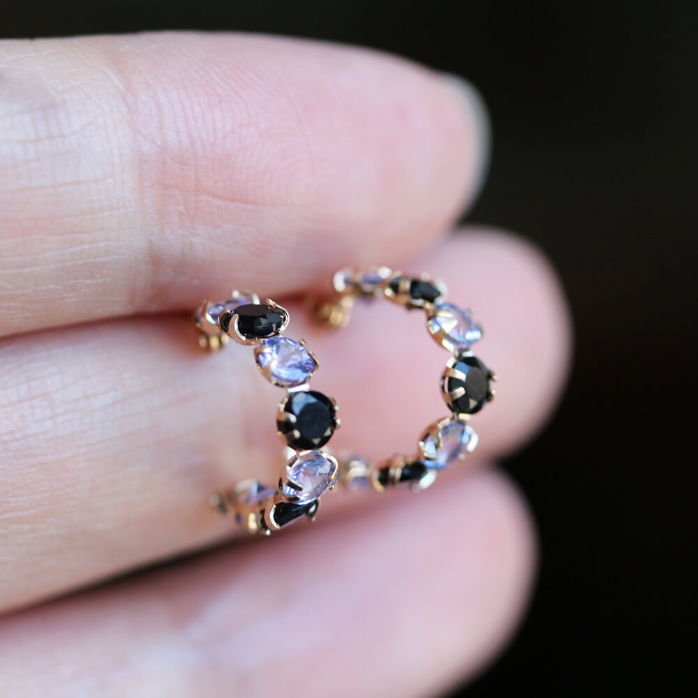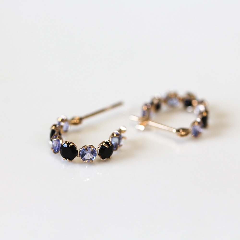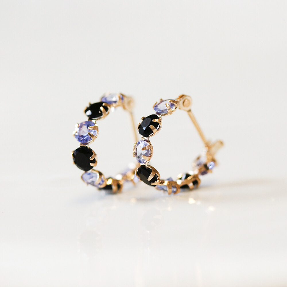 オニキスとタンザナイト、2色のコントラストが華やかなフープピアス。フープをぐるりと囲ったストーンは、様々な角度から光を取り入れることでより美しく輝きます。