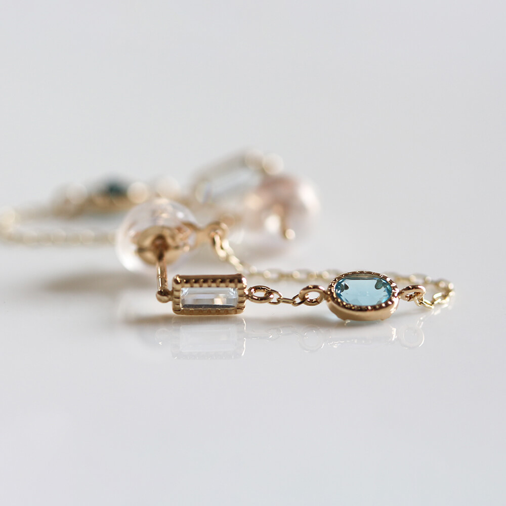 アクアマリン、ブルートパーズはそれぞれ異なる澄んだブルーの色合いが魅力的。
