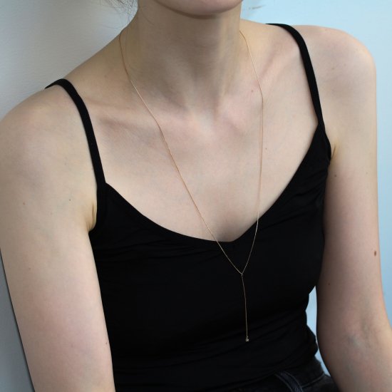 コーディネートのポイントになるダイヤモンドのY字ネックレス。