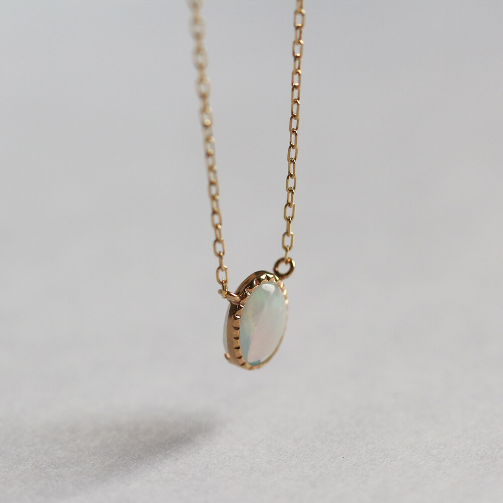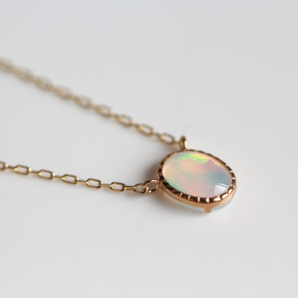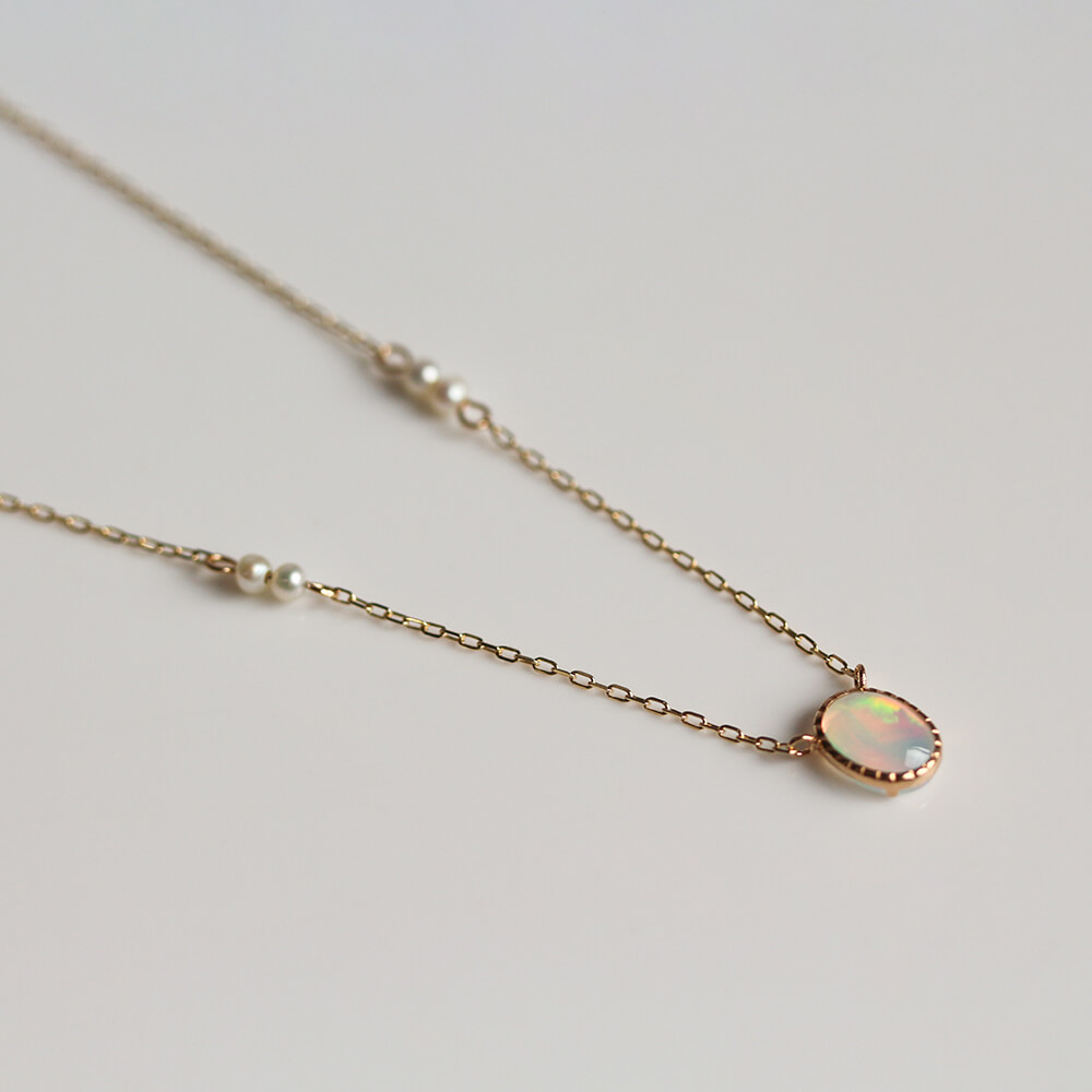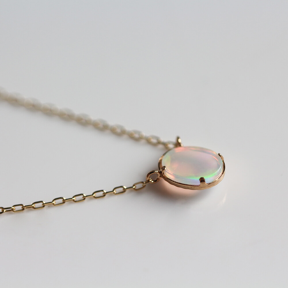 光の色や角度で表情を変えるオパールネックレス。