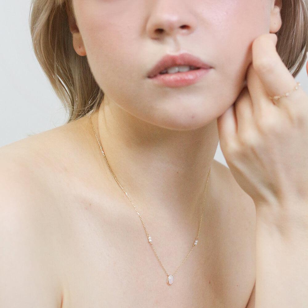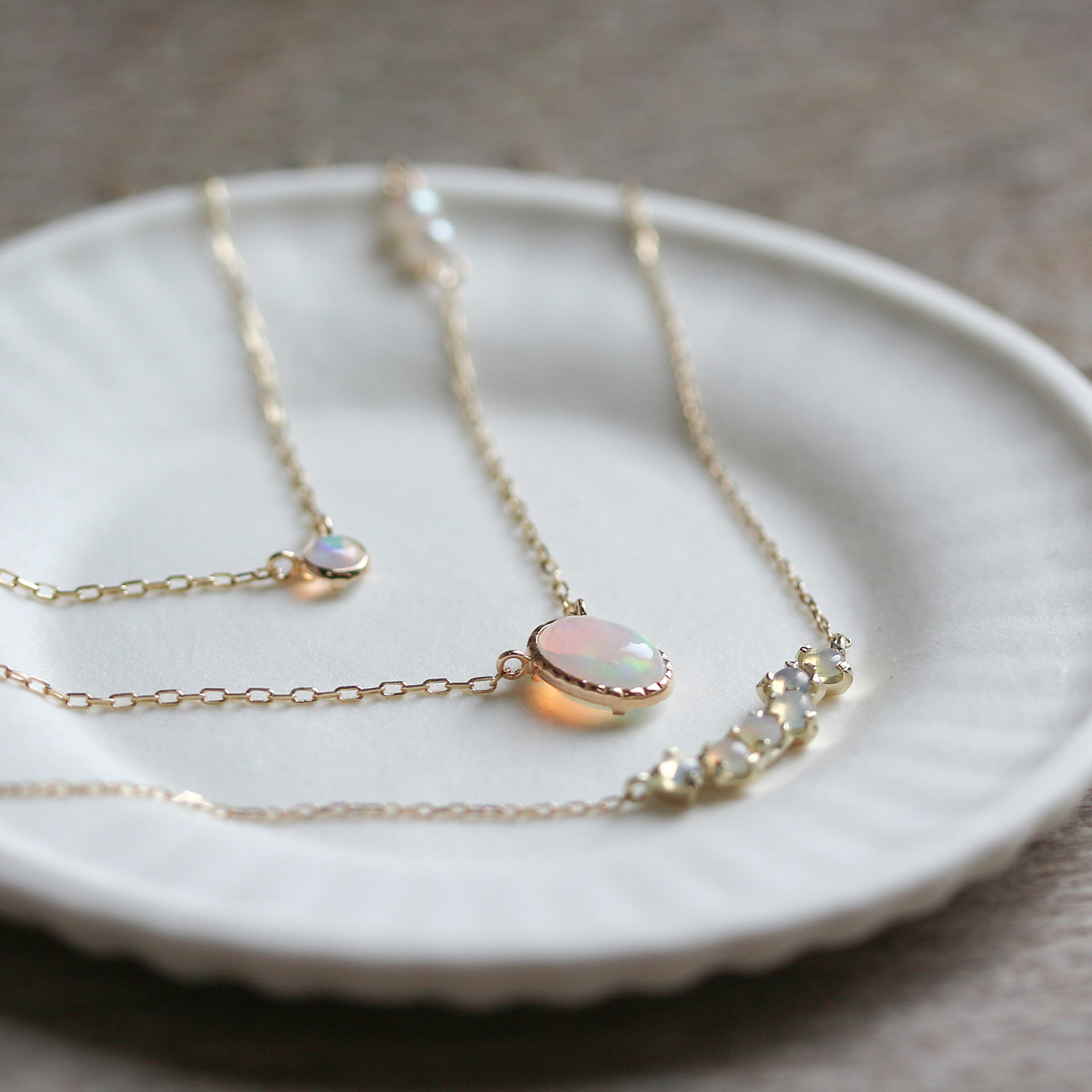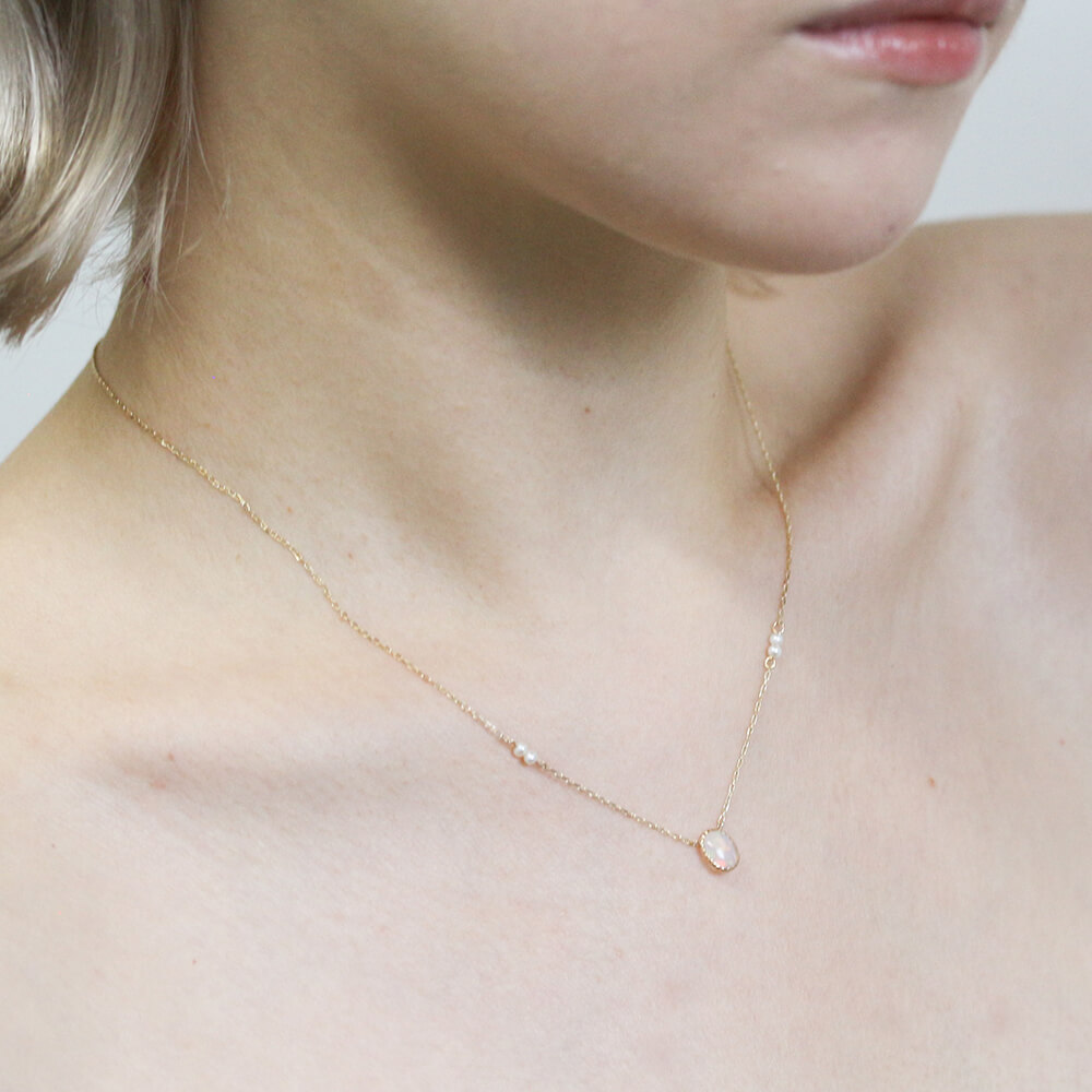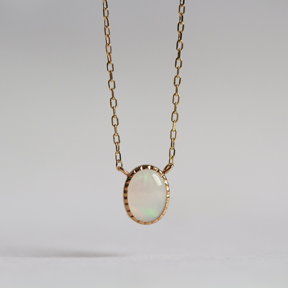 光の色や角度で表情を変えるオパールネックレス。