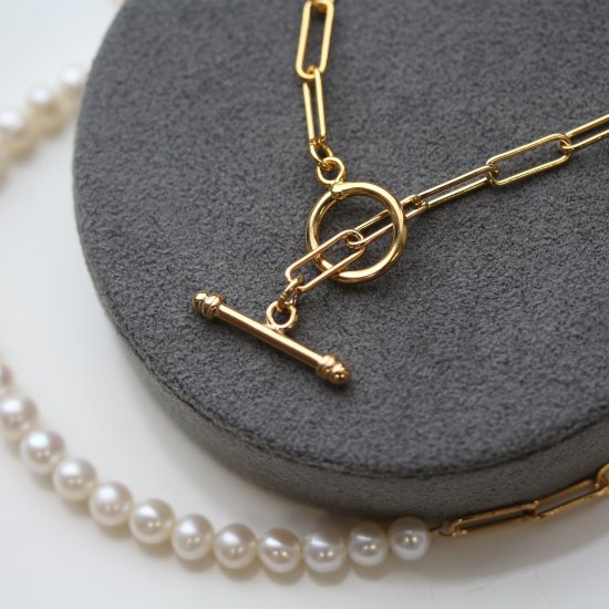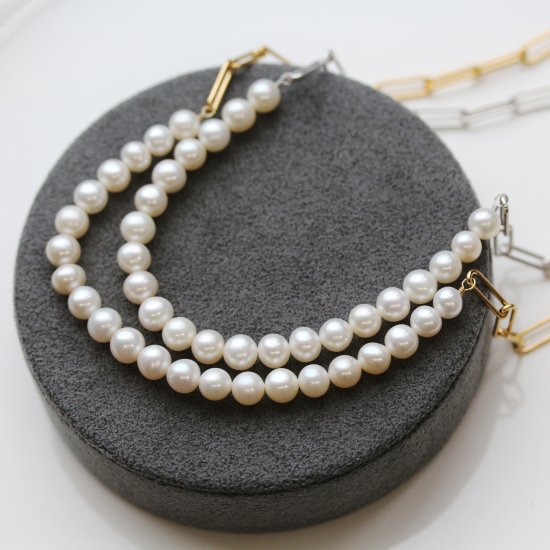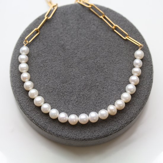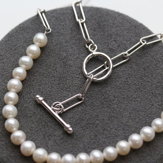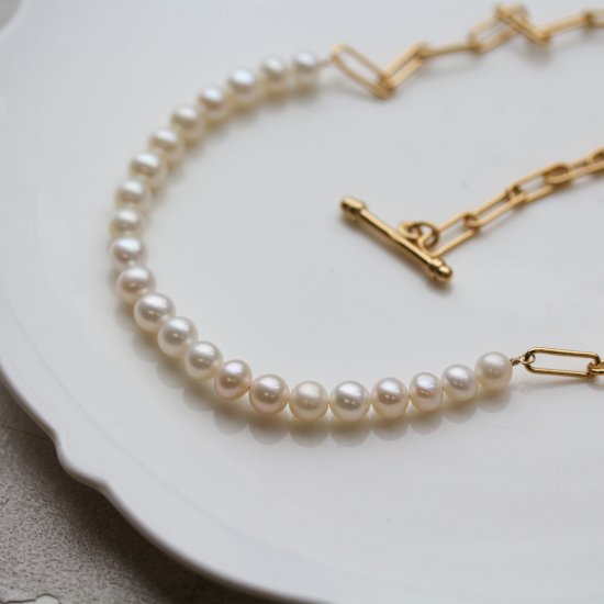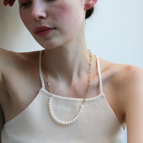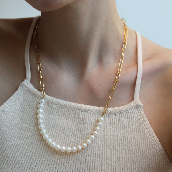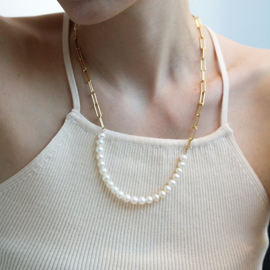 パールの優しい輝きとチェーンのアンサンブルで作られ、