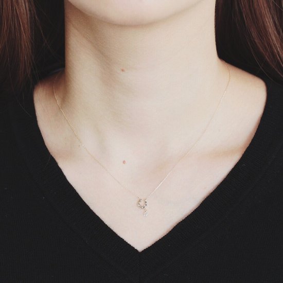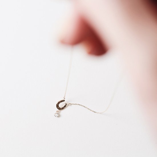 先端でアクアマリンが小さく揺れる馬蹄のネックレス。