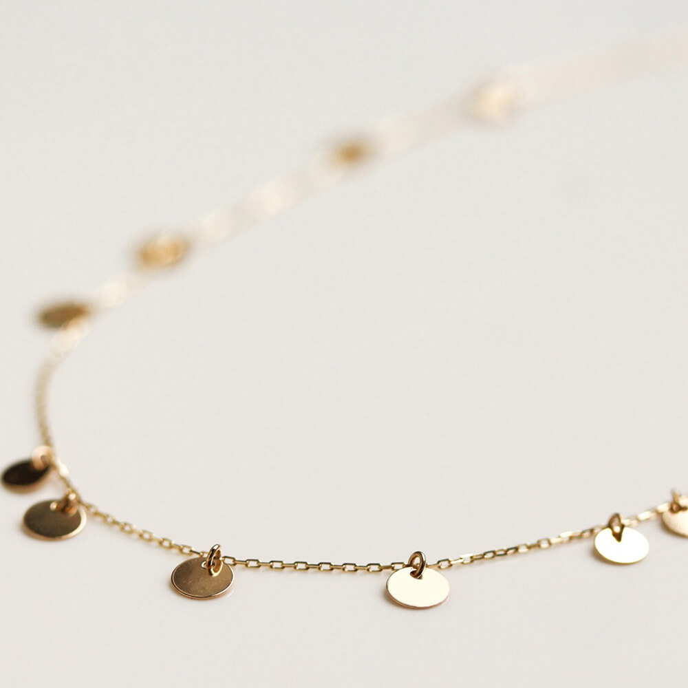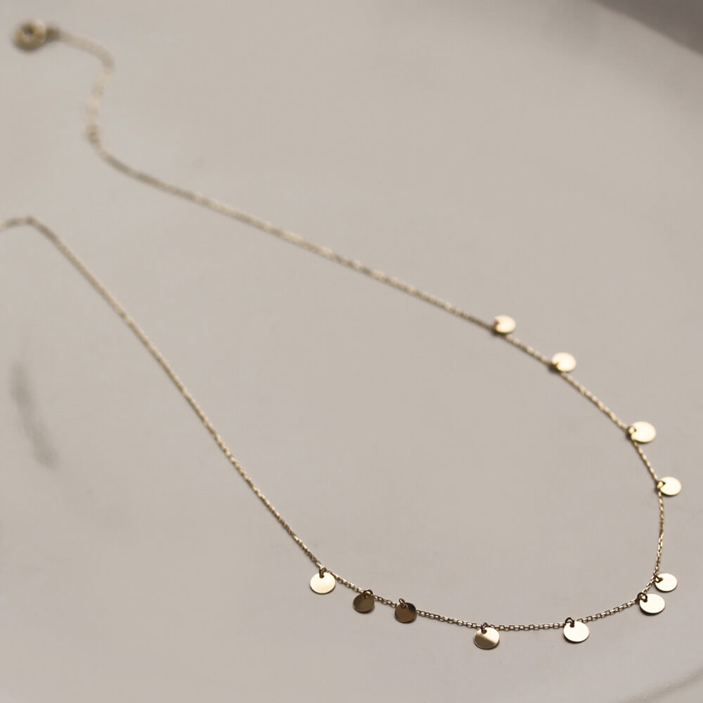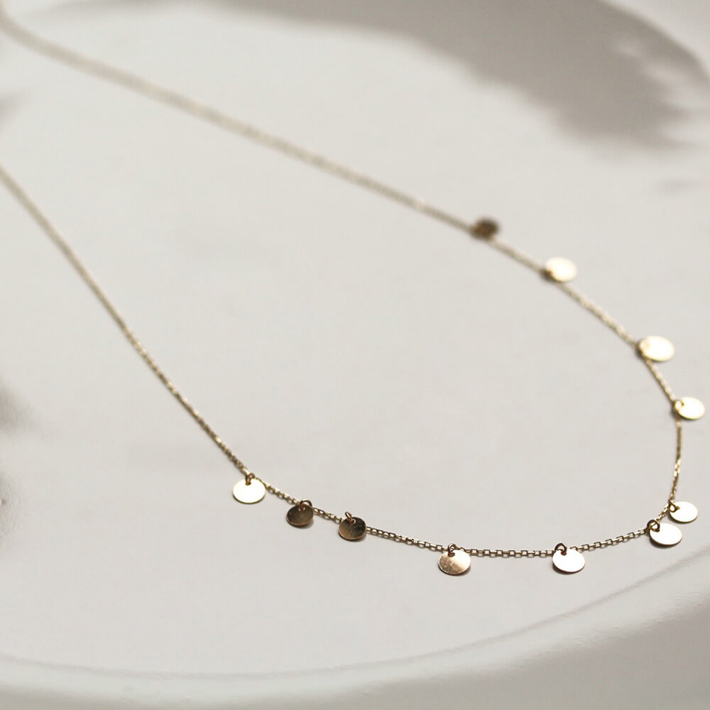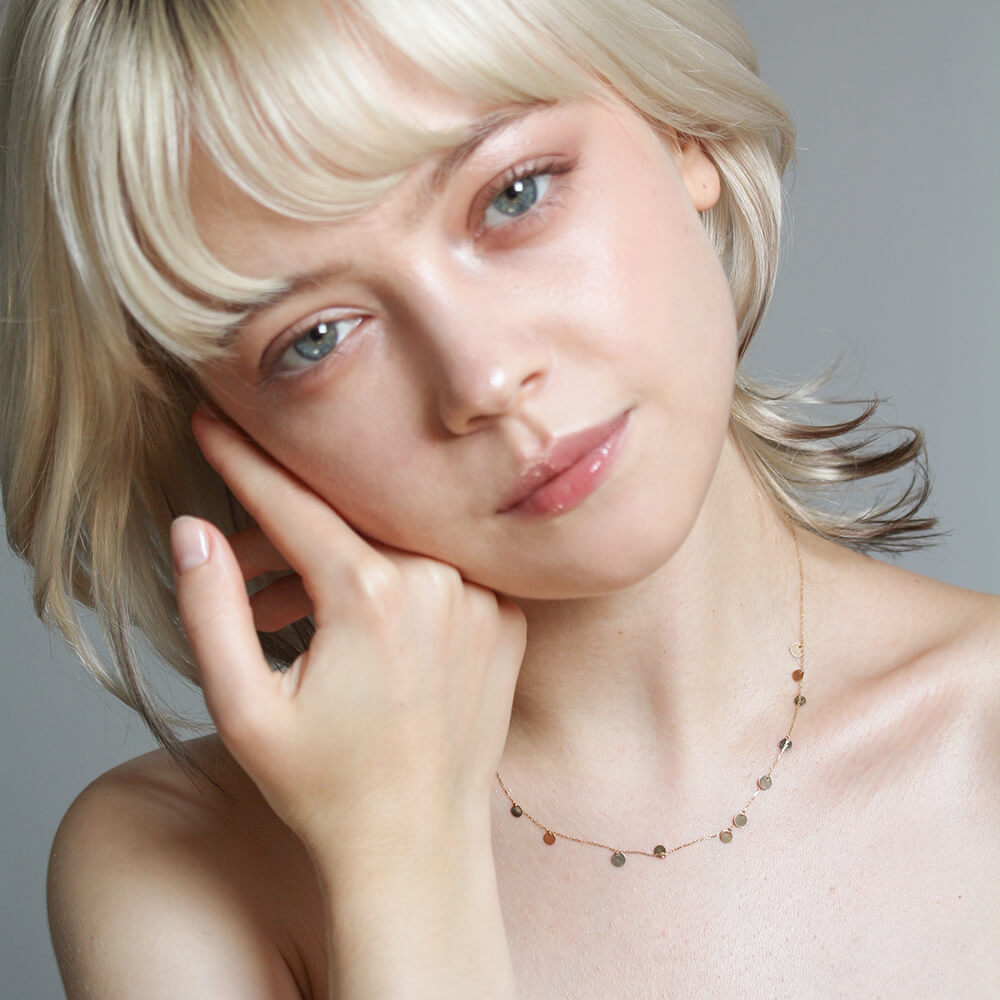 華奢な小豆チェーンが肌によく馴染み、プレートの鏡面反射で上品さもプラスされ、