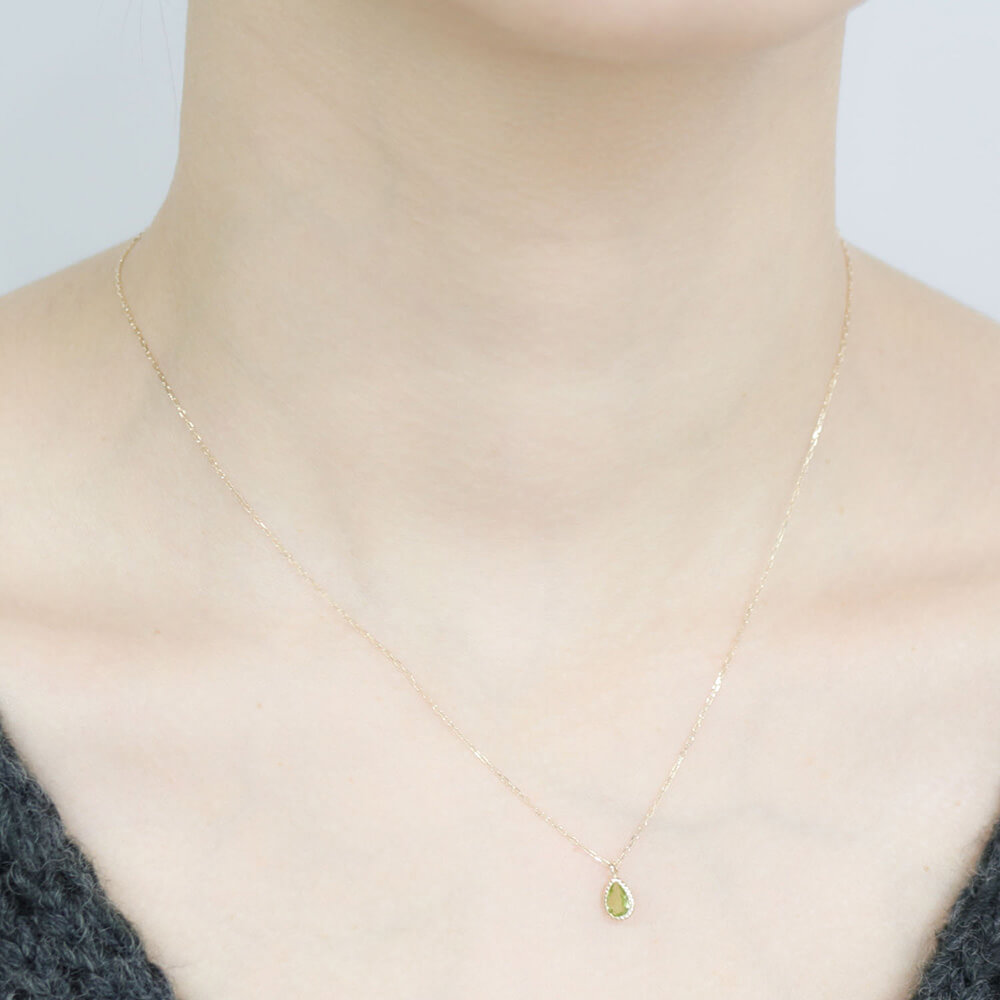透明感のあるカットを施した、ペアシェイプのペリドットネックレス。