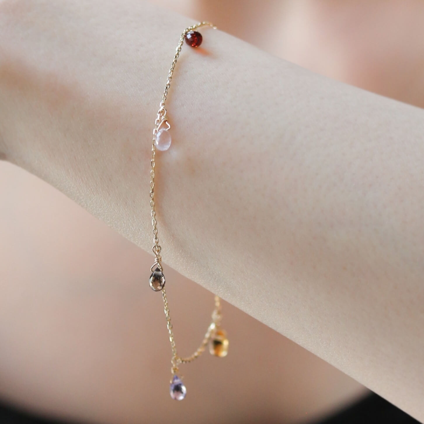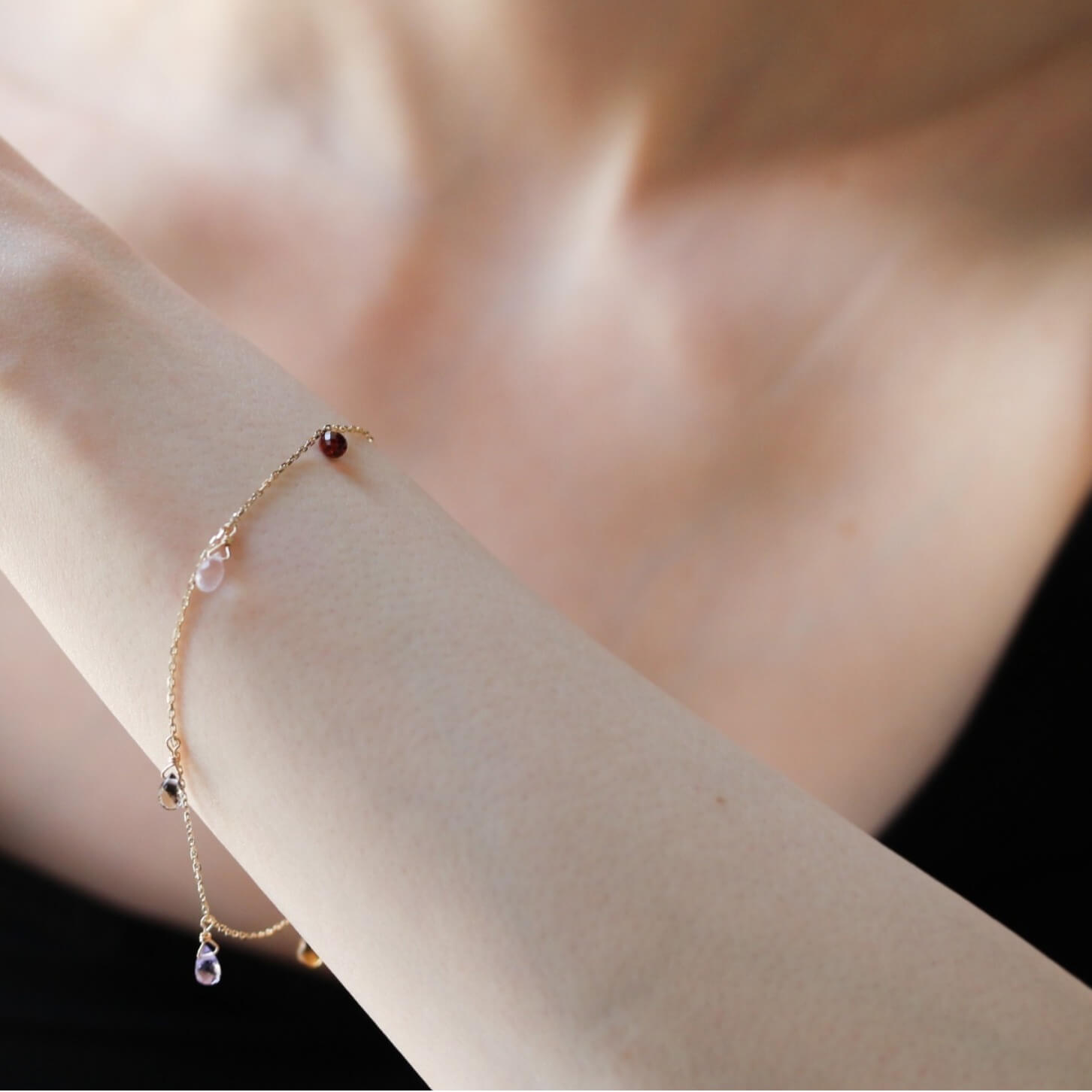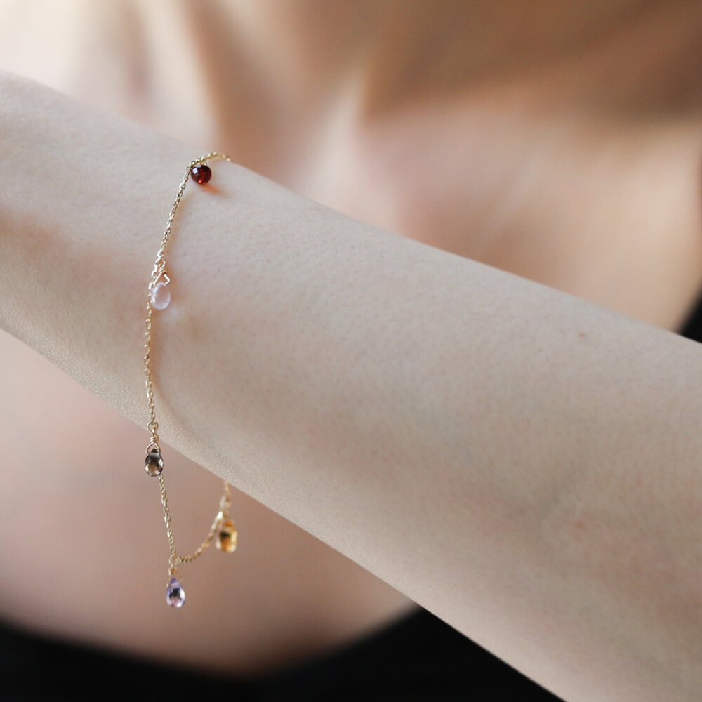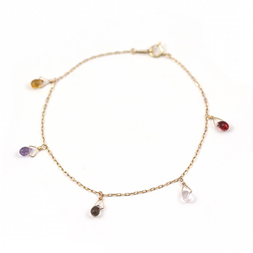雫形にカットが施されたカラーストーンを、5石あしらったステーションブレスレット。