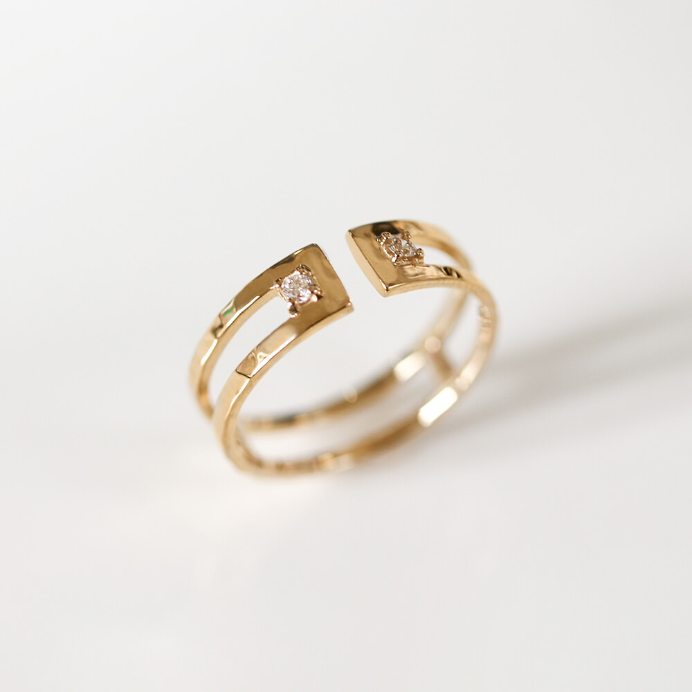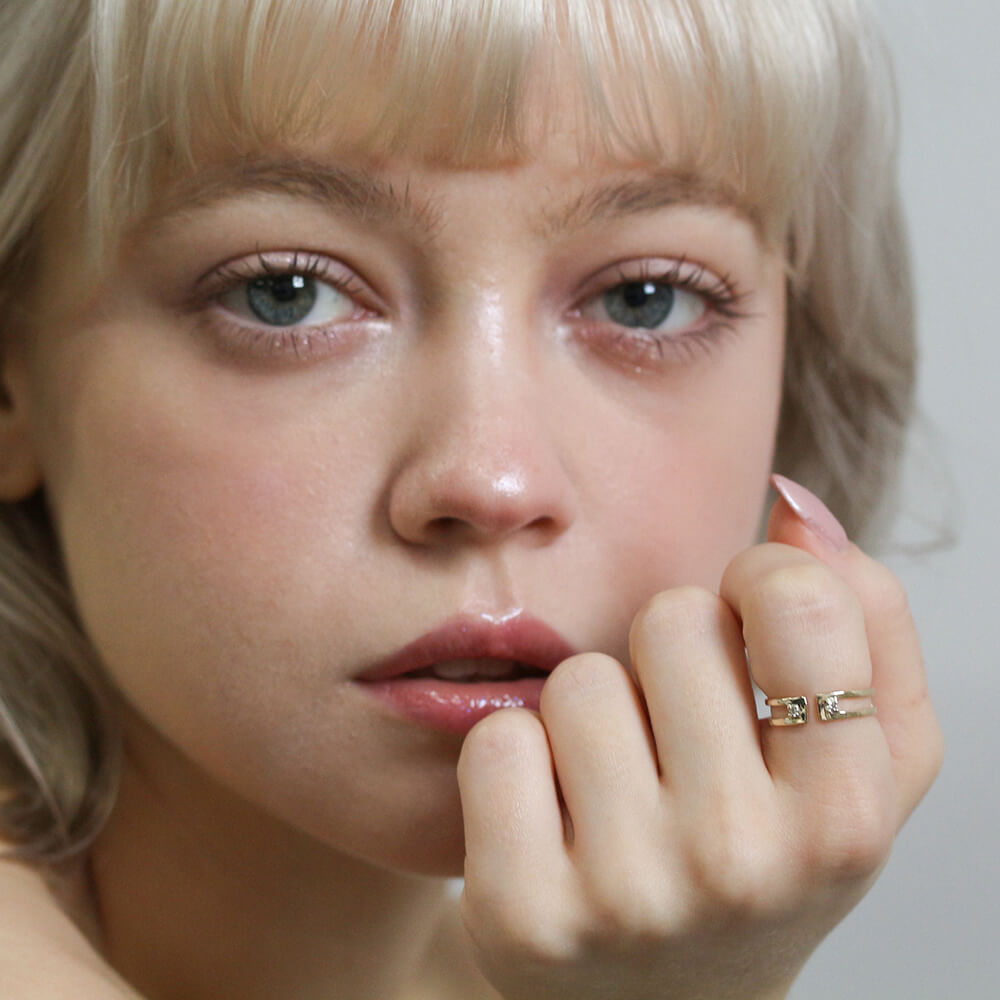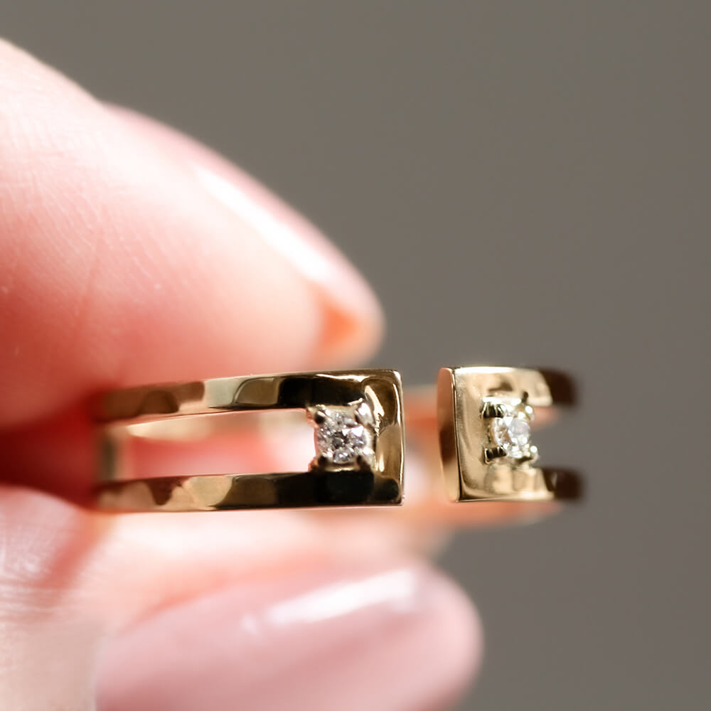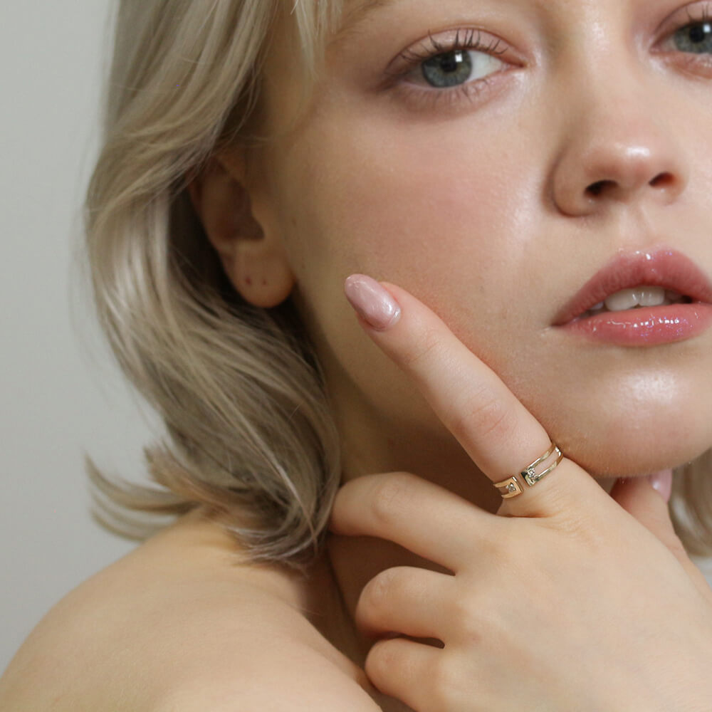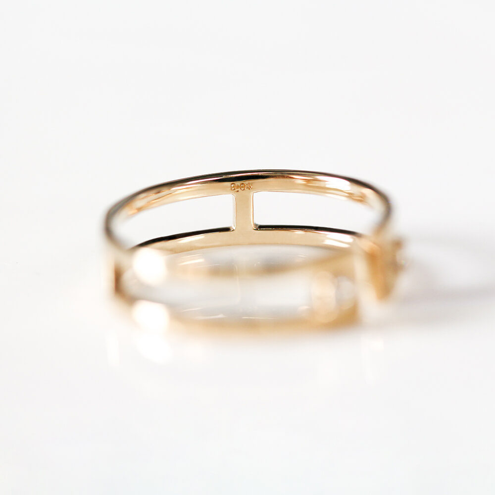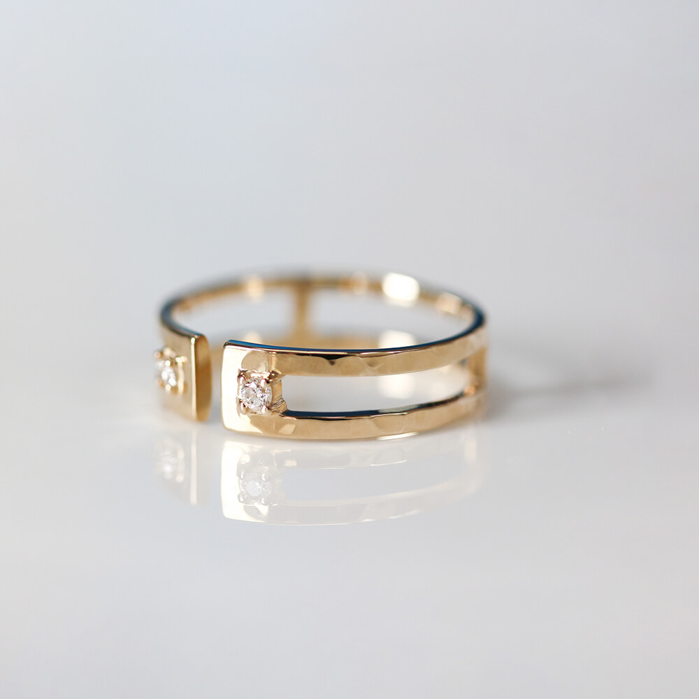 コーディネートの主役になる太めの地金リング。存在感がありますが、くり抜きデザインなのですっきりとした印象で、指を奇麗にみせてくれます。ダイヤモンドあり、なしの2型展開です。