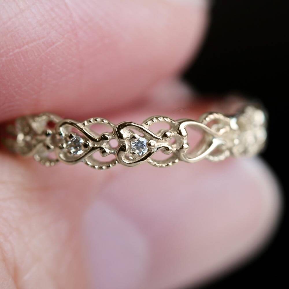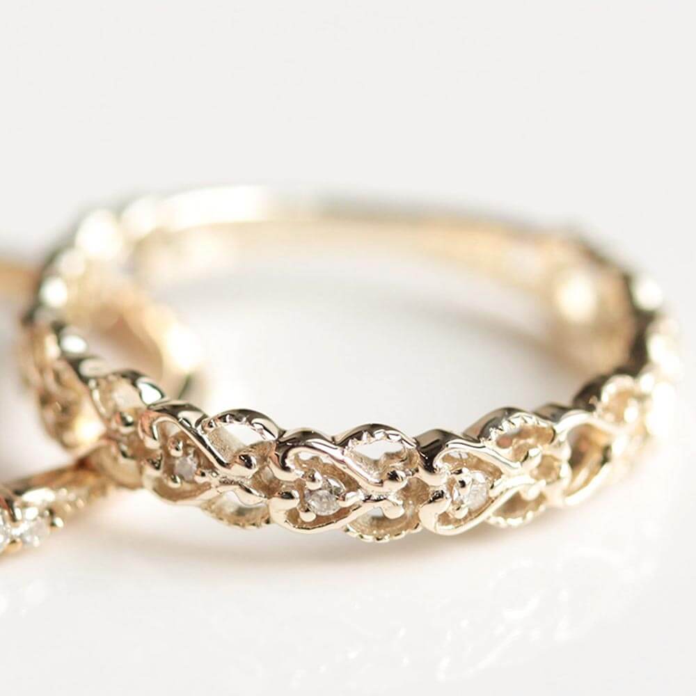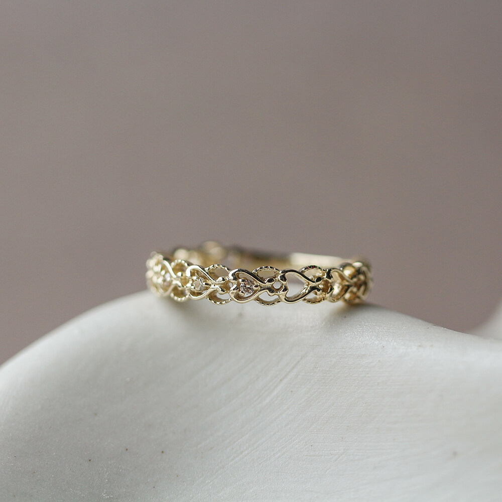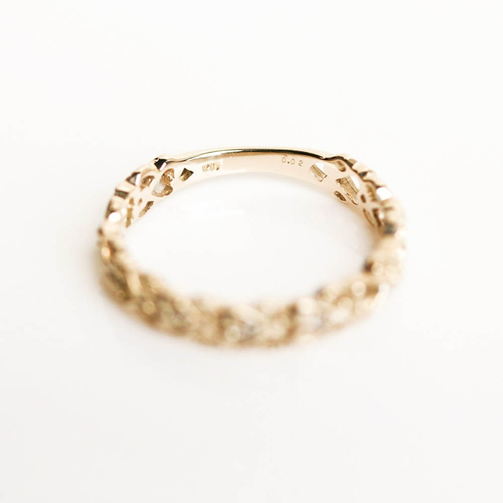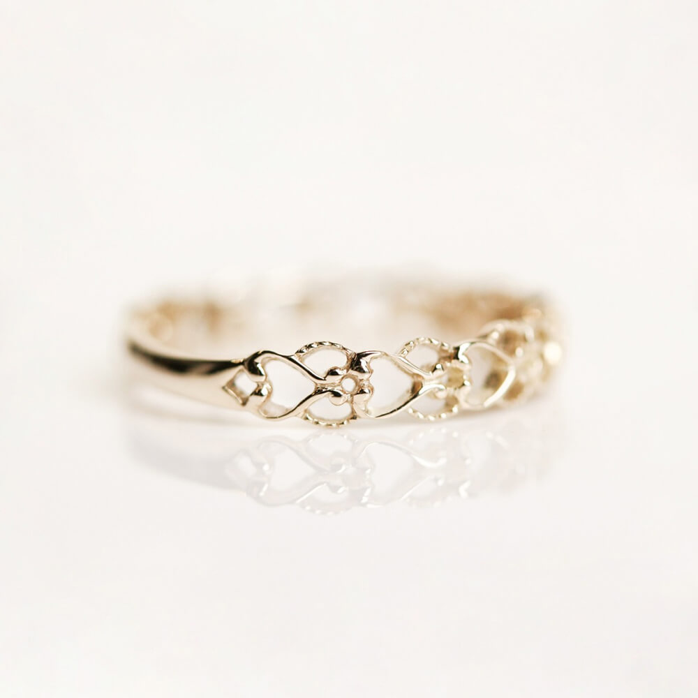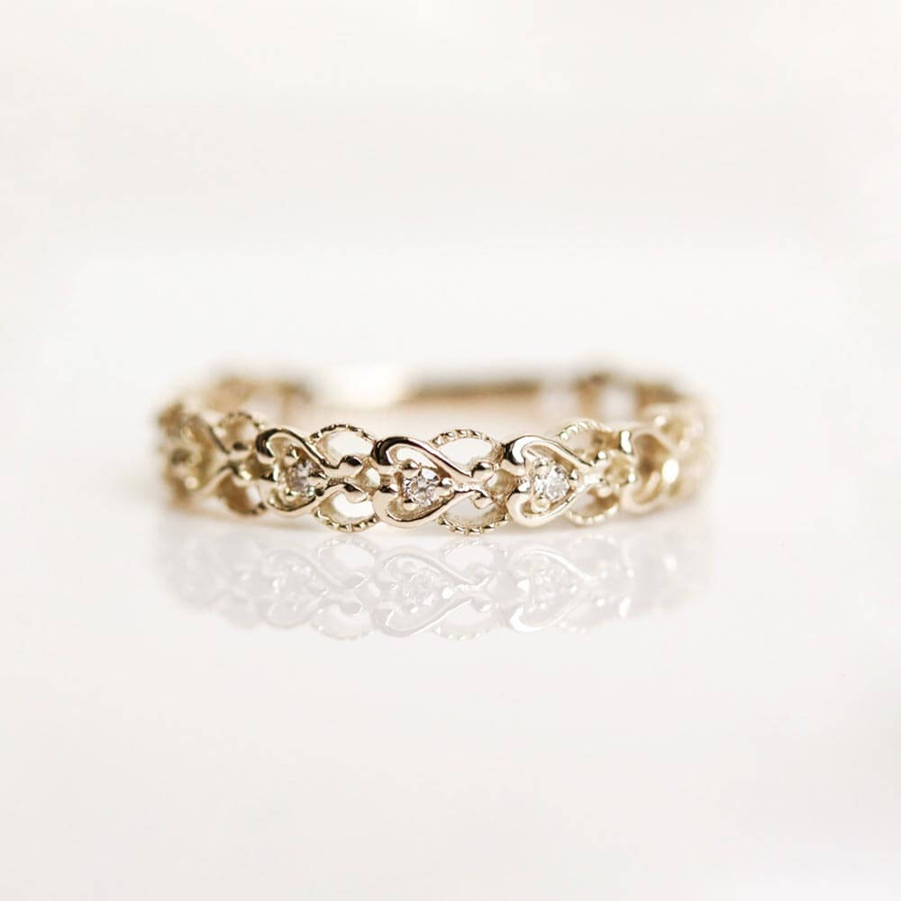繊細な透かしデザインから覗く3石のダイヤモンドが、華やかで女性らしい印象に。