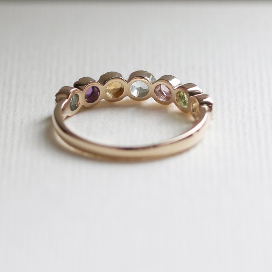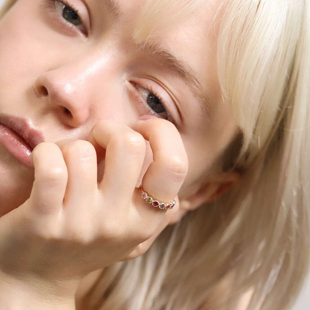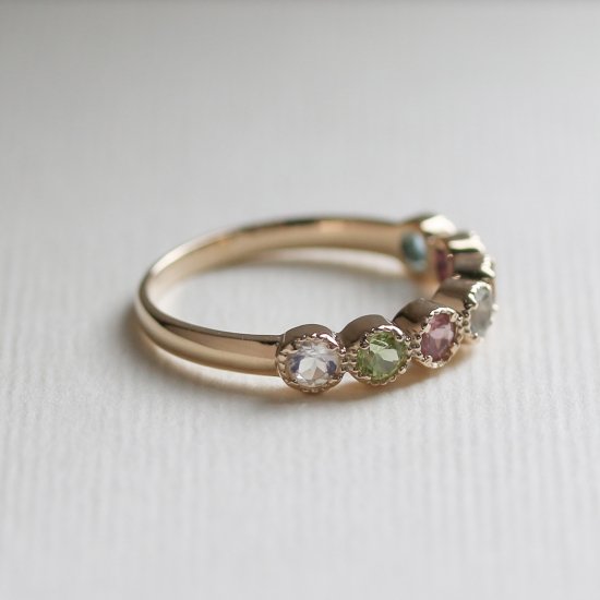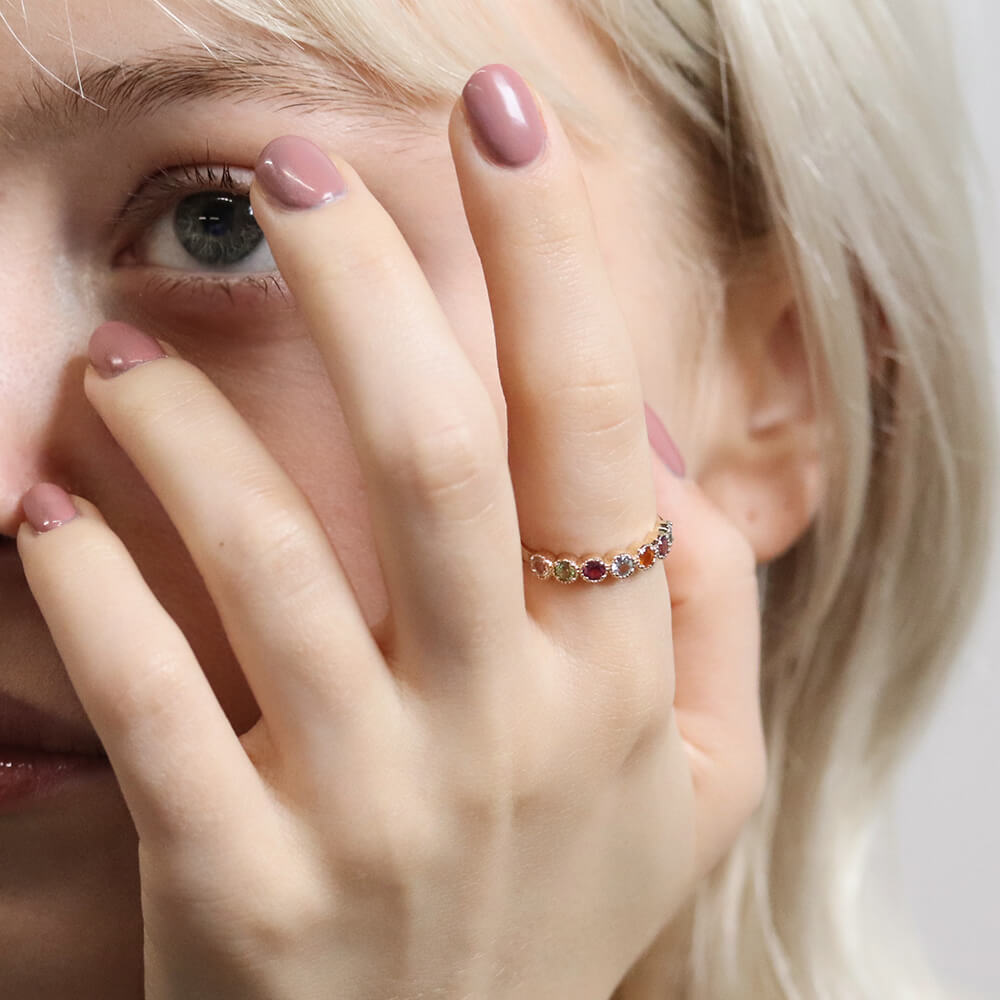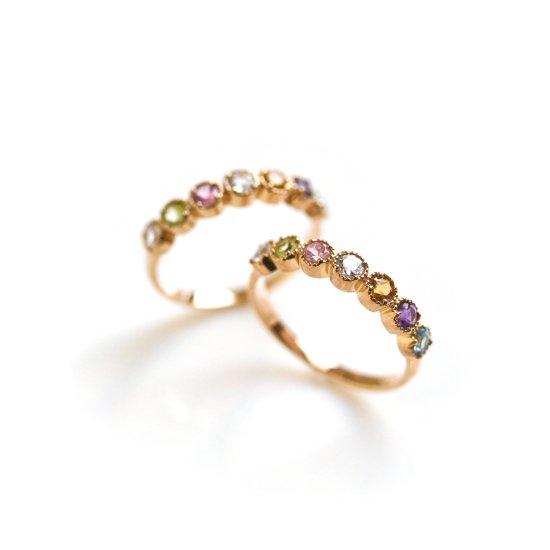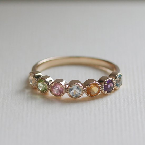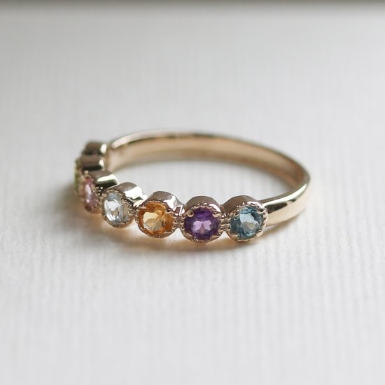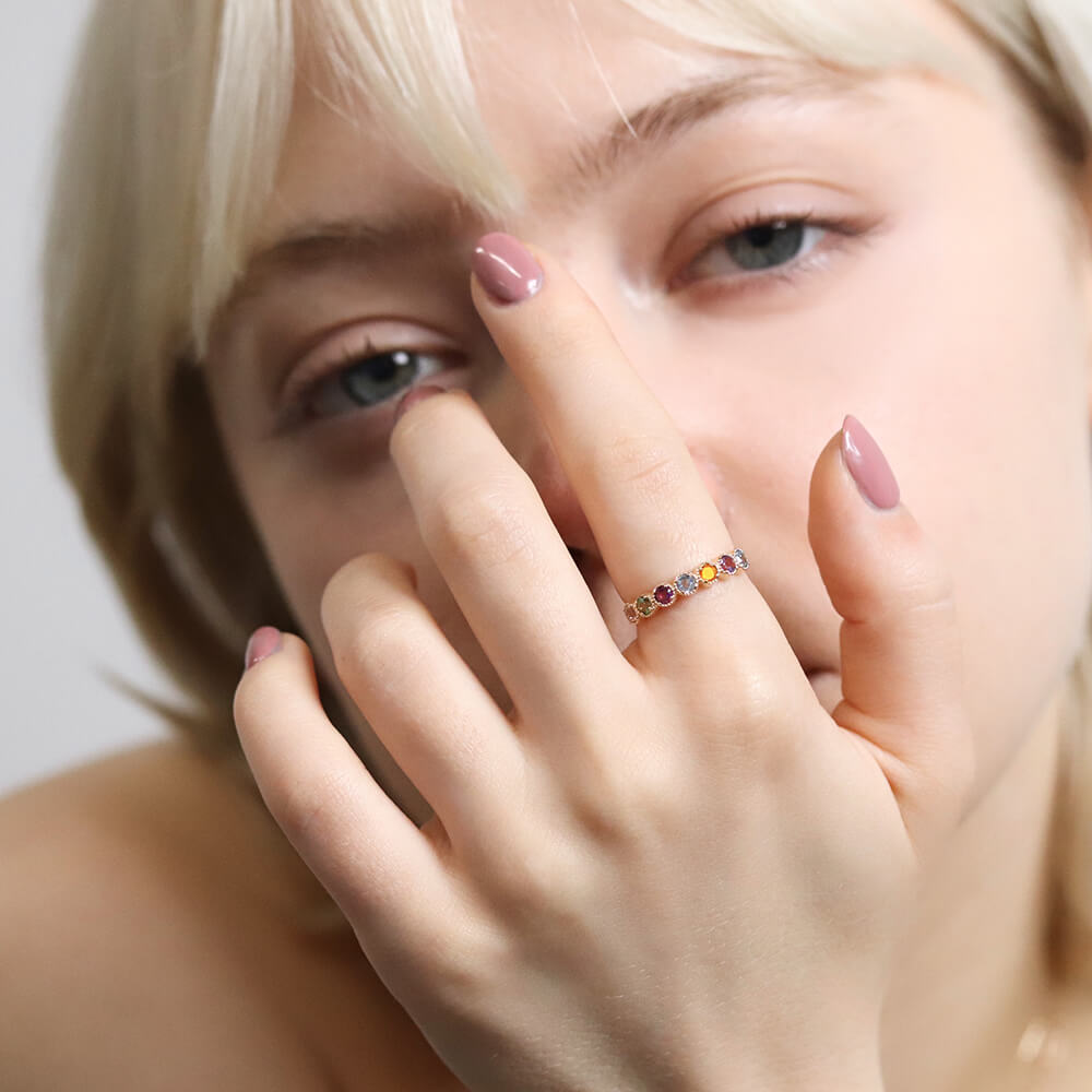 鮮やかな7色のカラーストーンで彩られたリングは指元が目に入るたび、明るい気持ちにさせてくれます。