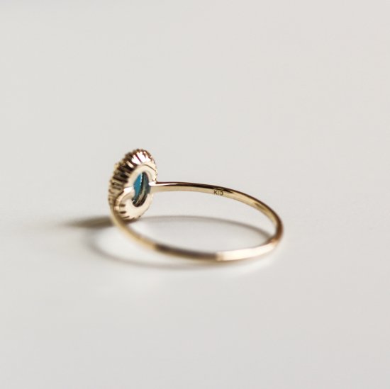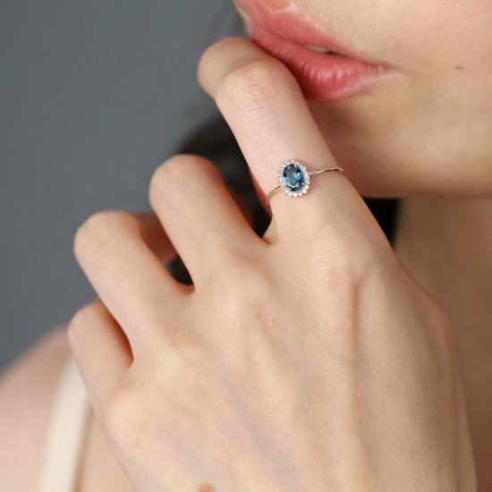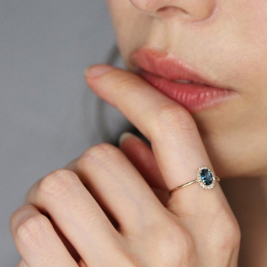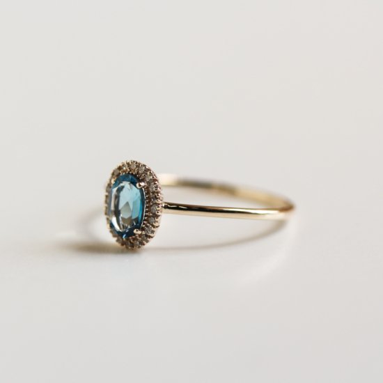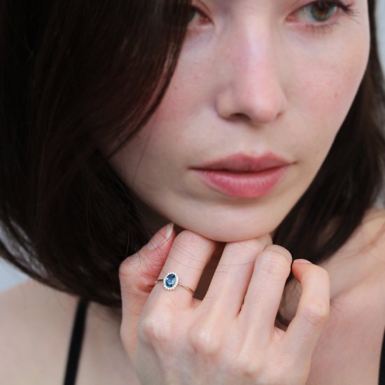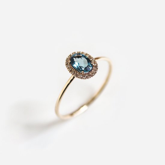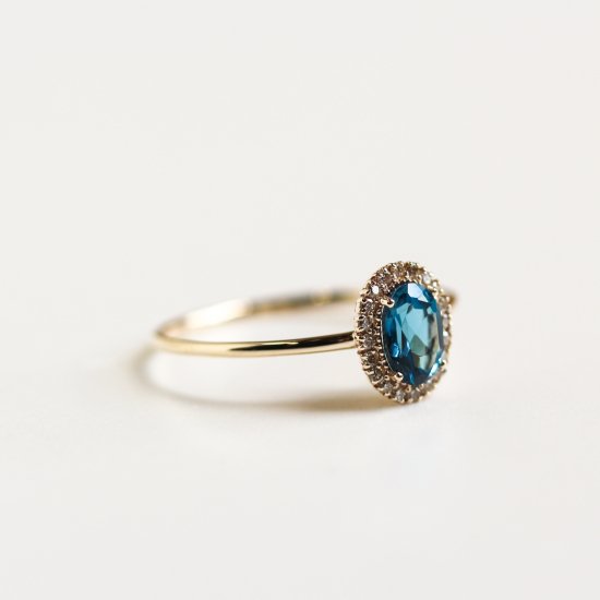 周囲にダイヤモンドを取り巻く事で、ロンドンブルートパーズを引き立たせ、より上品な印象に。
