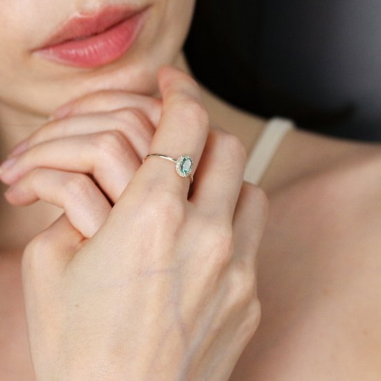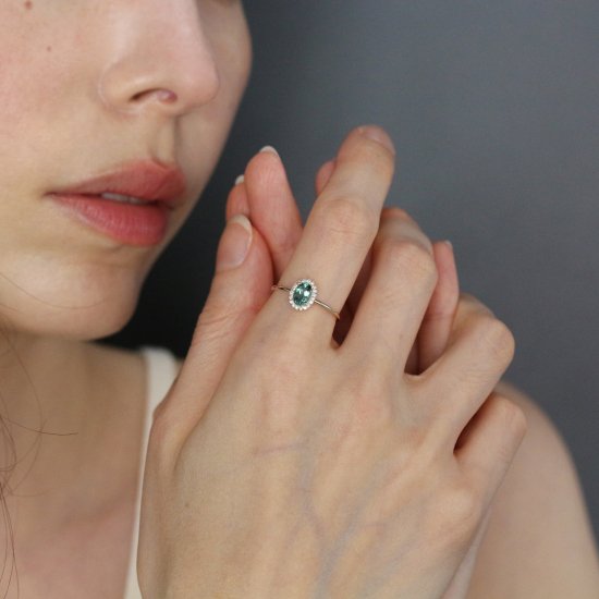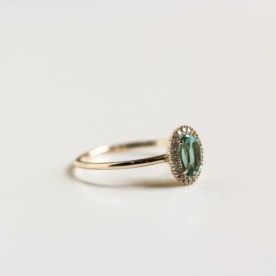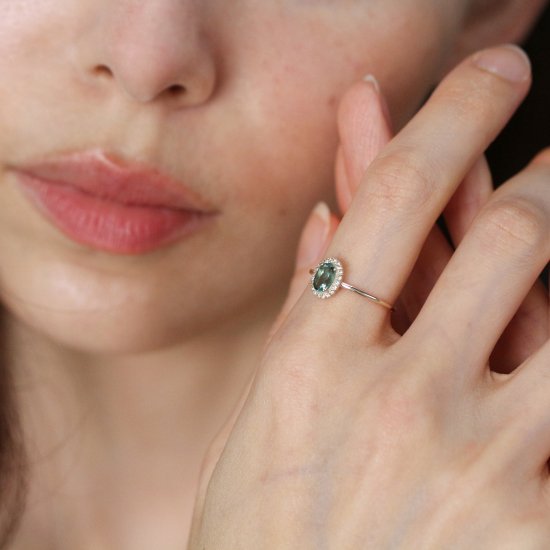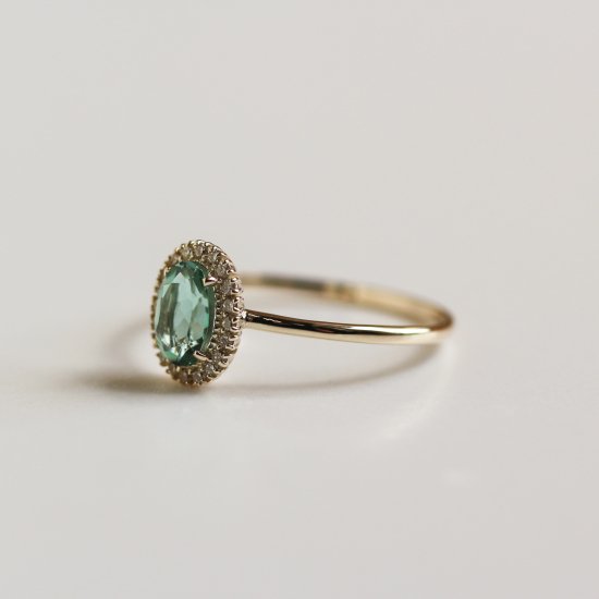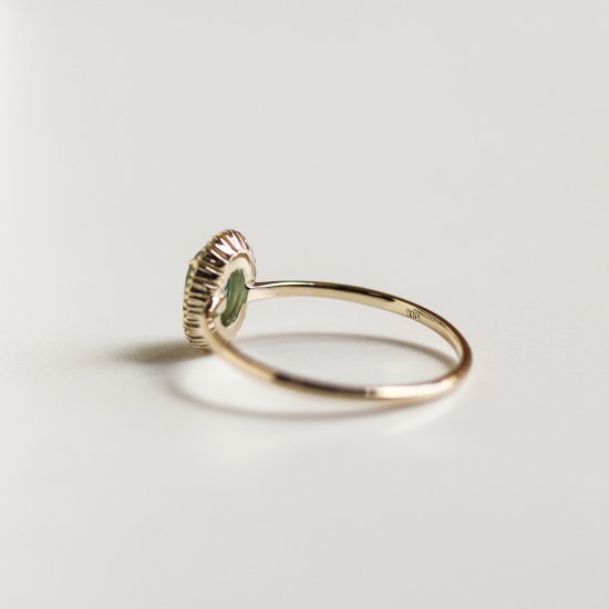 周囲にダイヤモンドを取り巻く事で、グリーンクォーツを引き立たせ、より上品な印象に。