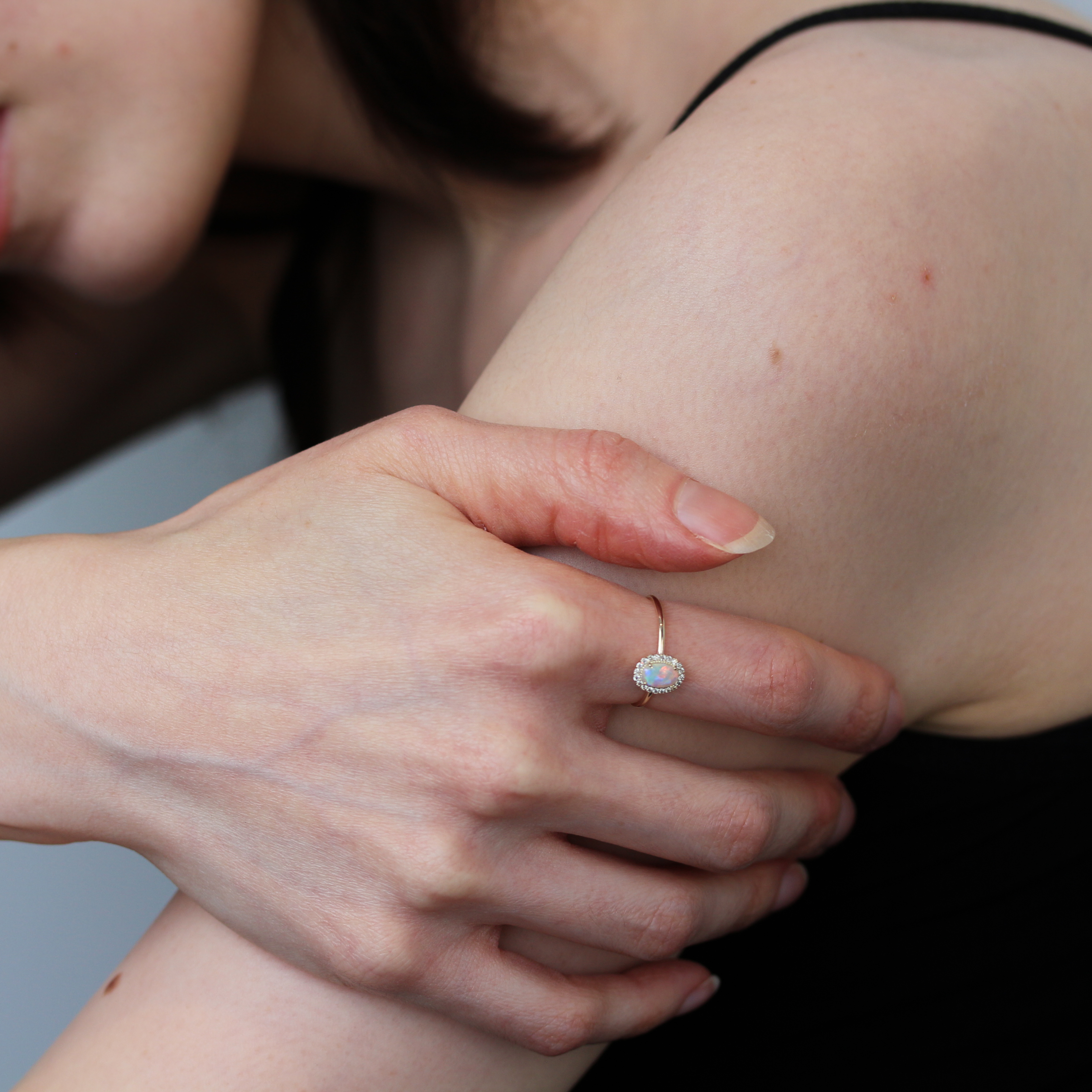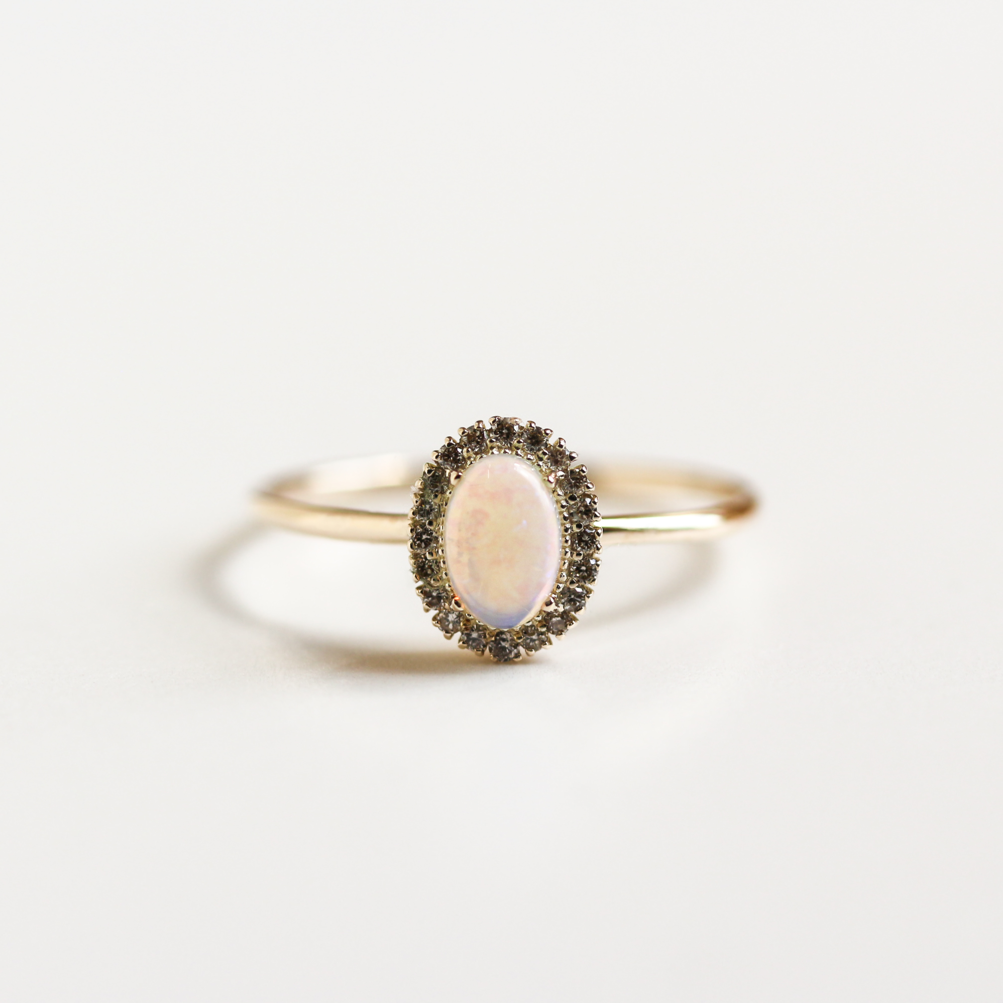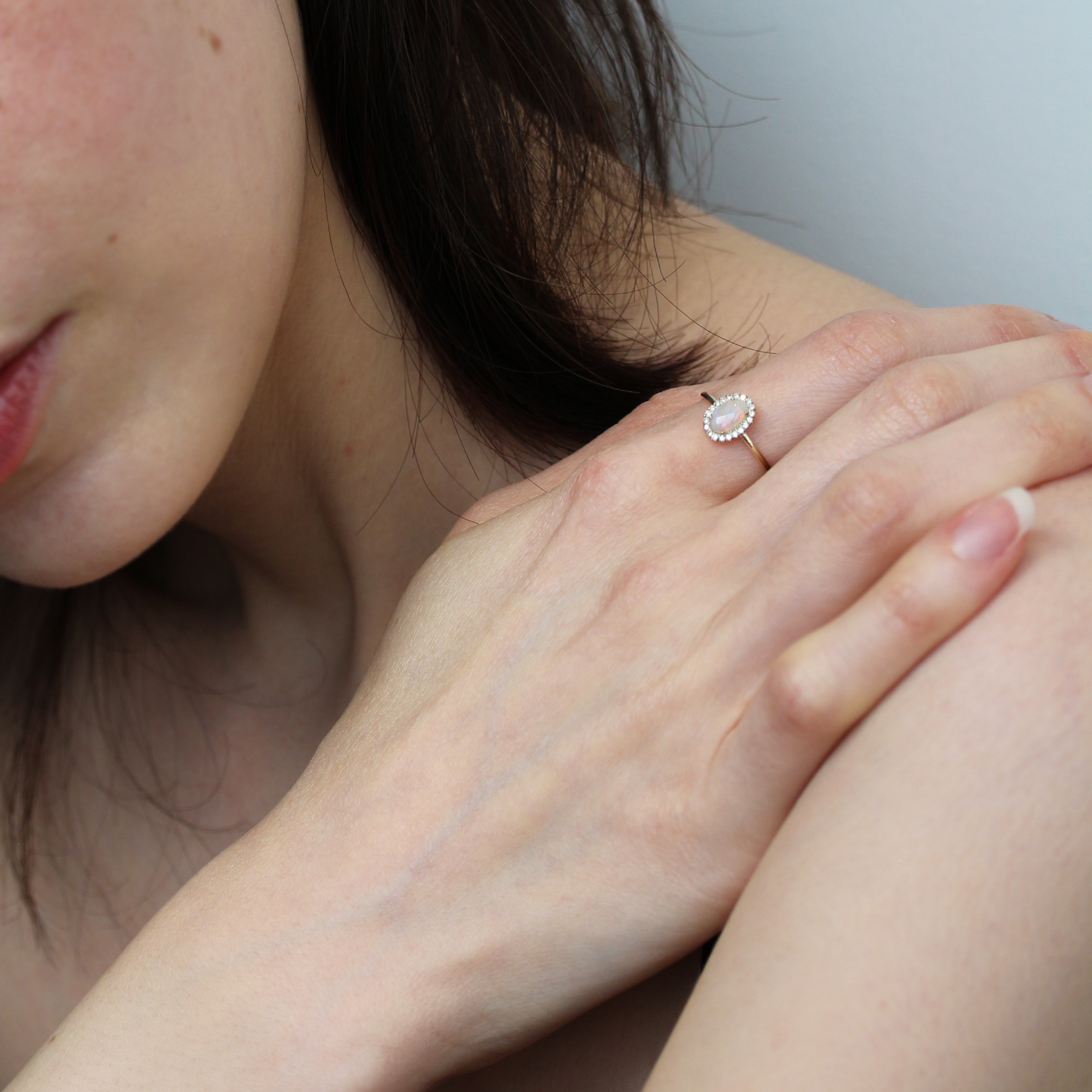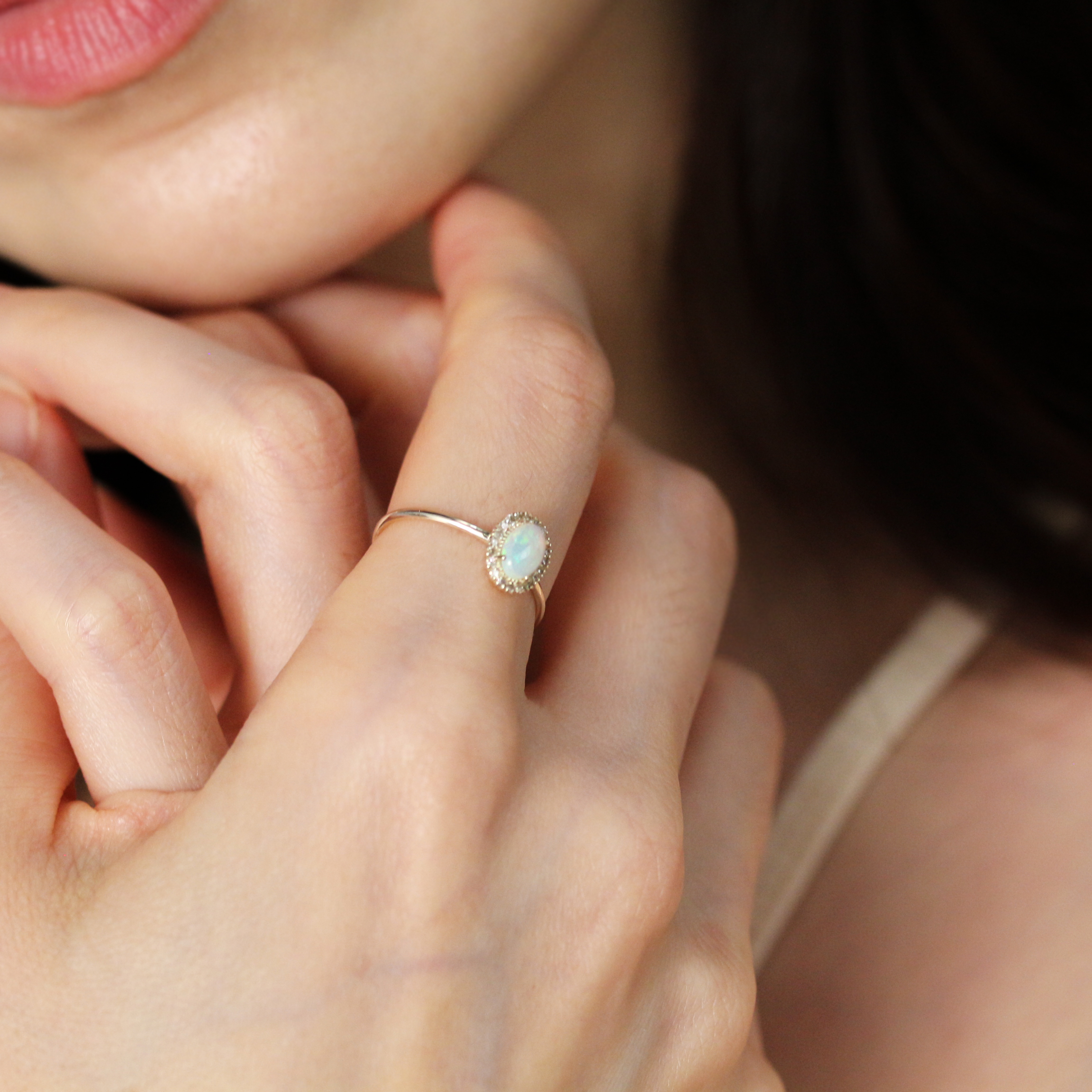 周囲にダイヤモンドを取り巻く事で、オパールを引き立たせ、より上品な印象に。