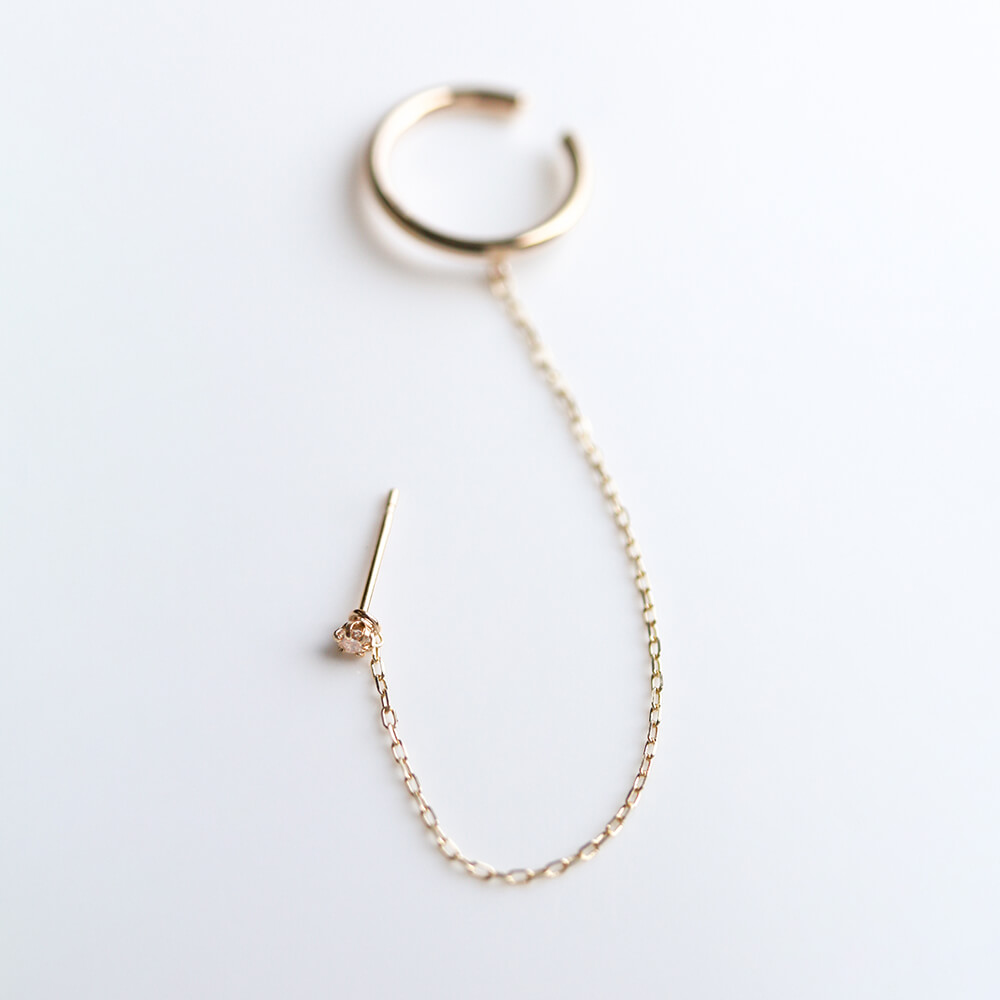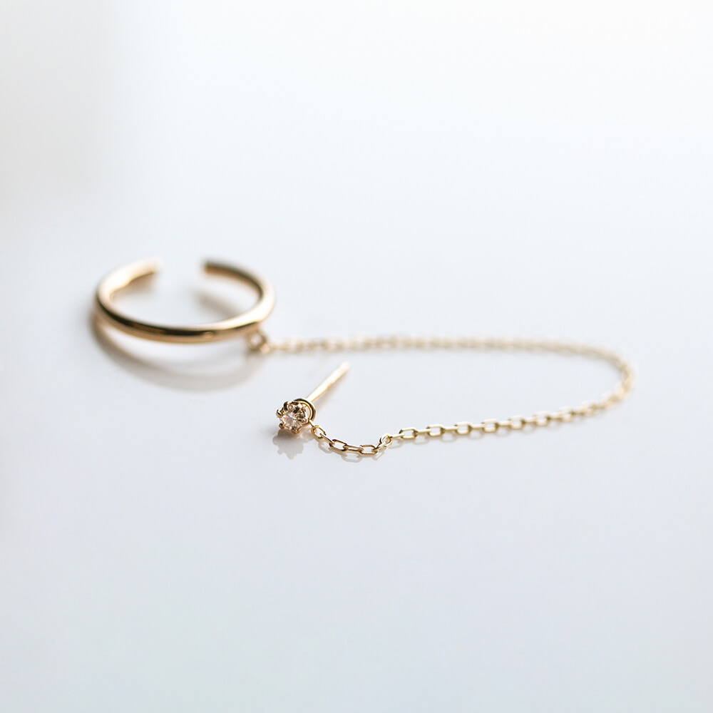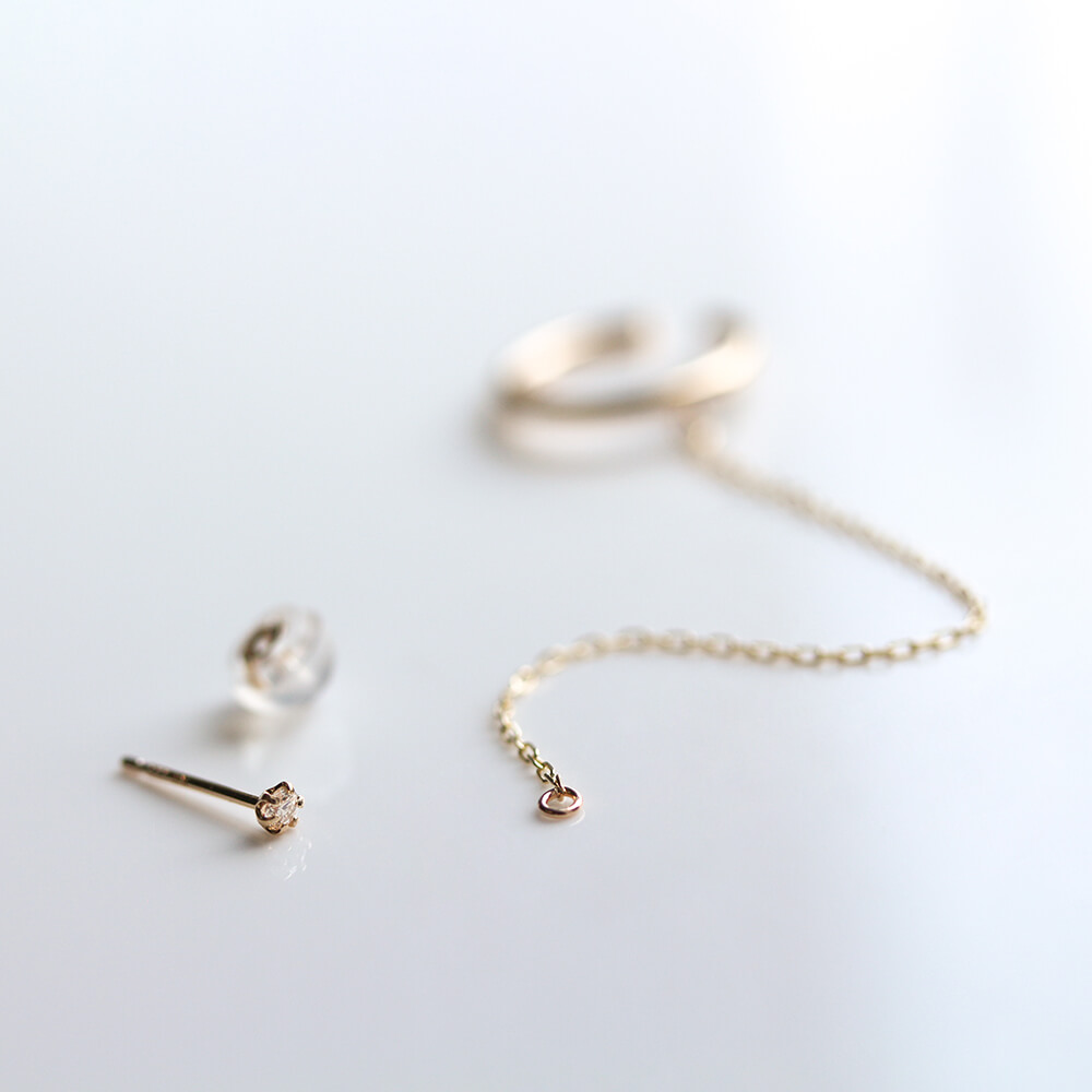 ダイヤモンド一粒ピアスとレイヤードしたイヤーカフ。