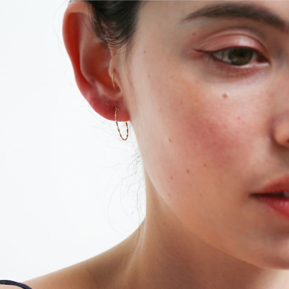 動きに合わせて、チェーンが揺らぎ、ゴールドの輝きを上品に引き立てます。