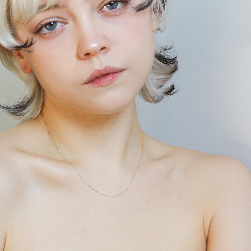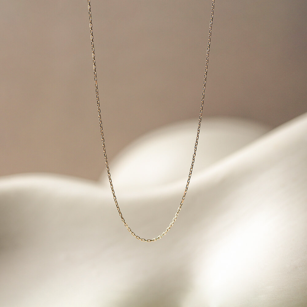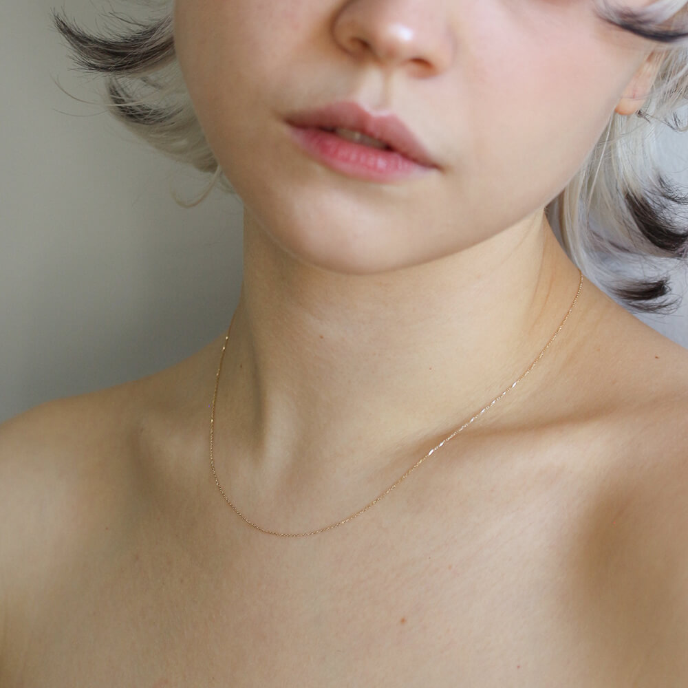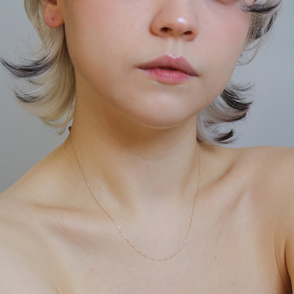 当店の一番華奢なチェーンです。目が細かく、繊細な輝きを放ち、女性のデコルテラインを美しく魅せます。