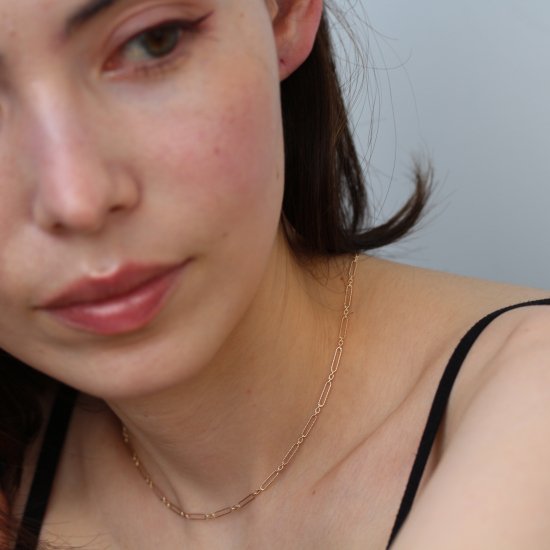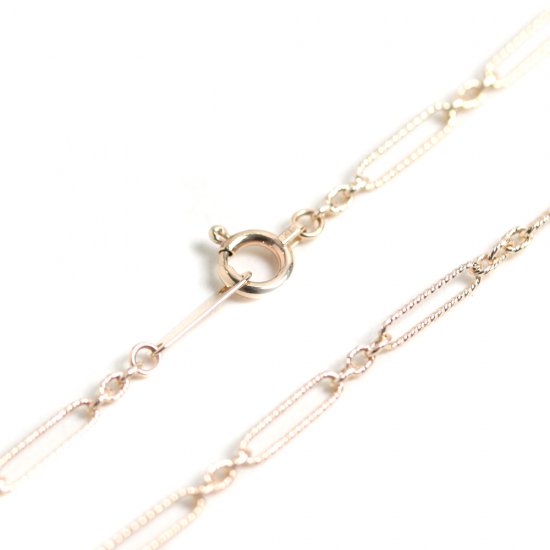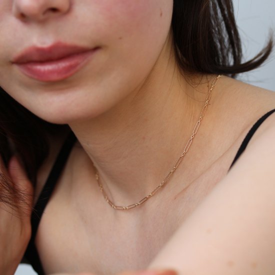 ツイストされたオーバルパーツは、チェーンの空間が目立つことによって程よい抜け感を演出できます。
