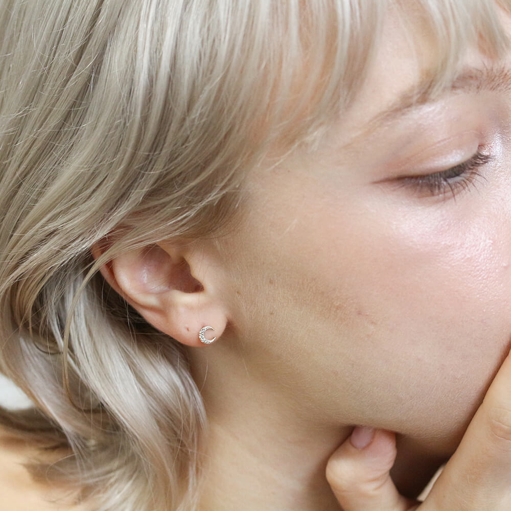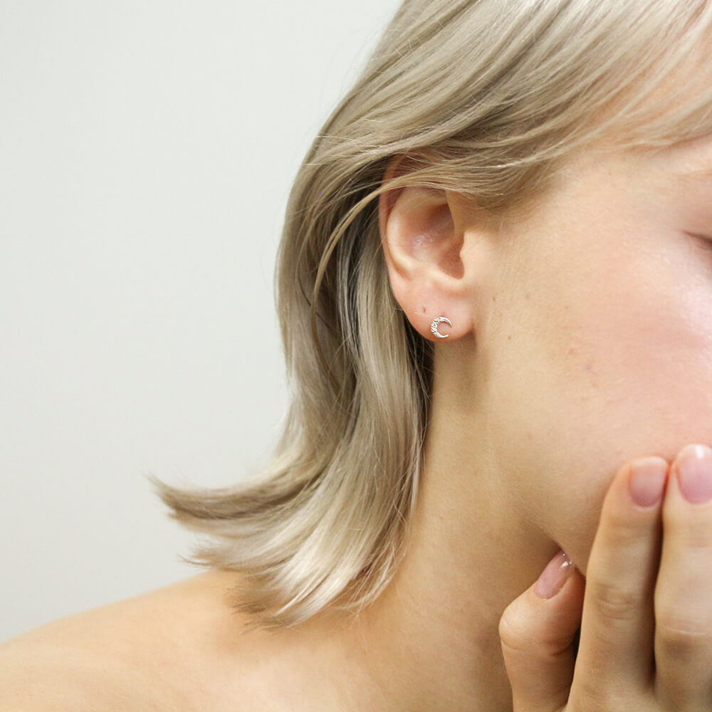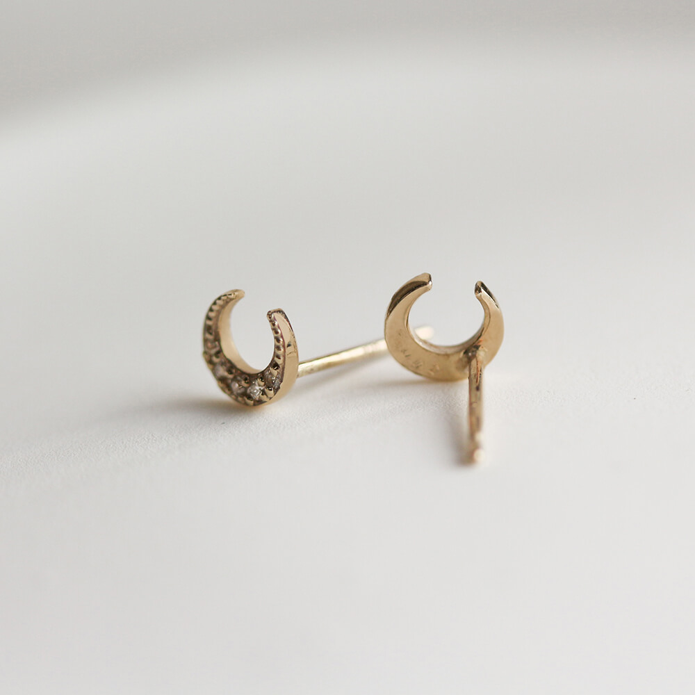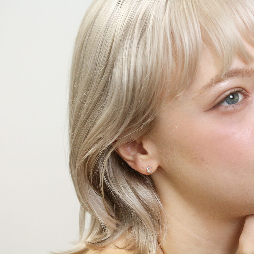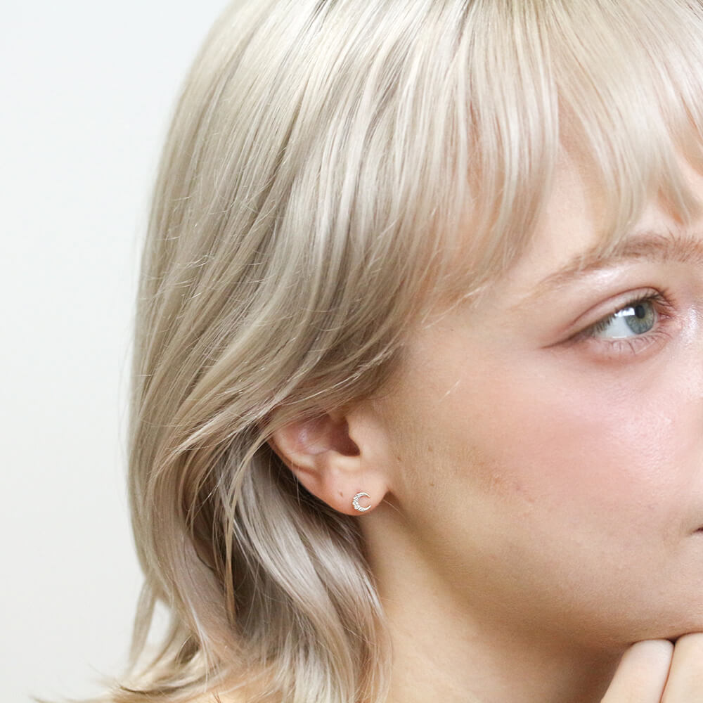 美しいダイヤモンドをあしらった、直径5ミリのシンプルなムーンピアス。