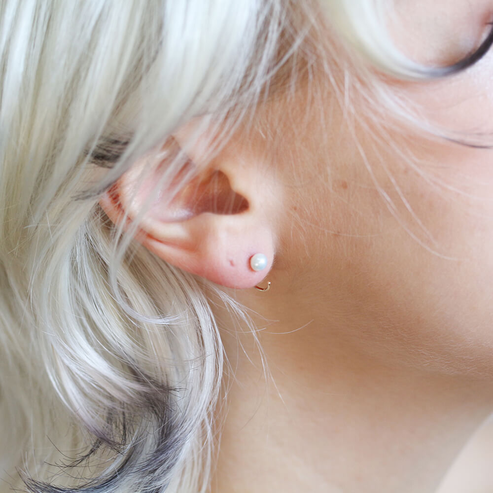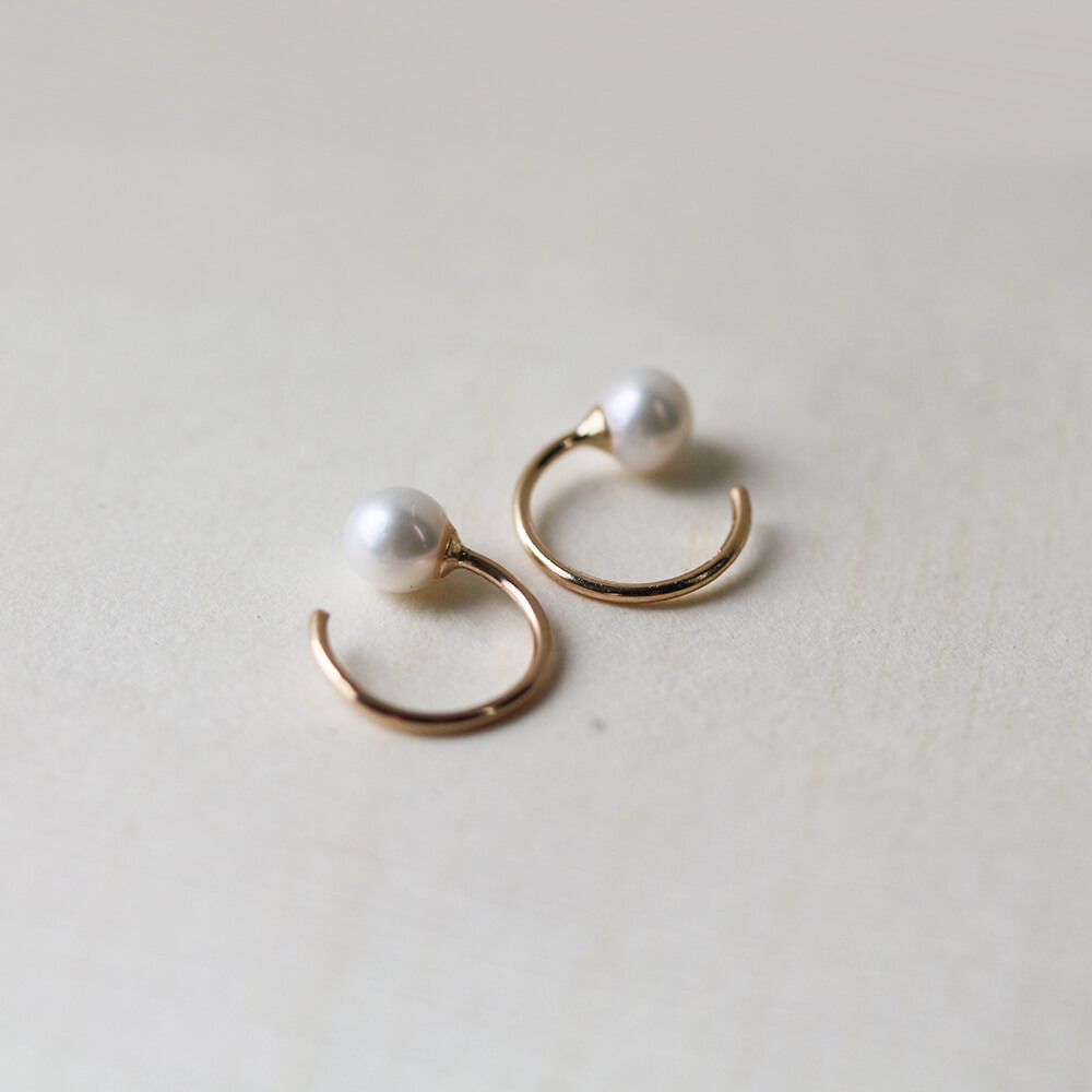 耳たぶを挟むようなデザインが印象的なパールピアス。
