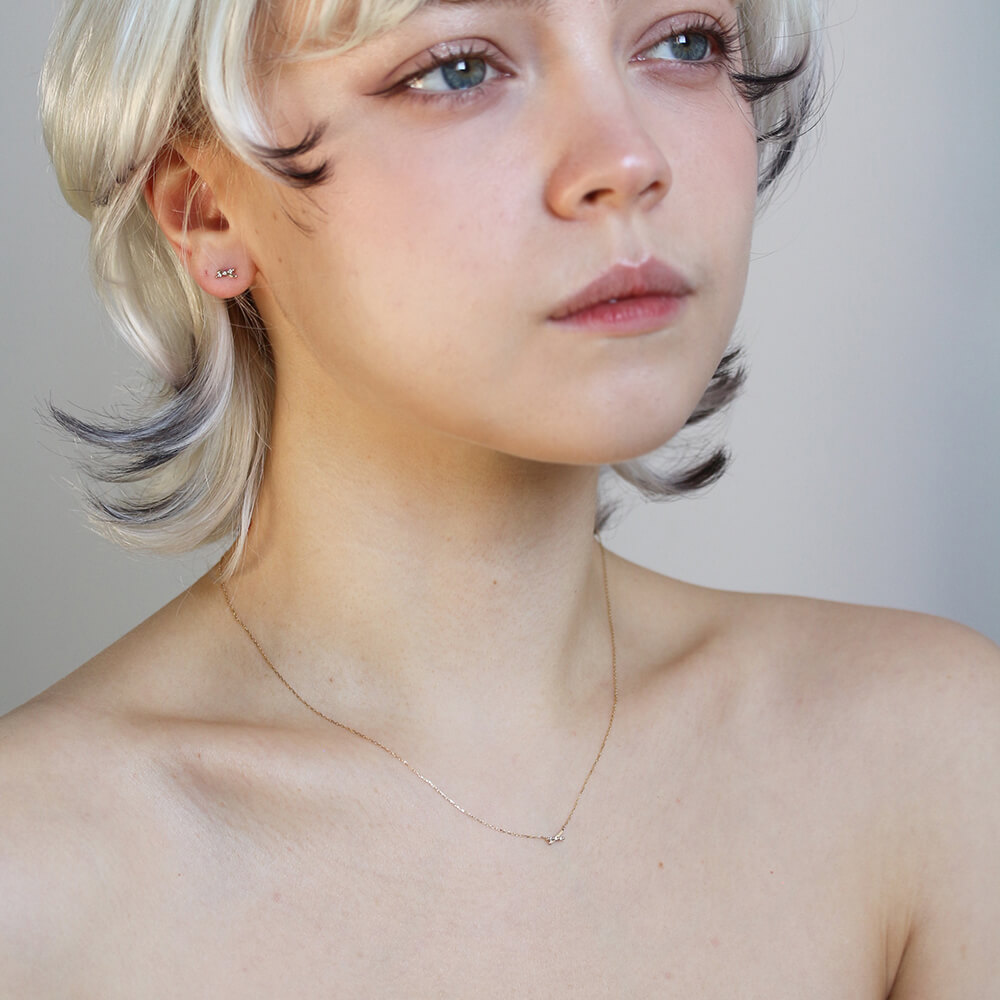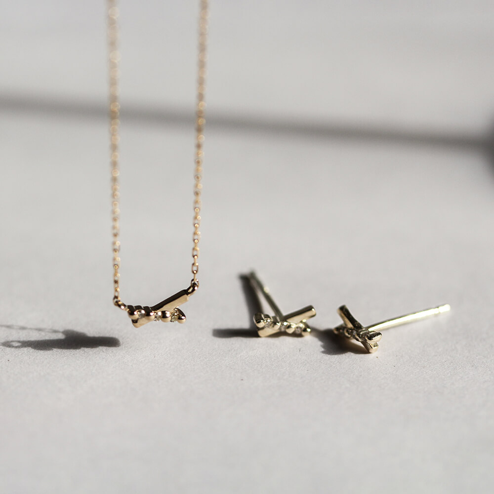 小さなモチーフデザインながらも、ダイヤモンドの輝きが知的な印象を自然に演出。