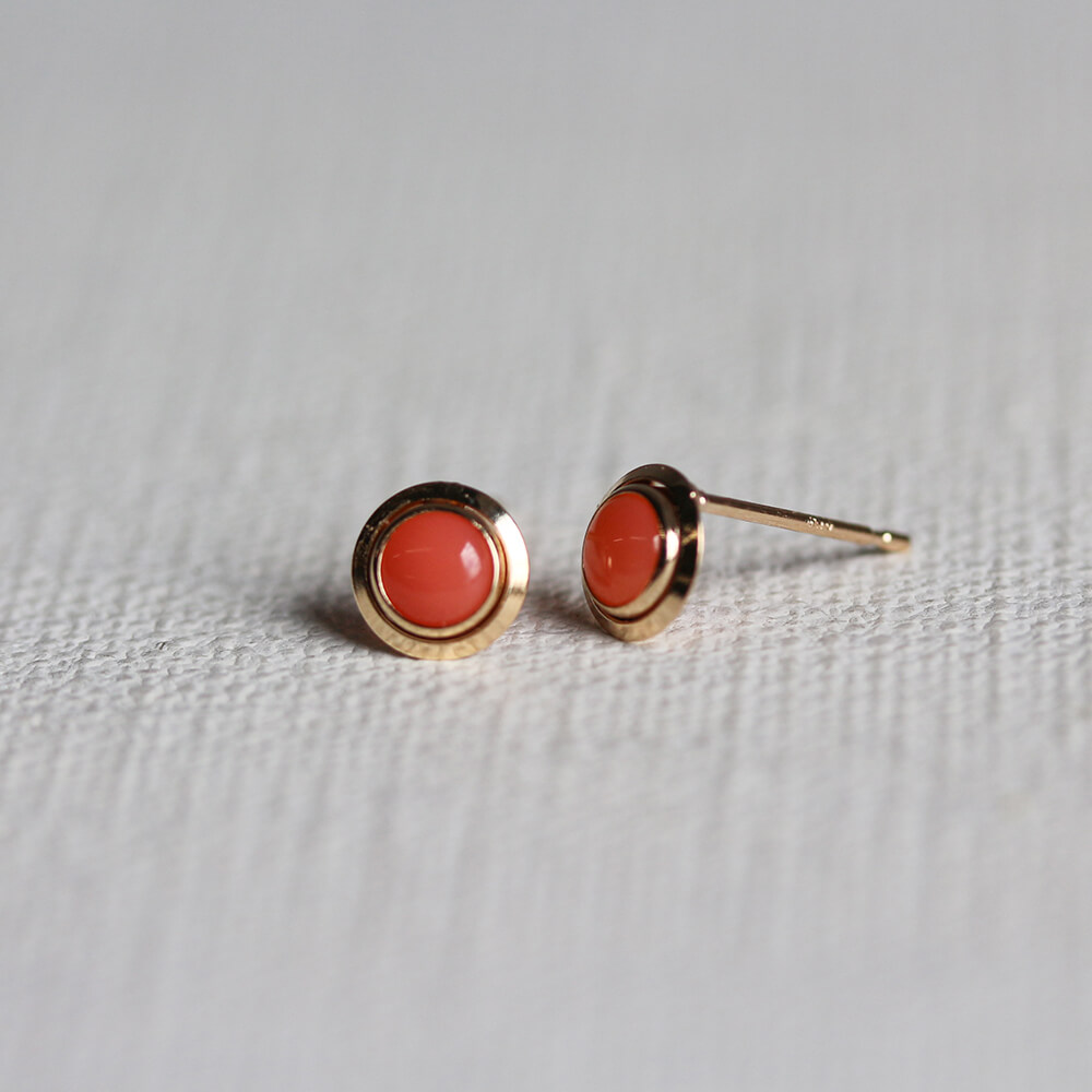 アンティークボタンを思わせるようなゴールドで縁取られたデザインは、ピンクサンゴのカラーを甘すぎずほんのり引き立ててくれます。