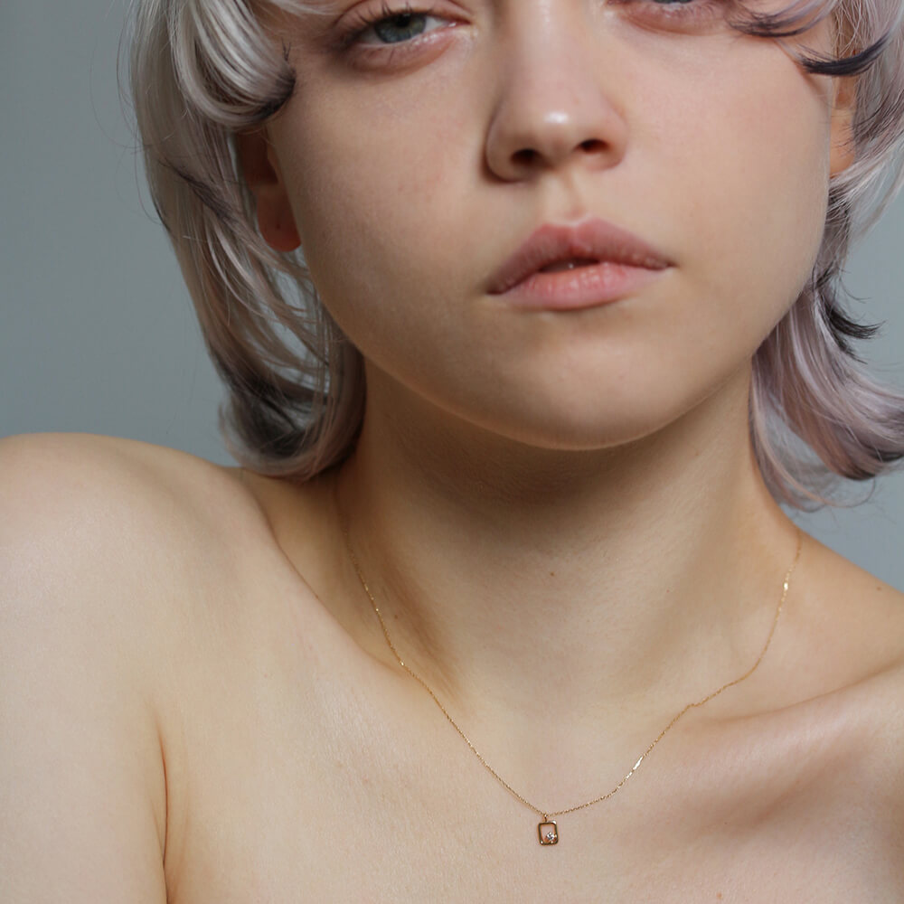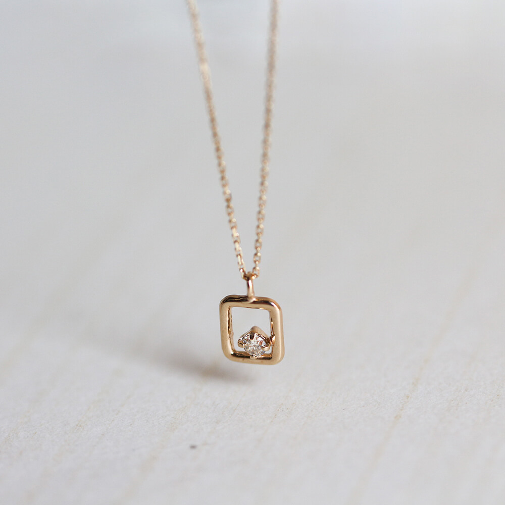 ゴールドのスクエアモチーフにダイヤが1石ついたネックレス。