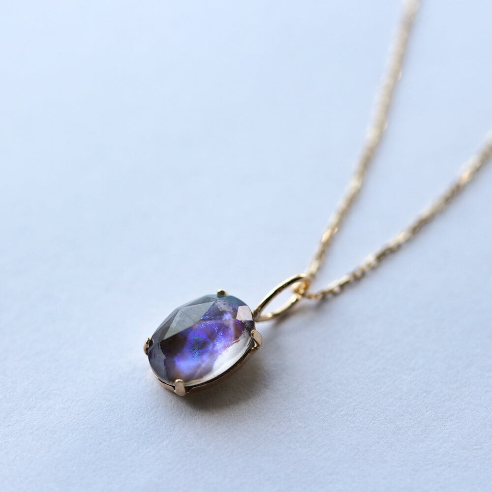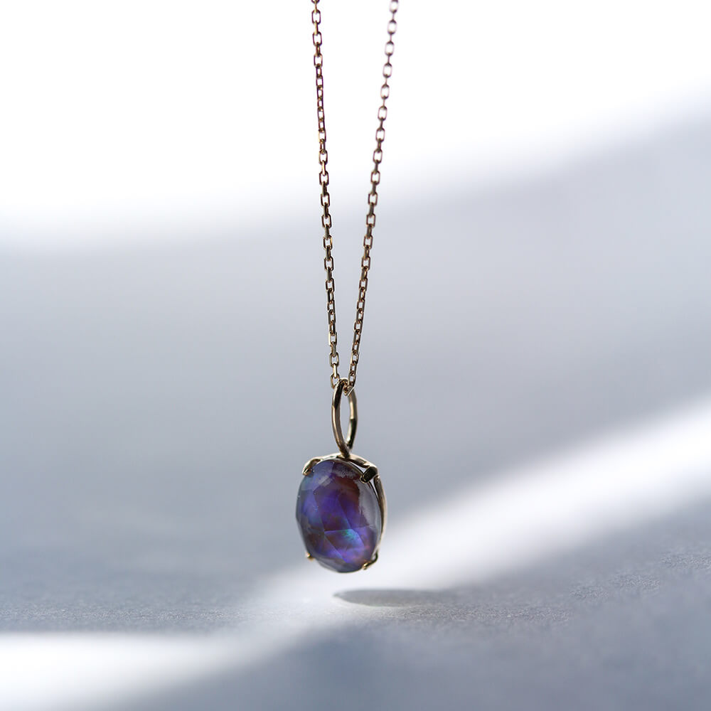 「プレイ・オブ・カラー(遊色効果)」この虹色の輝きは、シャボンの泡が見せる色と似ていますが、オパールの色彩はとても複雑。