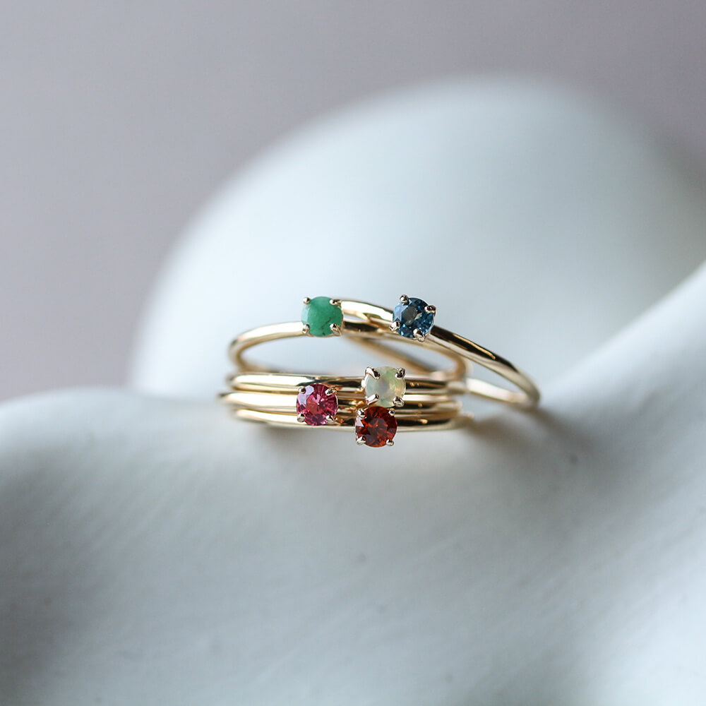 繊細で華奢なフレームに、ラウンドファセットカットのカラーストーンが引き立つデザイン。