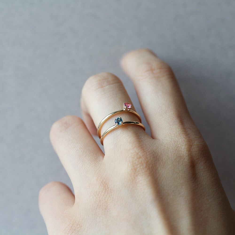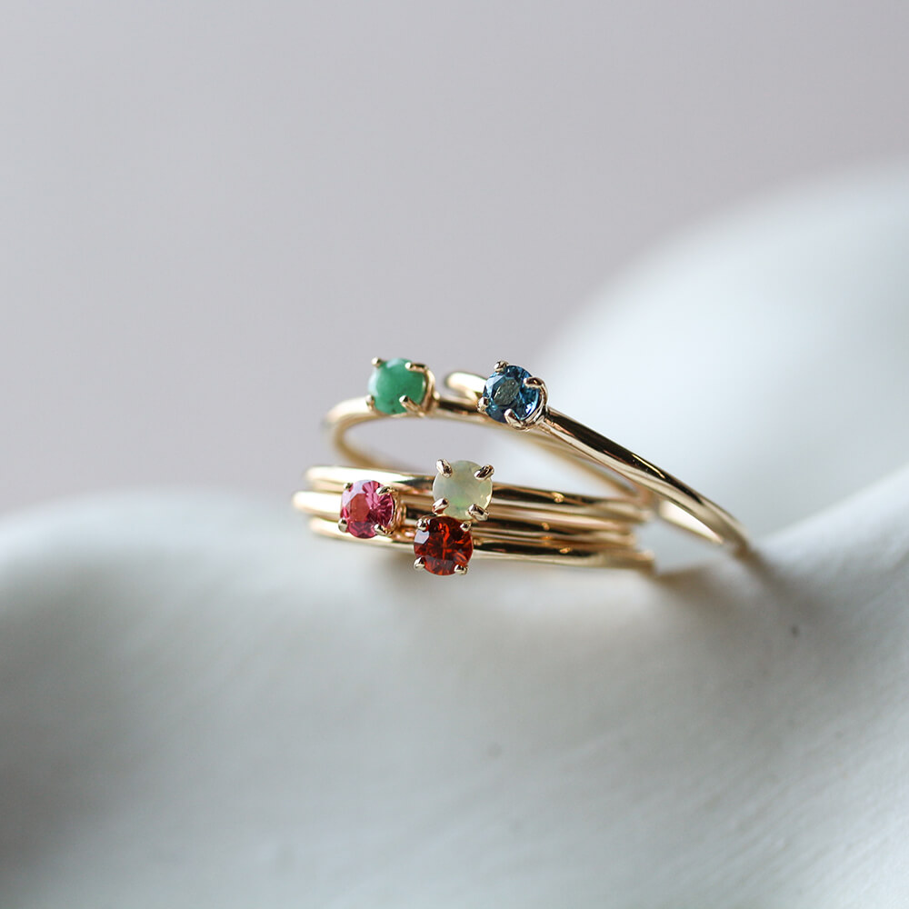 繊細で華奢なフレームに、ラウンドファセットカットのカラーストーンが引き立つデザイン。