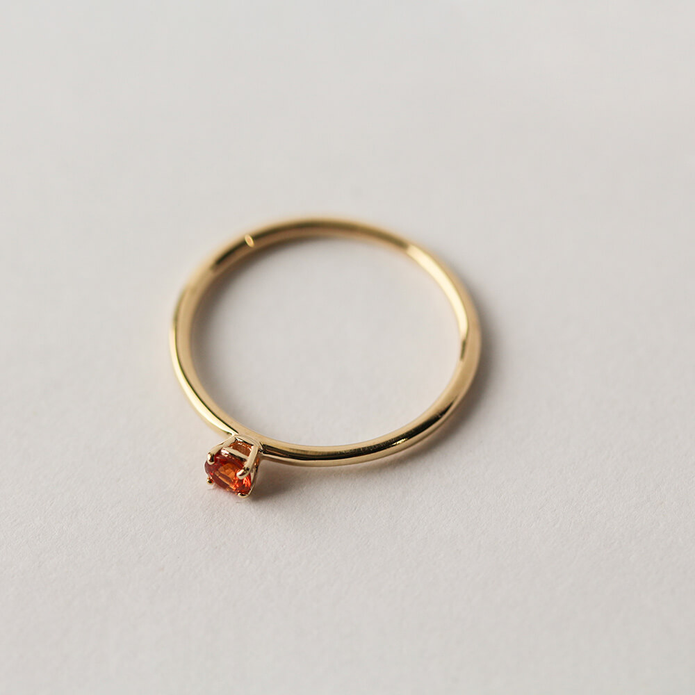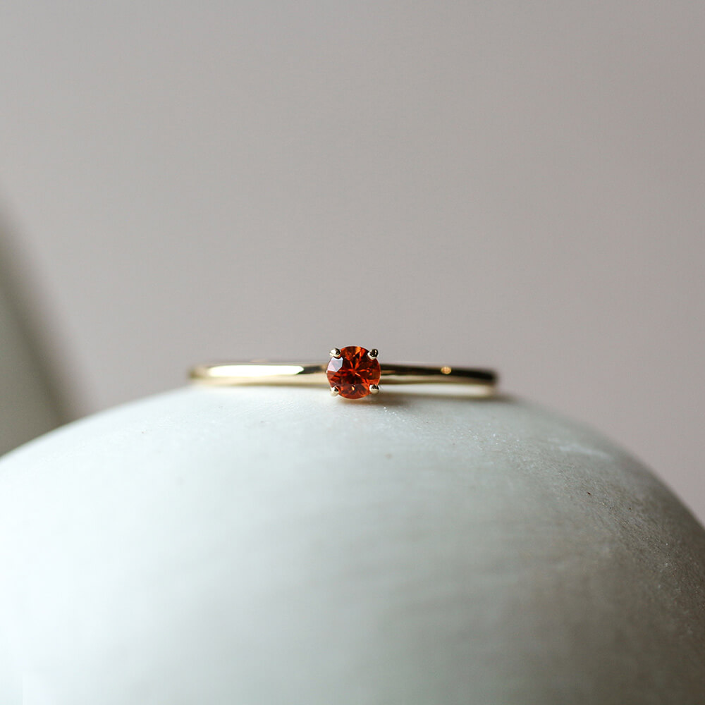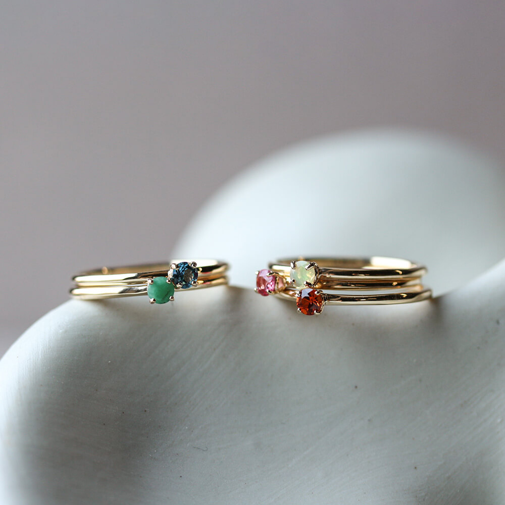 繊細で華奢なフレームに、ラウンドファセットカットのカラーストーンが引き立つデザイン。