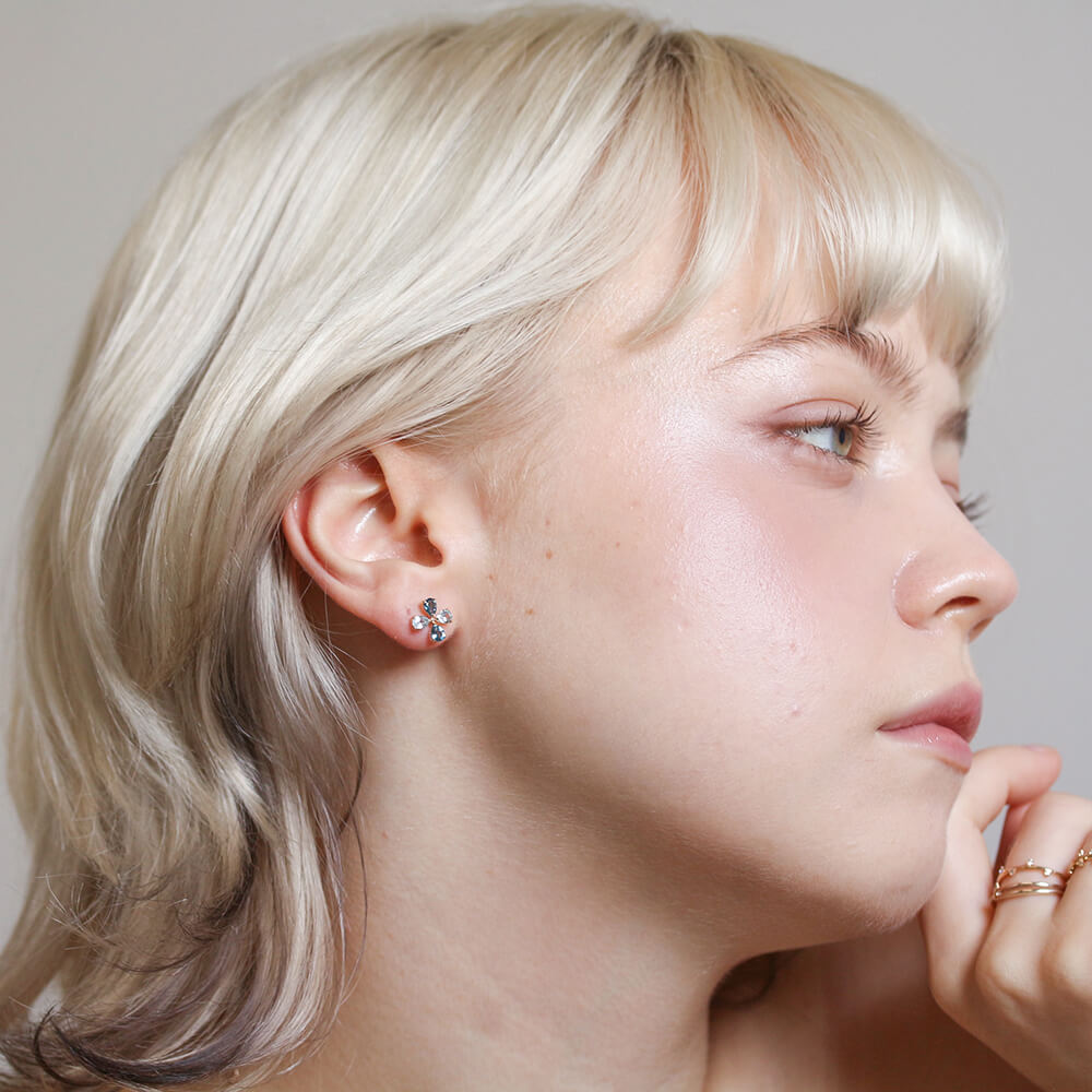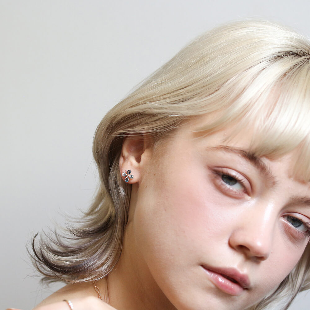 耳に乗せたフラワーが明るい輝きを見せ気分を上げてくれるアイテムに。