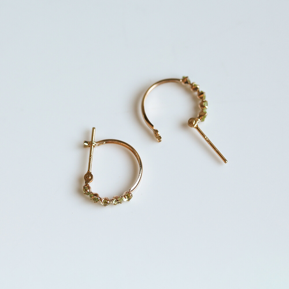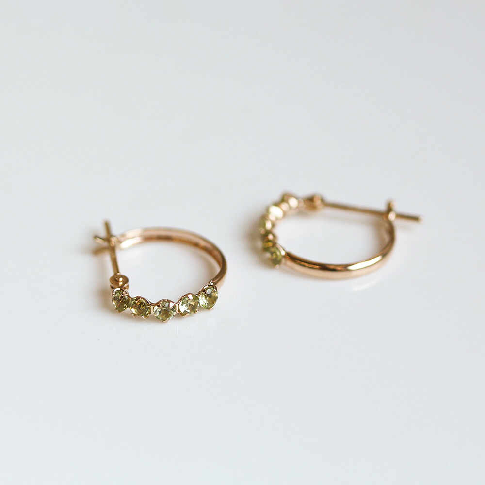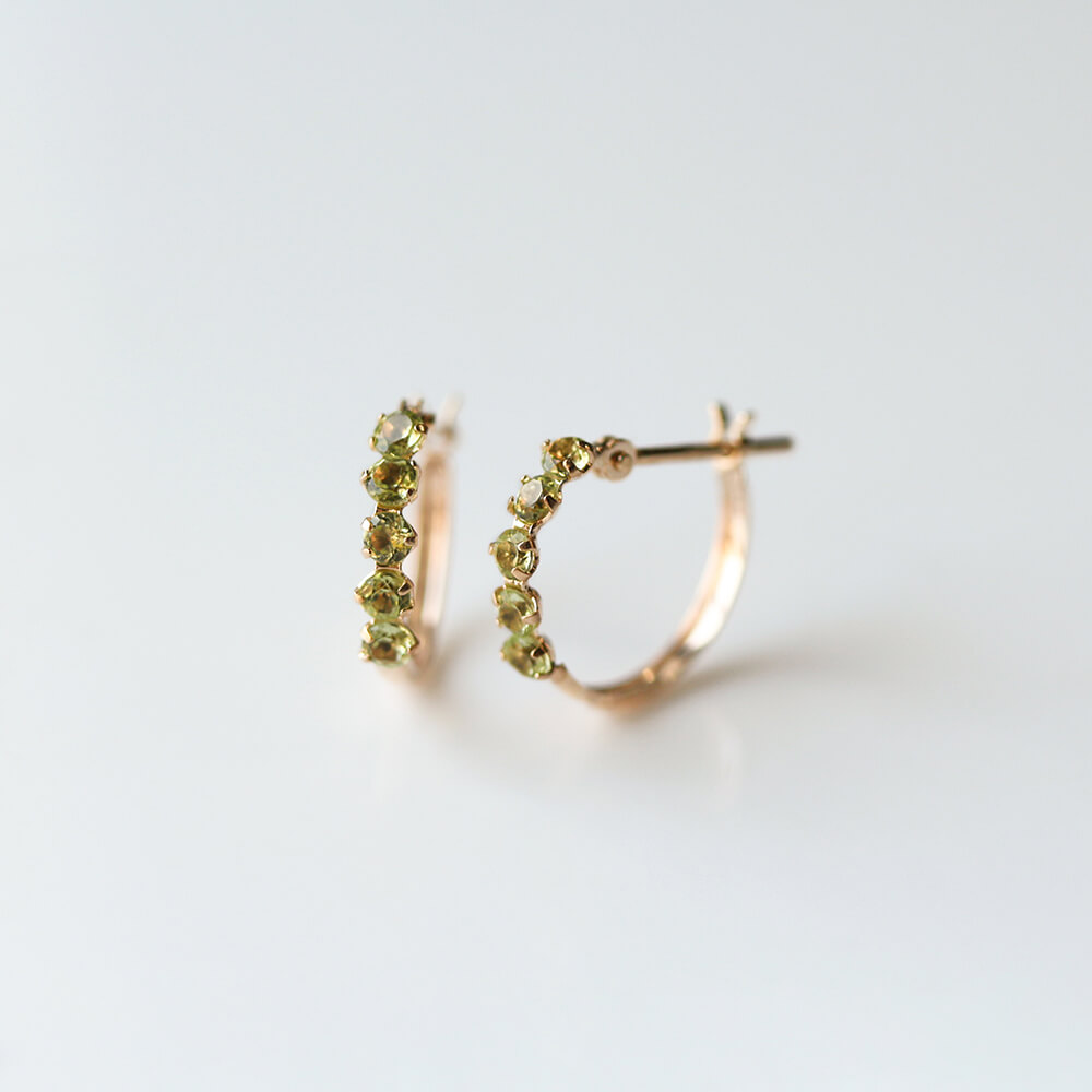 小さなペリドットを5石連ねたフープピアス。