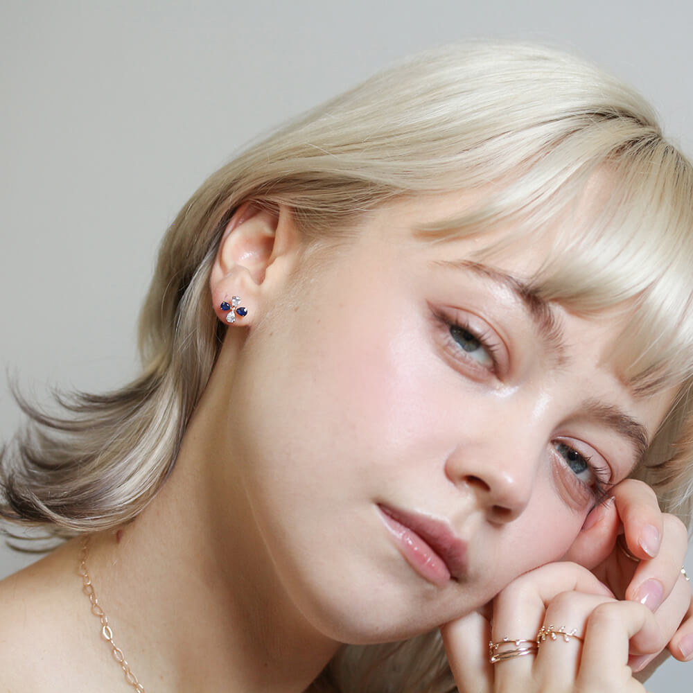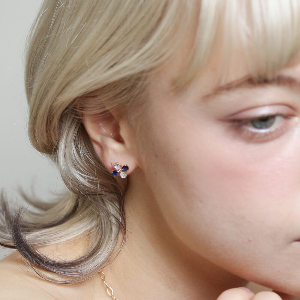 耳に乗せたフラワーが明るい輝きを見せ気分を上げてくれるアイテムに。