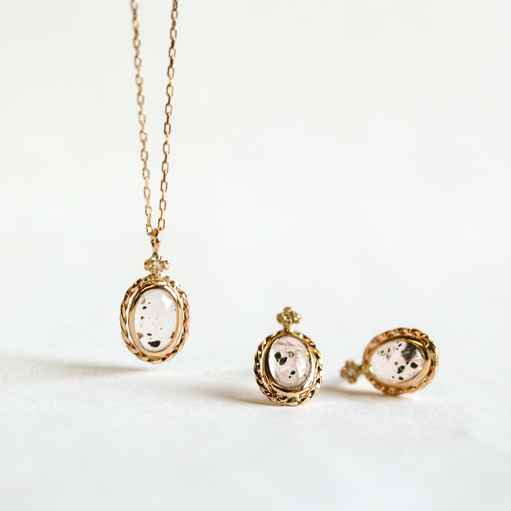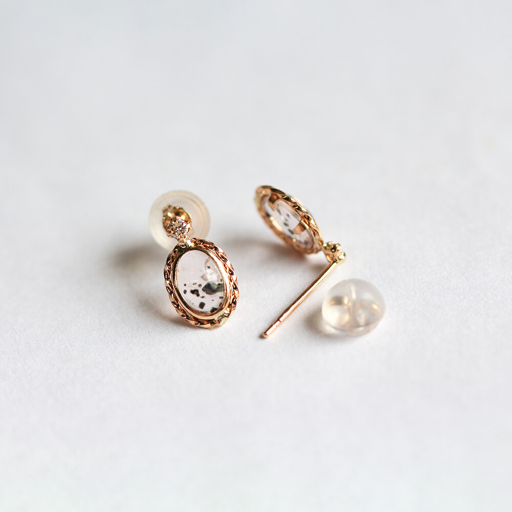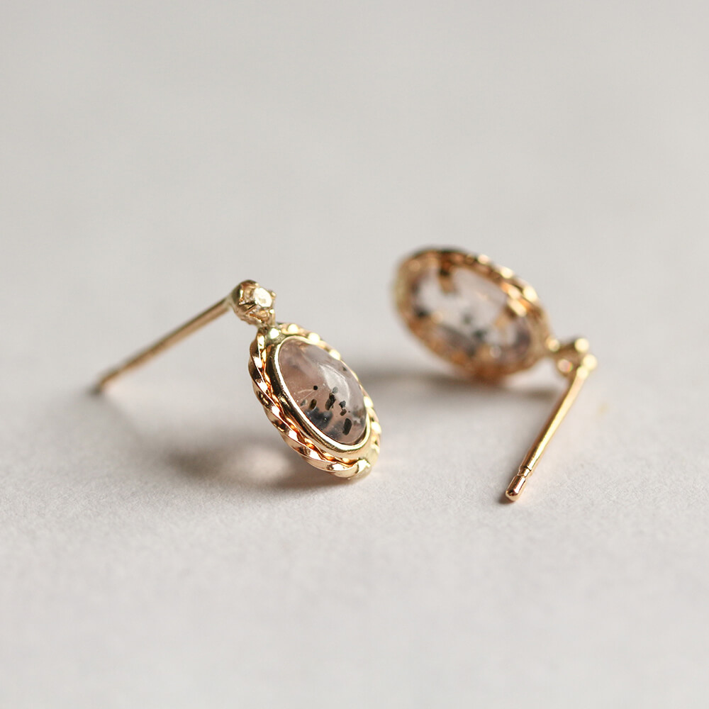 天然の内包物が作り出すドット模様が魅力的なピンククォーツピアス。