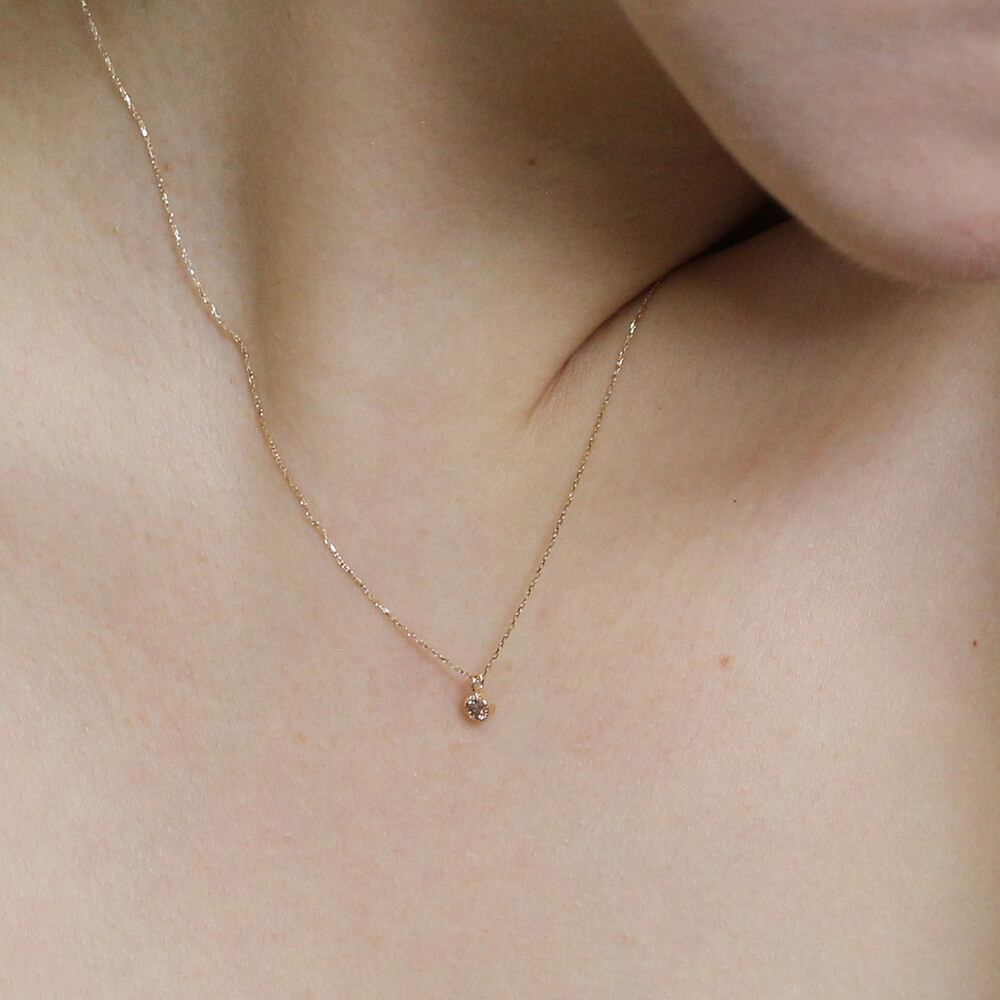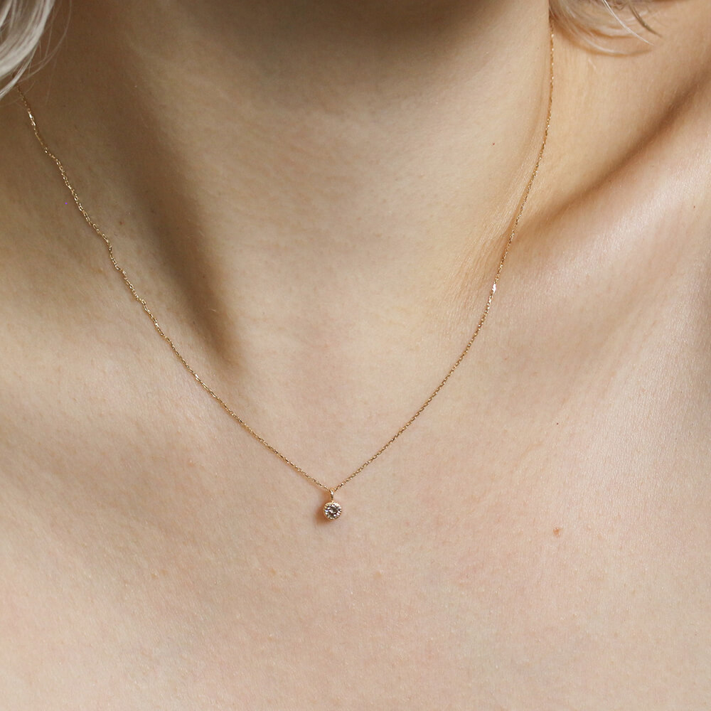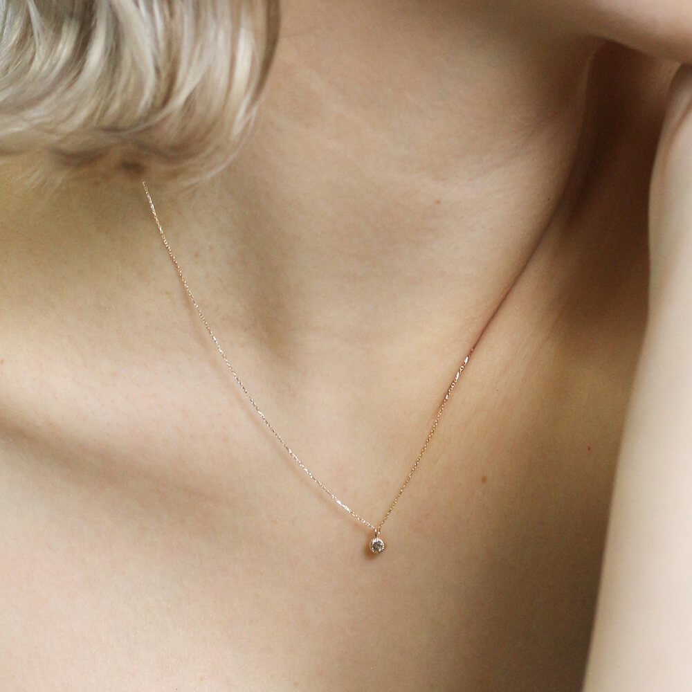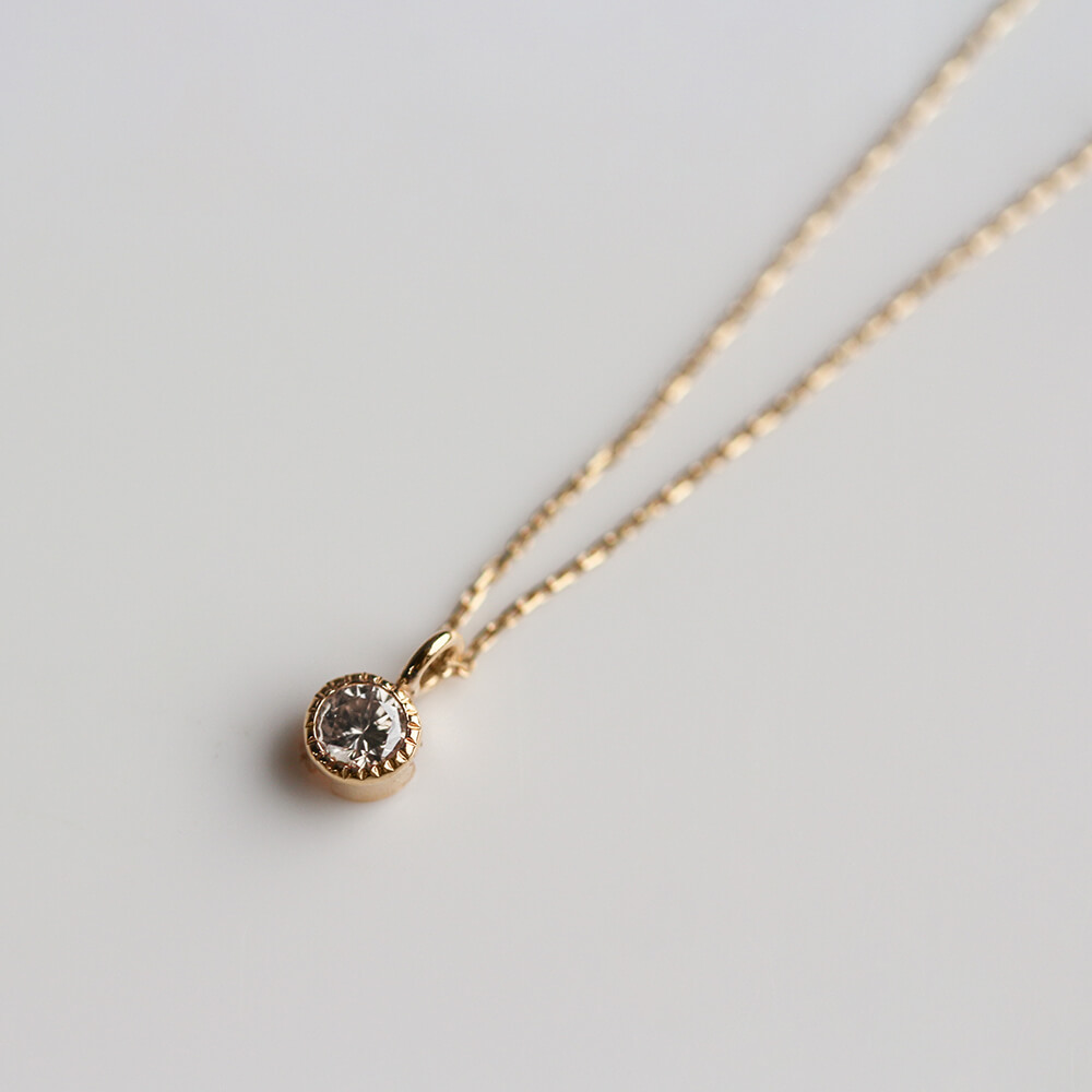 0.1ctのシャンパンダイヤモンドをシンプルにミルグレインの枠で留めたネックレス。