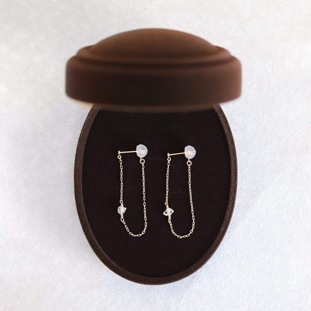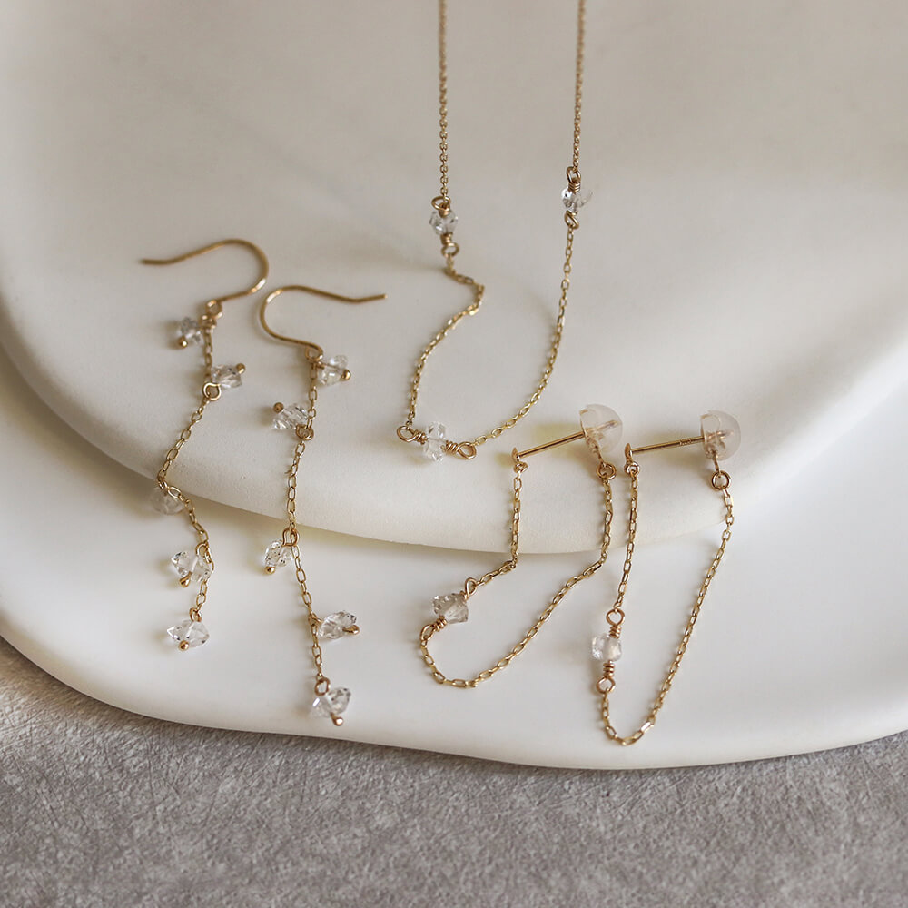 ハーキマーダイヤモンドが揺れるチェーンの中で輝きを見せるピアス。