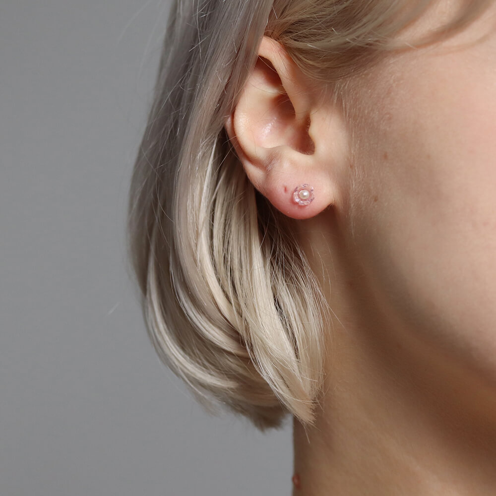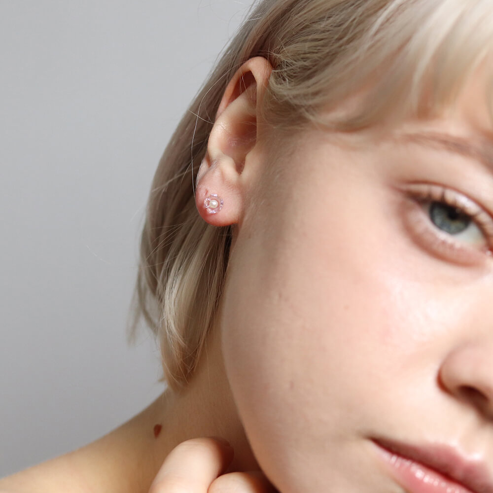 中央にあしらわれたパールが愛らしいフラワーピアス。