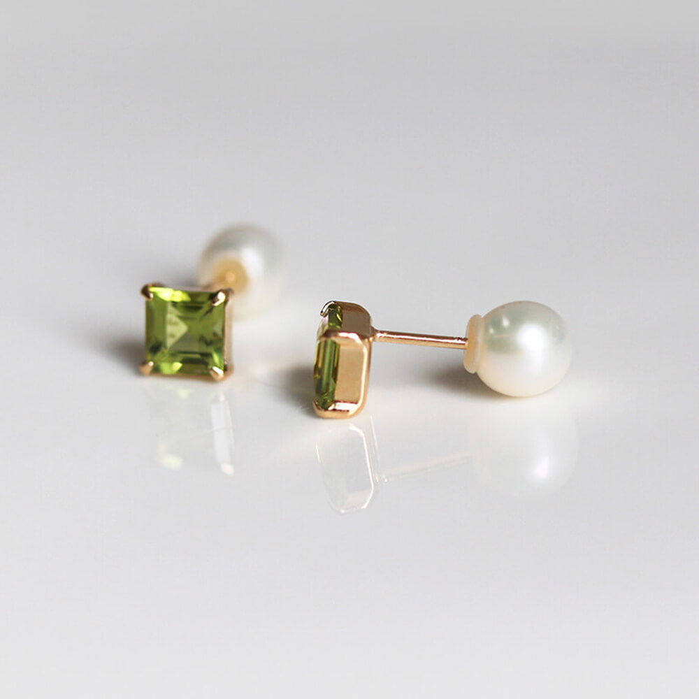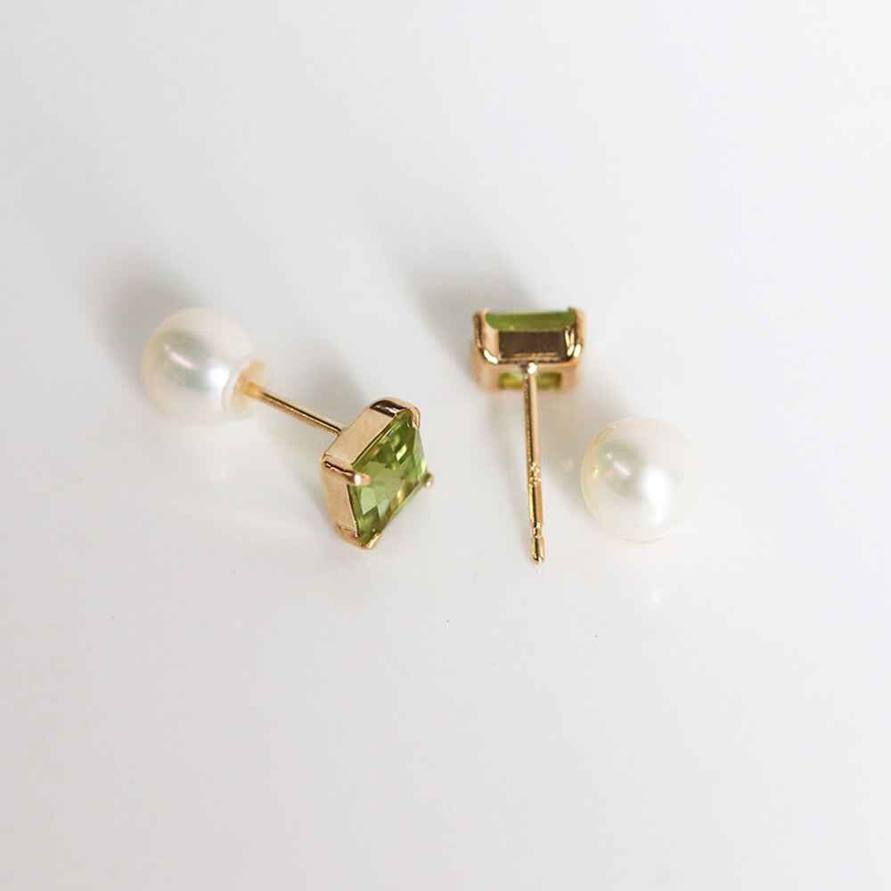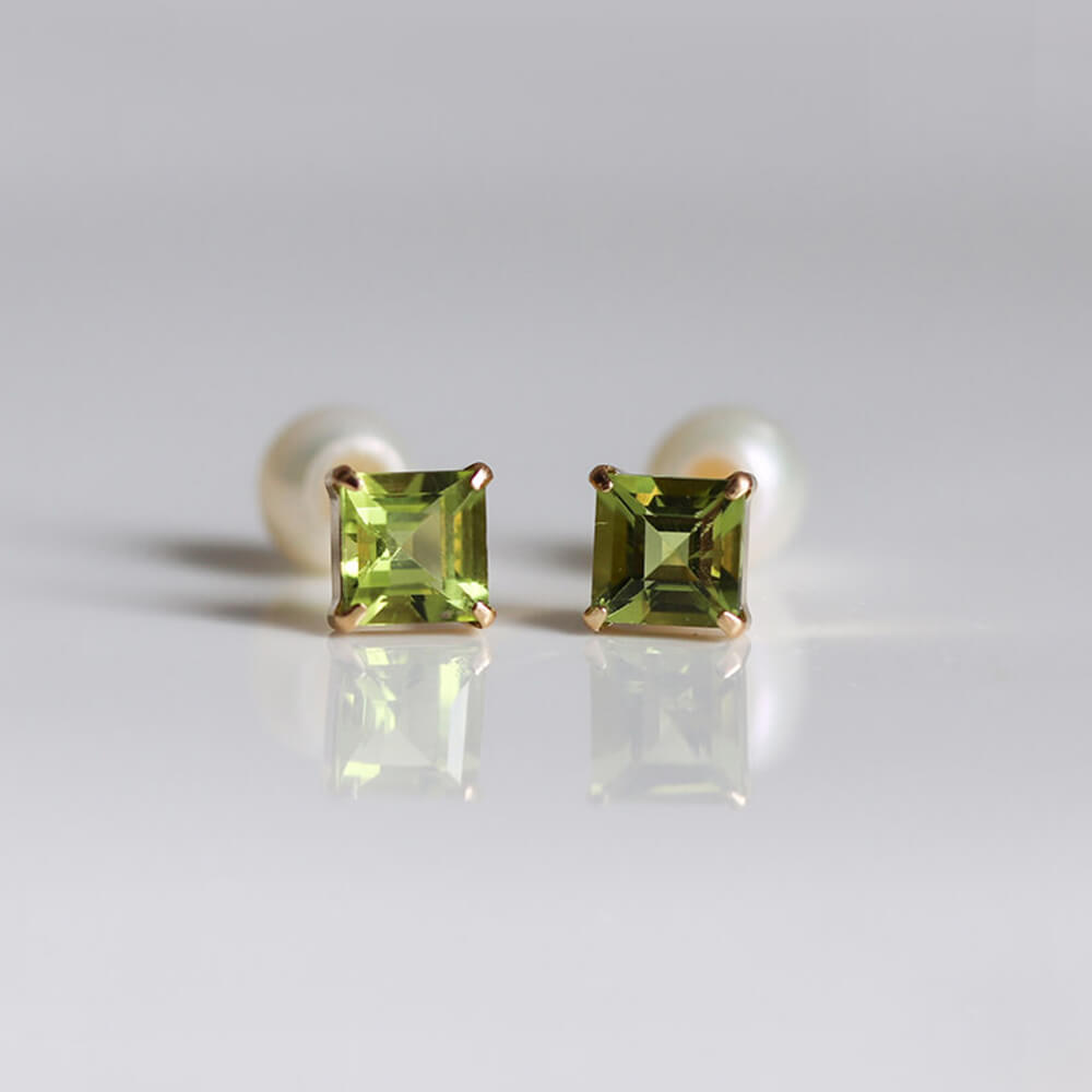 スクエアカットされたペリドットが耳元で爽やかな煌めきを見せてくれます。