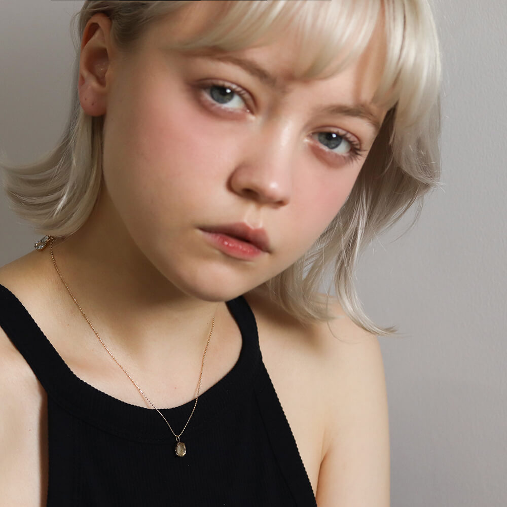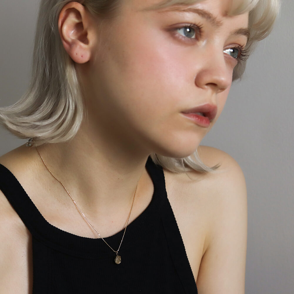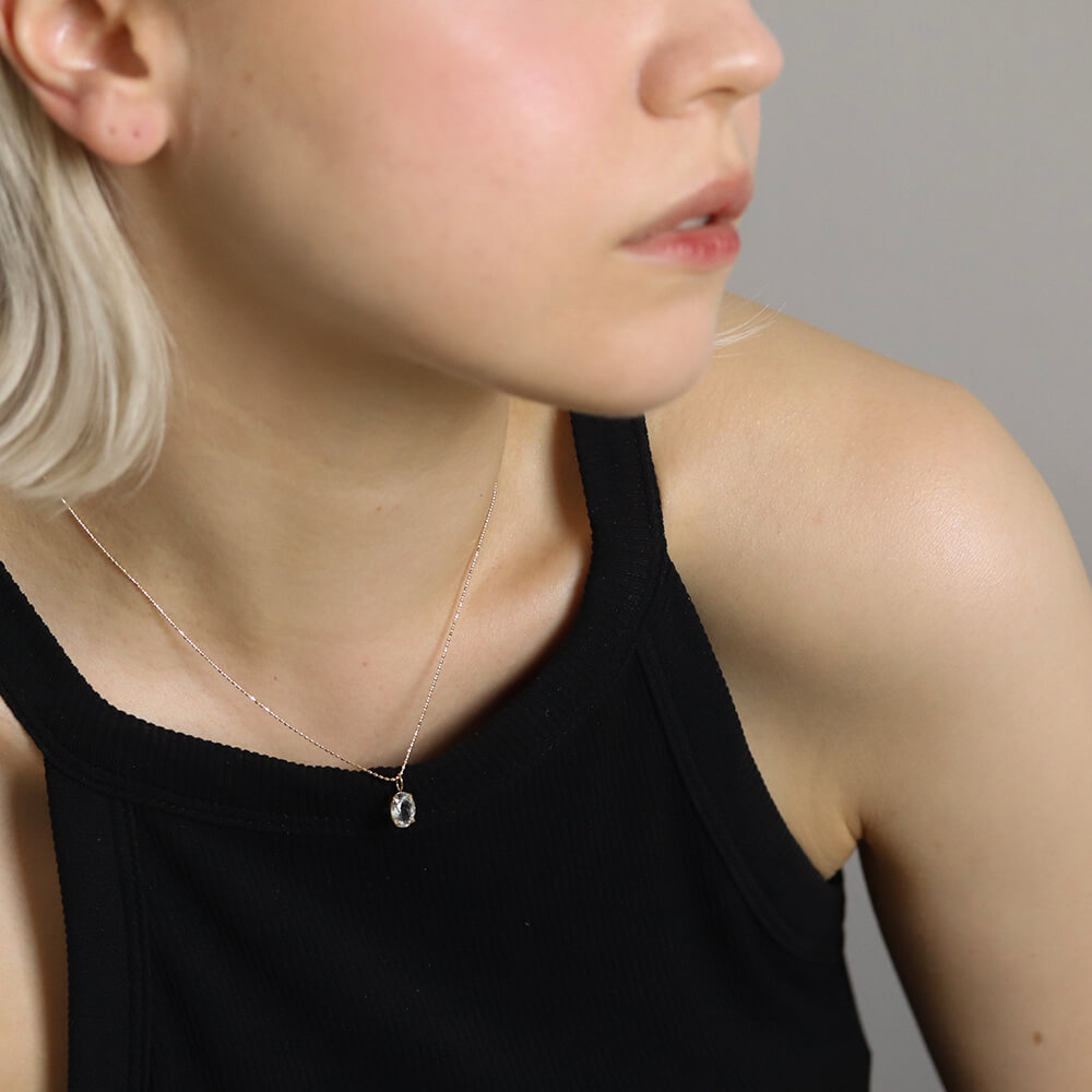 シンプルなチェーンネックレスに組み合わせるだけで、落ち着いた色味ながらも胸元にアクセントを加えられる天然石の輝き。